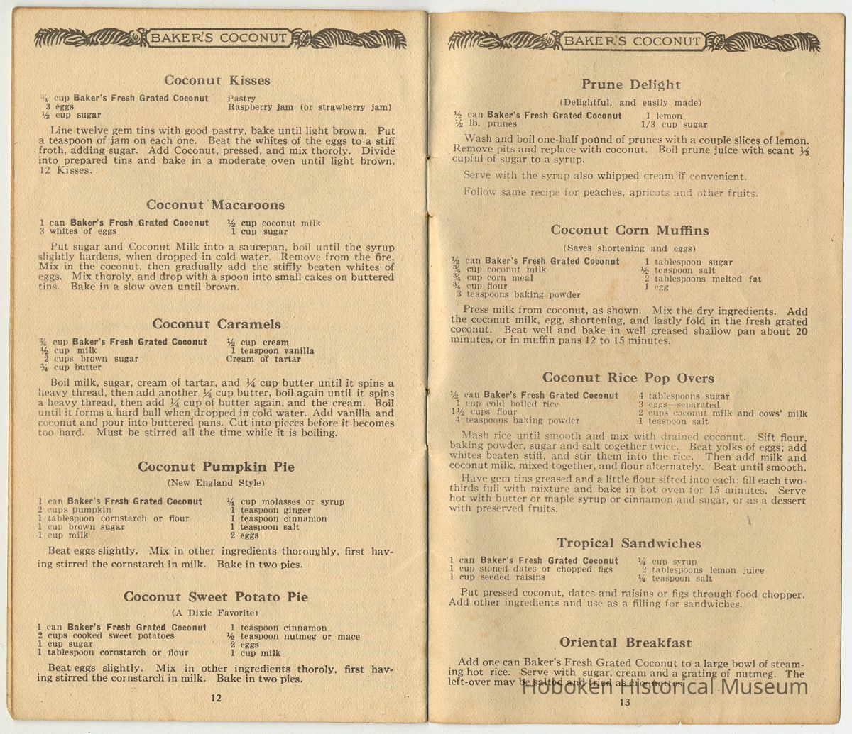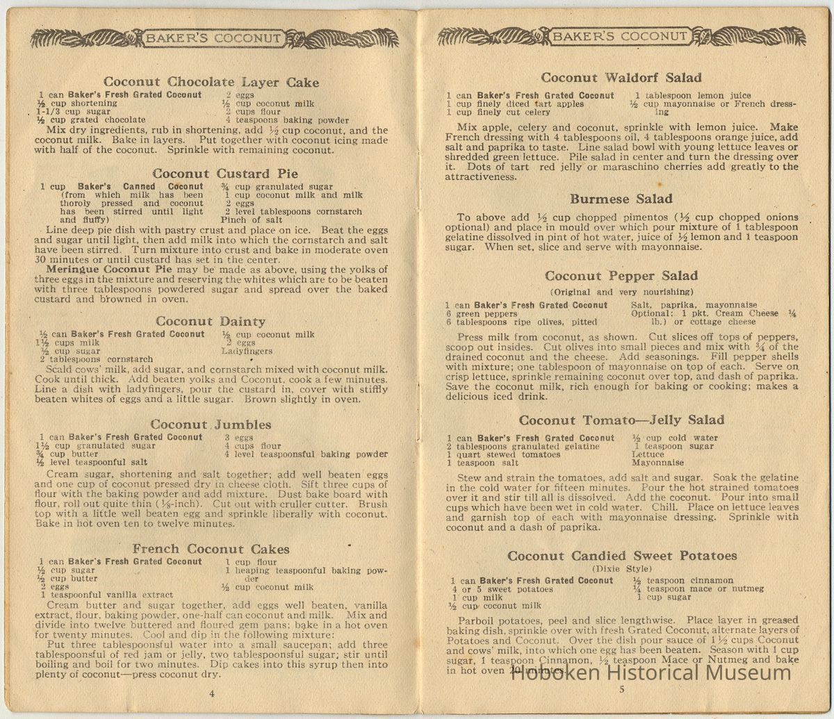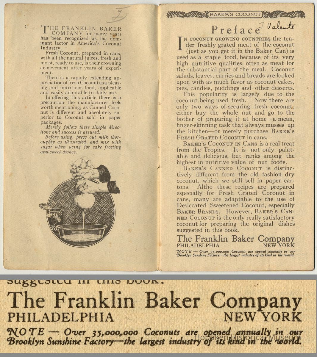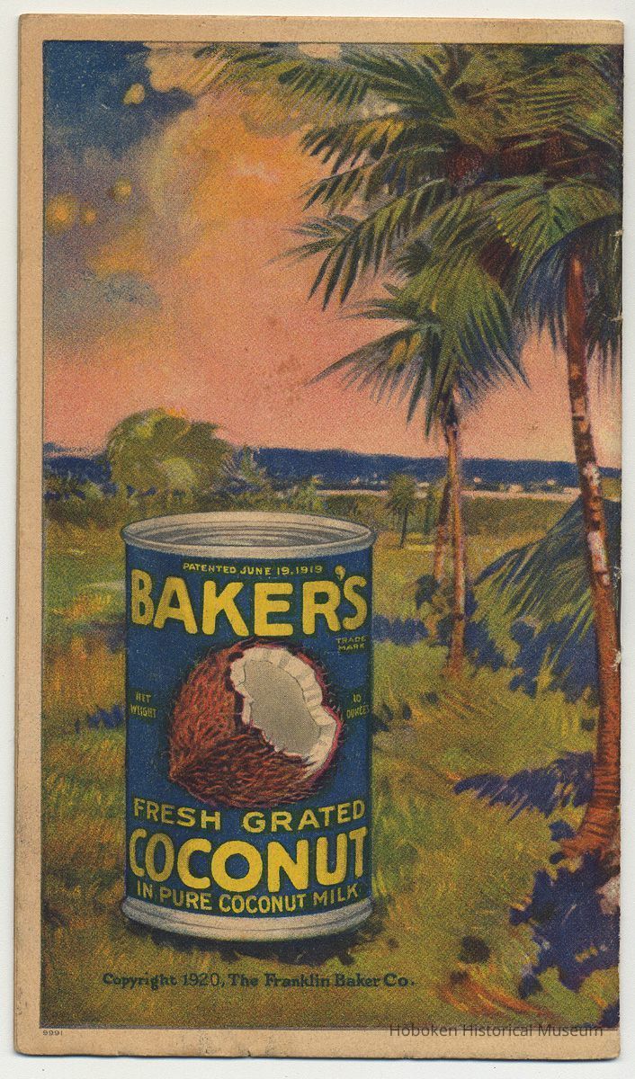 While not created by Franklin Baker in Hoboken, it is held as an example of how the company marketed its product prior to coming to Hoboken in 1924. It is useful to see the establishment of standard recipes for using coconut.