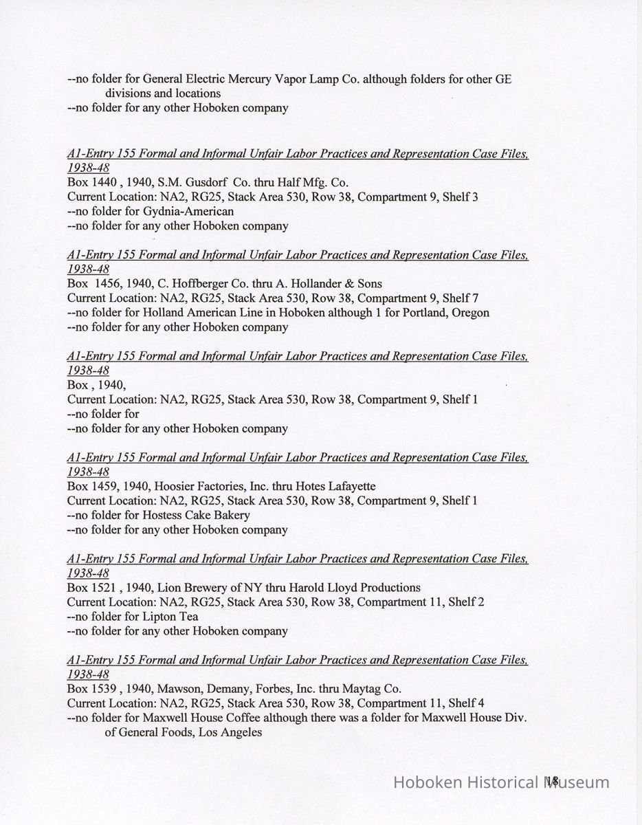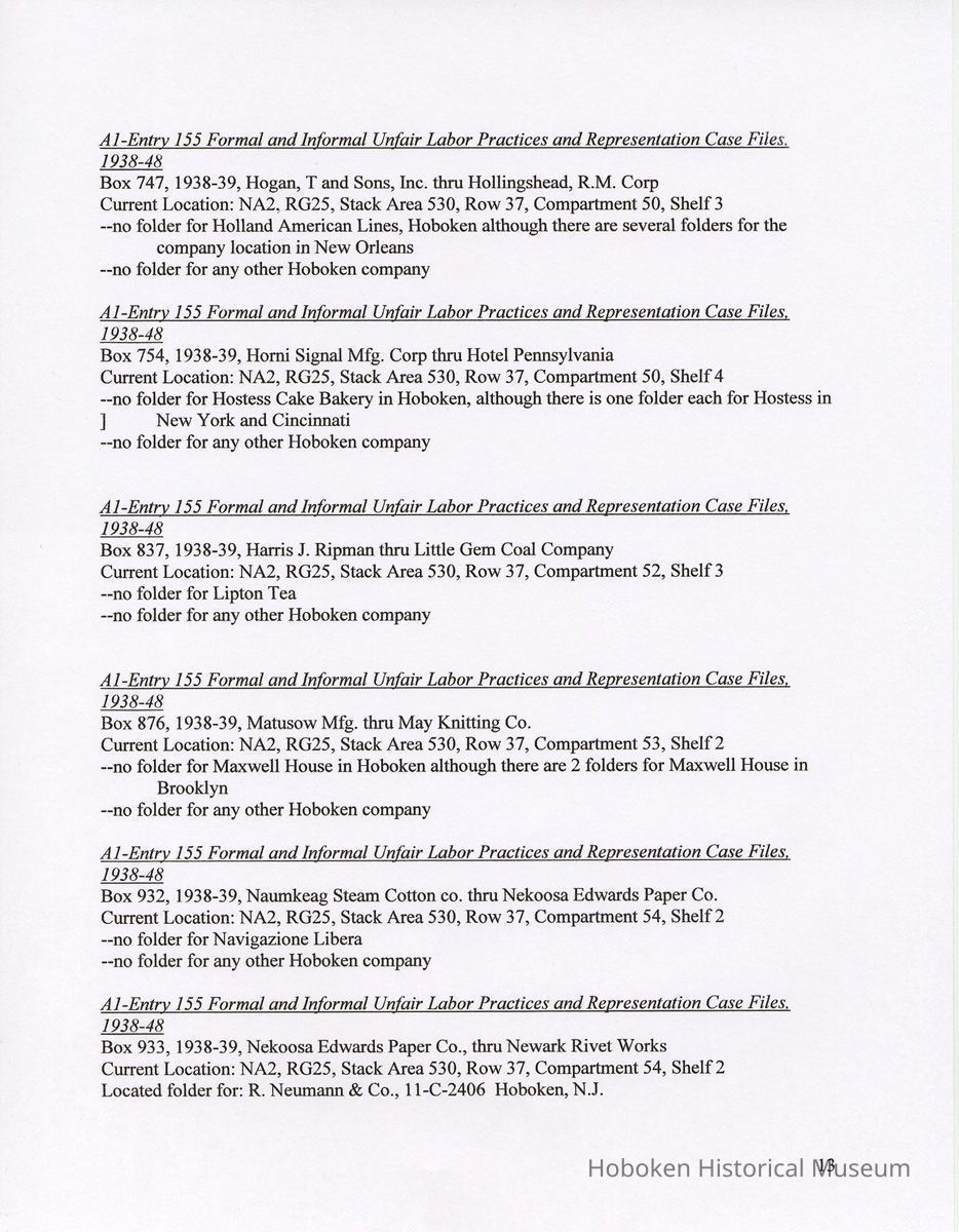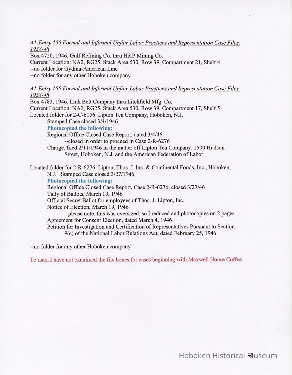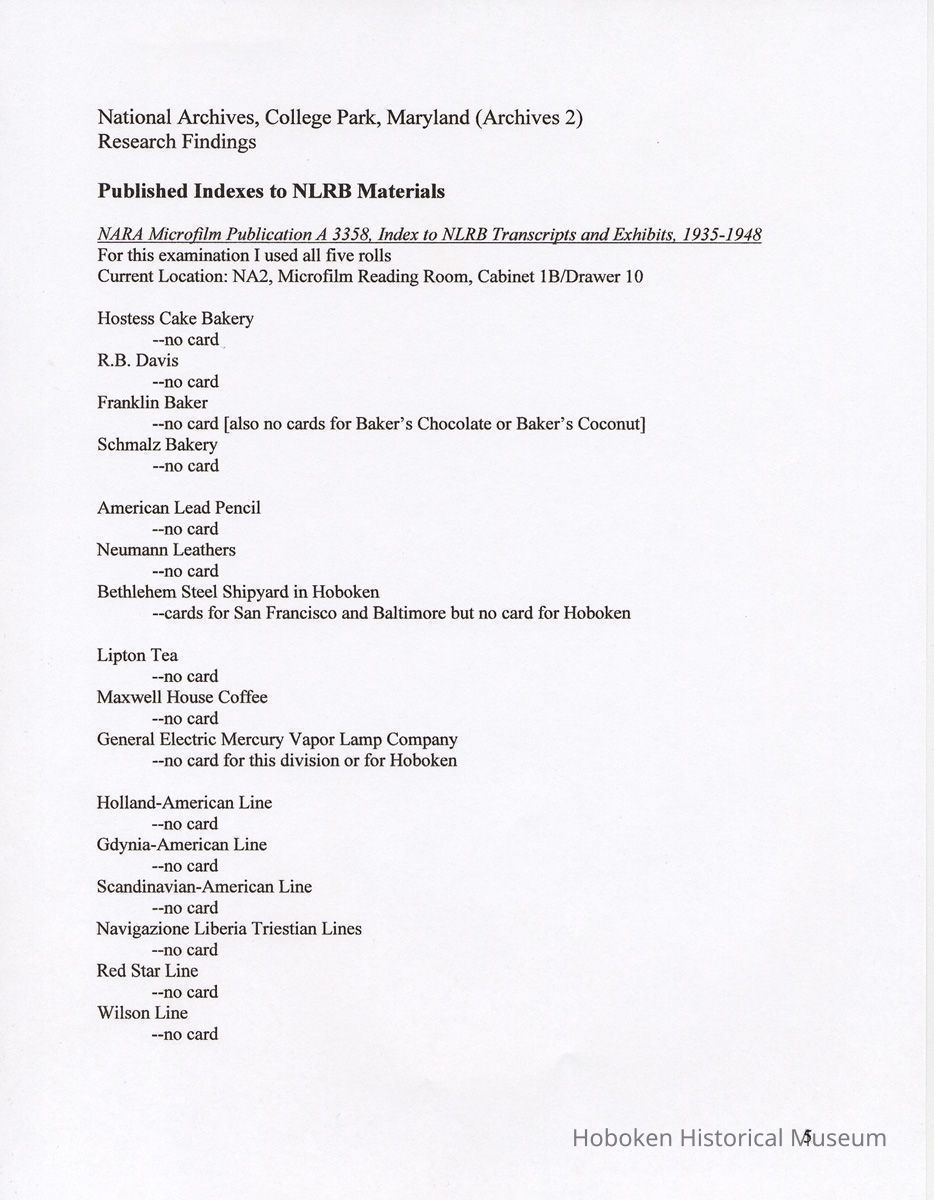 Notes: 2011.014.0002 Text of Report Peggy Ann Brown, Ph.D. 3000 OLD Dominion BLVD. ALEXANDRIA, VA 22305 703-820-1234 PeggyAnnBrown@verizon.net www.peggyannbrown.net January 7, 2011 Prepared for Holly Metz Research Report 2 Selected Hoboken, New Jersey Companies and National Labor Relations Board Report and Attachments Part 1 Table of Contents Report Summary Page 2 Research Findings Page 5 Published Indexes to NLRB Materials Page 5 A1 Entry 155 Formal and Informal Unfair Labor Practices and Representation Case Files Page 8 1935-1937 Page 8 1938-1939 Page 12 1940 Page 17 1941 Page 21 1942 Page 25 1943 Page 35 1944 Page 39 1946 Page 40 Recommendations for continuing and further research Page 44 Peggy Ann Brown, Ph.D. 3000 Old Dominion Blvd. Alexandria, VA 22305 703-820-1234 peqqyannbrown@verizon.net www.peqqyannbrown.net Research Report 2 [Part 1] Selected Hoboken, New Jersey Companies and National Labor Relations Board Report Summary Per your e-mail direction, I began looking for information on the Hoboken companies identified by you in the records of the National Labor Relations Board (Record Group 25, NLRB). I followed the same procedure identified in the research for the Sweets Company of America. I again had little success finding the companies in the microfilmed indexes. The exception was an entry for the Wilson Line. However, when I ordered the microfilm volumes for this folder, the staff lost the microfilm between the textual stacks (where they were stored) and the Microfilm Reading Room. I have been assured that the records were found once and should be available. To date, I did not have time to pursue this search. I began going through A1 Entry 155 Formal and Informal Unfair Labor Practices and Representation Case Files for the 16 new companies listed in your email, plus Todd Dry Dock. Although this is a straightforward process for 1936-1946 when the files were arranged by year, and thereafter chronologically, the magnitude of ordering the boxes within Archives pull time and box limit constraints (combined with time for photocopying), proved too much for me to complete by your original deadline of January 7. I stand ready to complete these searches at your direction and apologize for not being able to get through all the materials. As you will see from the research findings, there was sometimes more than one folder with the same case number; some materials in these were duplicates but some were not. I tried going backwards, beginning with 1946 to see if I could speed up the process but found this made little difference. I have included the inclusive company names for the individual boxes so that you can search for any other companies that might be of interest and can assume that there are no folders for that company in the specific box as I searched for other Hoboken companies in all ordered boxes. I have kept the materials in the order in which they appeared in the folder; for the most part this means folders are in reverse chronological order. Please note that the Bethlehem Steel and Todd Dry Dock materials often contain information on both the New York and Hoboken yards. Apparently their cases were investigated and pursued both individually and together. To date, I have located files on the following companies: 1935-37 Case No. II-R-49 Davis, (R.B.) Baking Powder, Hoboken, New Jersey Case No. II-C-320 R. Neumann & Co., Hoboken, N.J. 1938-39 Case No. 1 l-C-2406 R. Neumann & Co., Hoboken, N.J. Case No. 11 -C-2532 R. Neumann & Co., Hoboken, N.J. 1940 Case No. ll-C-2785 R. Neumann & Co., Hoboken, N.J 1941 Case No. II-C-4011 Lipton, Thomas J. & Continental Foods, Inc., Hoboken, New Jersey Case No. II-R-2633 Lipton, Thos. J. Inc., & Continental Foods, Inc., Hoboken, New Jersey 1942 Case No. II-R-3026 Bethlehem Steel Co., Hoboken, New Jersey Case No. R-3540 Bethlehem Steel Co. (Shipbuilding Div.), Hoboken, New Jersey 1943 Case No. R-237 Todd Shipyards & Robins Drydock & Repair Co., Hoboken, New Jersey Case No. 2-R-4190 Bethlehem Steel Company, Shipbldg. Div., Hoboken Yard, Hoboken, New Jersey Case No. II-R-3553 Bethlehem Steel Co., Hoboken, New Jersey Case No. 2-R-4079 Bethlehem Steel Company, Hoboken, New Jersey Case No. 2-R-4172 Bethlehem Steel Company, Hoboken, New Jersey Case No. 2-R-4293 Bethlehem Steel Company, Hoboken, New Jersey Case No. R-5798 Bethlehem Steel Company, Hoboken, New Jersey Case No. 2-R-3905 Hoboken Land and Improvement Co., Hoboken, New Jersey Case No. R-5667 Todd-Dry Dock-Corp., Hoboken, New Jersey Case No. R-5668 Todd Dry Dock Corp., Hoboken, New Jersey 1944 [did not complete going through these files as of January 7] Case No. 2-C-5308 Bethlehem Steel, Hoboken, New Jersey Case No. 2-R-4453 Bethlehem Steel Co. Shipbuilding Div. Hoboken Yard, ken, New Jersey 1945 [have not yet looked through the 1945 files as of January 7] 1946 [did not complete going through the 1946 files as of January 7] Case No. 2-C-6124 Bethlehem Steel Company, Hoboken, New Jersey Case No. 2-R-6912 Franklin, A.W. Mfg. Corp., Hoboken, New Jersey Case No. 2-C-5888 General Electric Co., Hoboken, New Jersey Case No. 2-R-5833 General Electric Co. Lamp Dept. Hoboken Works, Hoboken New Jersey Case No. 2-R-7244 General Foods Corporation—Franklin Baker Division, Hoboken, New Jersey Case No. 2-C-6156 Lipton Tea Company, Hoboken, New Jersey Case No. 2-R-6276 Lipton, Thos. J. Inc. & Continental Foods, Inc., Hoboken, New Jersey The following pages detail the information presented in the above summary. National Archives, College Park, Maryland (Archives 2) Research Findings Published Indexes to NLRB Materials NARA Microfilm Publication A 3358, Index to NLRB Transcripts and Exhibits, 1935-1948 For this examination I used all five rolls Current Location: NA2, Microfilm Reading Room, Cabinet IB / Drawer 10 Hostess Cake Bakery —no card R.B. Davis —no card Franklin Baker —no card [also no cards for Baker's Chocolate or Baker's Coconut] Schmalz Bakery —no card American Lead Pencil —no card Neumann