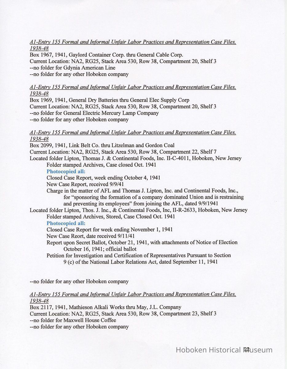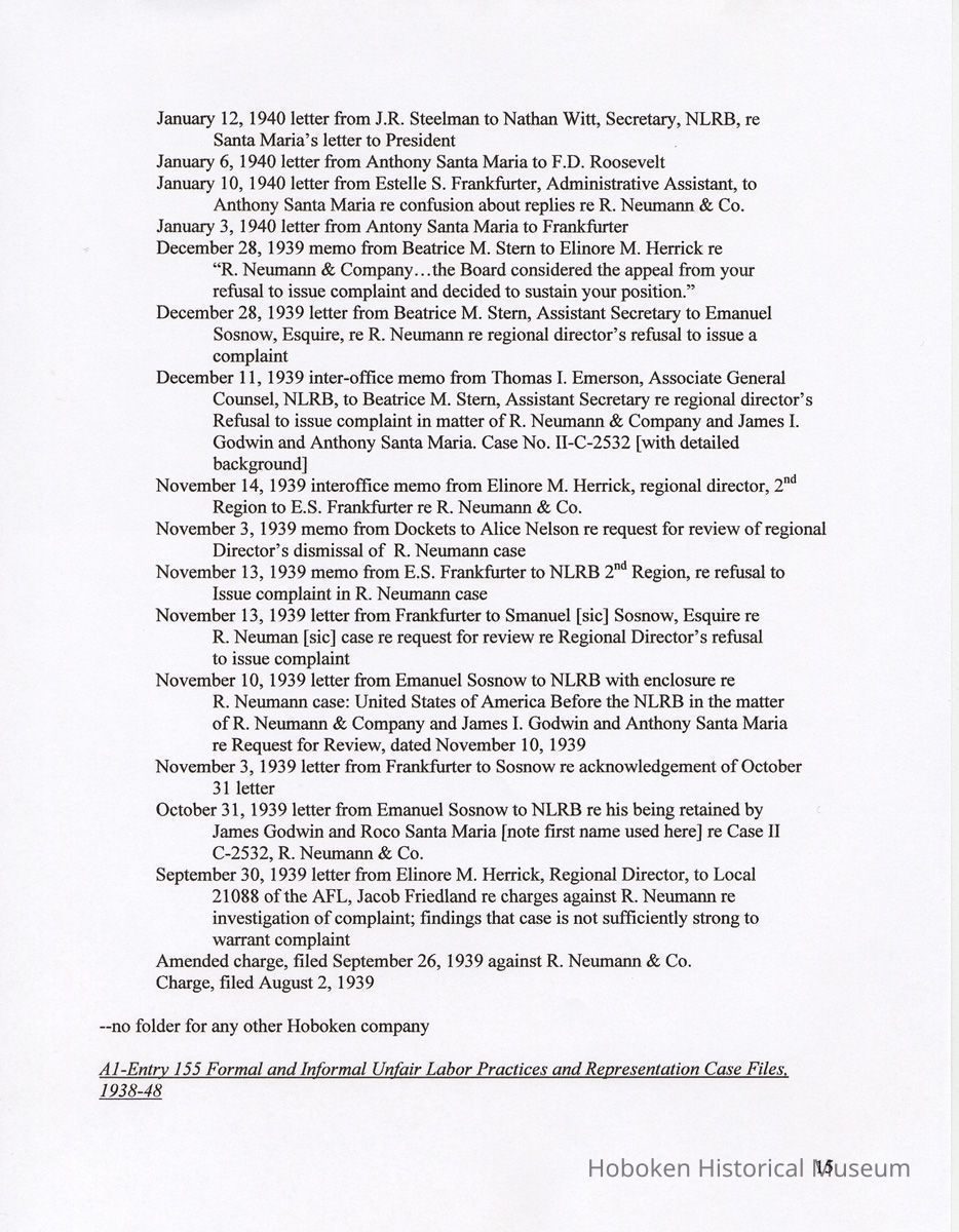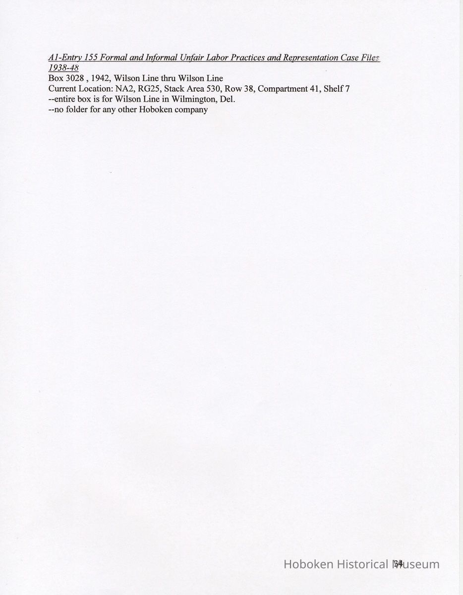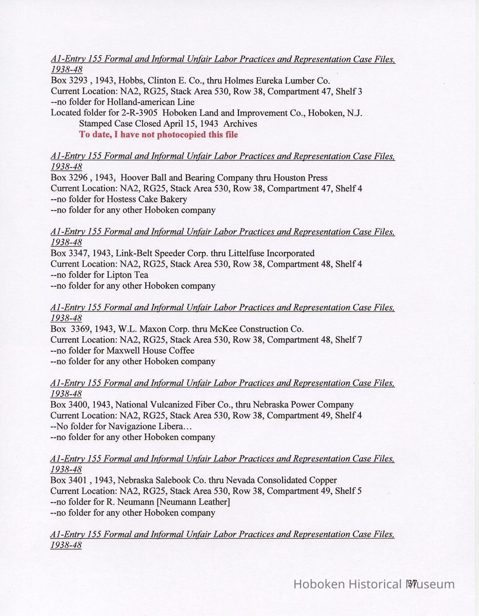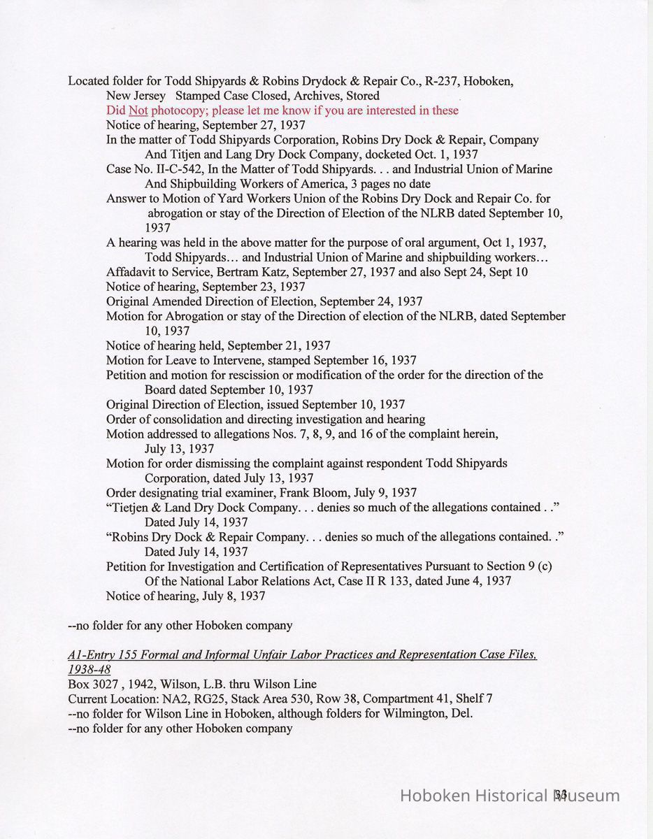 Notes: 2011.014.0002 Text of Report Peggy Ann Brown, Ph.D. 3000 OLD Dominion BLVD. ALEXANDRIA, VA 22305 703-820-1234 PeggyAnnBrown@verizon.net www.peggyannbrown.net January 7, 2011 Prepared for Holly Metz Research Report 2 Selected Hoboken, New Jersey Companies and National Labor Relations Board Report and Attachments Part 1 Table of Contents Report Summary Page 2 Research Findings Page 5 Published Indexes to NLRB Materials Page 5 A1 Entry 155 Formal and Informal Unfair Labor Practices and Representation Case Files Page 8 1935-1937 Page 8 1938-1939 Page 12 1940 Page 17 1941 Page 21 1942 Page 25 1943 Page 35 1944 Page 39 1946 Page 40 Recommendations for continuing and further research Page 44 Peggy Ann Brown, Ph.D. 3000 Old Dominion Blvd. Alexandria, VA 22305 703-820-1234 peqqyannbrown@verizon.net www.peqqyannbrown.net Research Report 2 [Part 1] Selected Hoboken, New Jersey Companies and National Labor Relations Board Report Summary Per your e-mail direction, I began looking for information on the Hoboken companies identified by you in the records of the National Labor Relations Board (Record Group 25, NLRB). I followed the same procedure identified in the research for the Sweets Company of America. I again had little success finding the companies in the microfilmed indexes. The exception was an entry for the Wilson Line. However, when I ordered the microfilm volumes for this folder, the staff lost the microfilm between the textual stacks (where they were stored) and the Microfilm Reading Room. I have been assured that the records were found once and should be available. To date, I did not have time to pursue this search. I began going through A1 Entry 155 Formal and Informal Unfair Labor Practices and Representation Case Files for the 16 new companies listed in your email, plus Todd Dry Dock. Although this is a straightforward process for 1936-1946 when the files were arranged by year, and thereafter chronologically, the magnitude of ordering the boxes within Archives pull time and box limit constraints (combined with time for photocopying), proved too much for me to complete by your original deadline of January 7. I stand ready to complete these searches at your direction and apologize for not being able to get through all the materials. As you will see from the research findings, there was sometimes more than one folder with the same case number; some materials in these were duplicates but some were not. I tried going backwards, beginning with 1946 to see if I could speed up the process but found this made little difference. I have included the inclusive company names for the individual boxes so that you can search for any other companies that might be of interest and can assume that there are no folders for that company in the specific box as I searched for other Hoboken companies in all ordered boxes. I have kept the materials in the order in which they appeared in the folder; for the most part this means folders are in reverse chronological order. Please note that the Bethlehem Steel and Todd Dry Dock materials often contain information on both the New York and Hoboken yards. Apparently their cases were investigated and pursued both individually and together. To date, I have located files on the following companies: 1935-37 Case No. II-R-49 Davis, (R.B.) Baking Powder, Hoboken, New Jersey Case No. II-C-320 R. Neumann & Co., Hoboken, N.J. 1938-39 Case No. 1 l-C-2406 R. Neumann & Co., Hoboken, N.J. Case No. 11 -C-2532 R. Neumann & Co., Hoboken, N.J. 1940 Case No. ll-C-2785 R. Neumann & Co., Hoboken, N.J 1941 Case No. II-C-4011 Lipton, Thomas J. & Continental Foods, Inc., Hoboken, New Jersey Case No. II-R-2633 Lipton, Thos. J. Inc., & Continental Foods, Inc., Hoboken, New Jersey 1942 Case No. II-R-3026 Bethlehem Steel Co., Hoboken, New Jersey Case No. R-3540 Bethlehem Steel Co. (Shipbuilding Div.), Hoboken, New Jersey 1943 Case No. R-237 Todd Shipyards & Robins Drydock & Repair Co., Hoboken, New Jersey Case No. 2-R-4190 Bethlehem Steel Company, Shipbldg. Div., Hoboken Yard, Hoboken, New Jersey Case No. II-R-3553 Bethlehem Steel Co., Hoboken, New Jersey Case No. 2-R-4079 Bethlehem Steel Company, Hoboken, New Jersey Case No. 2-R-4172 Bethlehem Steel Company, Hoboken, New Jersey Case No. 2-R-4293 Bethlehem Steel Company, Hoboken, New Jersey Case No. R-5798 Bethlehem Steel Company, Hoboken, New Jersey Case No. 2-R-3905 Hoboken Land and Improvement Co., Hoboken, New Jersey Case No. R-5667 Todd-Dry Dock-Corp., Hoboken, New Jersey Case No. R-5668 Todd Dry Dock Corp., Hoboken, New Jersey 1944 [did not complete going through these files as of January 7] Case No. 2-C-5308 Bethlehem Steel, Hoboken, New Jersey Case No. 2-R-4453 Bethlehem Steel Co. Shipbuilding Div. Hoboken Yard, ken, New Jersey 1945 [have not yet looked through the 1945 files as of January 7] 1946 [did not complete going through the 1946 files as of January 7] Case No. 2-C-6124 Bethlehem Steel Company, Hoboken, New Jersey Case No. 2-R-6912 Franklin, A.W. Mfg. Corp., Hoboken, New Jersey Case No. 2-C-5888 General Electric Co., Hoboken, New Jersey Case No. 2-R-5833 General Electric Co. Lamp Dept. Hoboken Works, Hoboken New Jersey Case No. 2-R-7244 General Foods Corporation—Franklin Baker Division, Hoboken, New Jersey Case No. 2-C-6156 Lipton Tea Company, Hoboken, New Jersey Case No. 2-R-6276 Lipton, Thos. J. Inc. & Continental Foods, Inc., Hoboken, New Jersey The following pages detail the information presented in the above summary. National Archives, College Park, Maryland (Archives 2) Research Findings Published Indexes to NLRB Materials NARA Microfilm Publication A 3358, Index to NLRB Transcripts and Exhibits, 1935-1948 For this examination I used all five rolls Current Location: NA2, Microfilm Reading Room, Cabinet IB / Drawer 10 Hostess Cake Bakery —no card R.B. Davis —no card Franklin Baker —no card [also no cards for Baker's Chocolate or Baker's Coconut] Schmalz Bakery —no card American Lead Pencil —no card Neumann