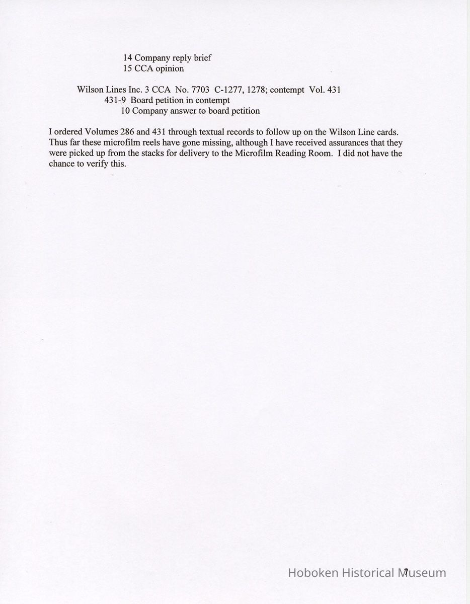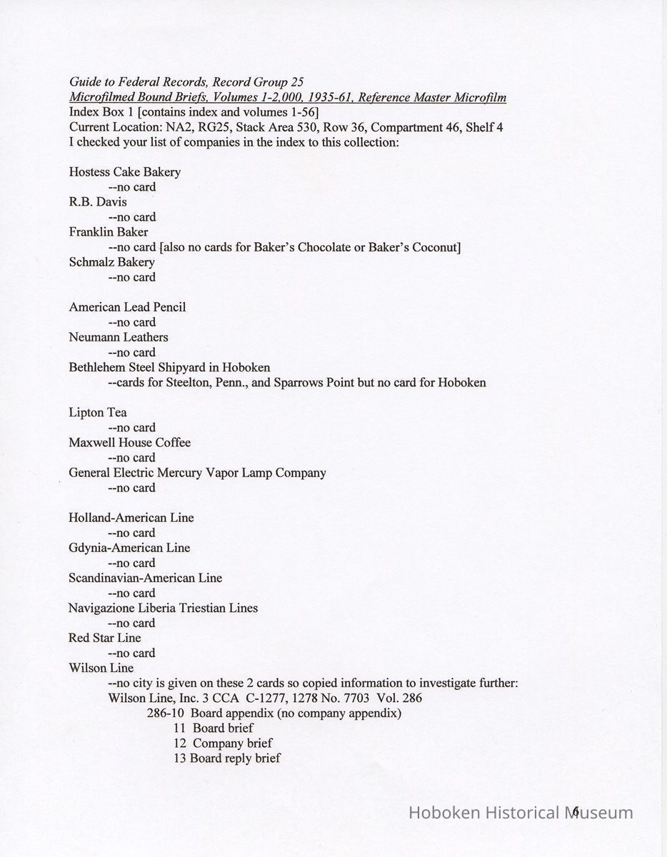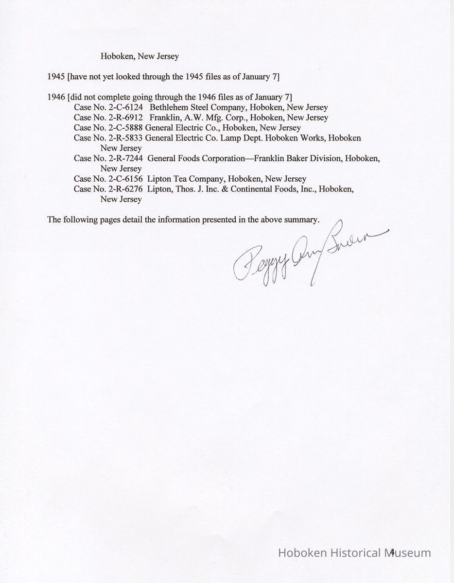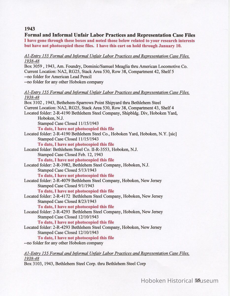 Notes: 2011.014.0002 Text of Report Peggy Ann Brown, Ph.D. 3000 OLD Dominion BLVD. ALEXANDRIA, VA 22305 703-820-1234 PeggyAnnBrown@verizon.net www.peggyannbrown.net January 7, 2011 Prepared for Holly Metz Research Report 2 Selected Hoboken, New Jersey Companies and National Labor Relations Board Report and Attachments Part 1 Table of Contents Report Summary Page 2 Research Findings Page 5 Published Indexes to NLRB Materials Page 5 A1 Entry 155 Formal and Informal Unfair Labor Practices and Representation Case Files Page 8 1935-1937 Page 8 1938-1939 Page 12 1940 Page 17 1941 Page 21 1942 Page 25 1943 Page 35 1944 Page 39 1946 Page 40 Recommendations for continuing and further research Page 44 Peggy Ann Brown, Ph.D. 3000 Old Dominion Blvd. Alexandria, VA 22305 703-820-1234 peqqyannbrown@verizon.net www.peqqyannbrown.net Research Report 2 [Part 1] Selected Hoboken, New Jersey Companies and National Labor Relations Board Report Summary Per your e-mail direction, I began looking for information on the Hoboken companies identified by you in the records of the National Labor Relations Board (Record Group 25, NLRB). I followed the same procedure identified in the research for the Sweets Company of America. I again had little success finding the companies in the microfilmed indexes. The exception was an entry for the Wilson Line. However, when I ordered the microfilm volumes for this folder, the staff lost the microfilm between the textual stacks (where they were stored) and the Microfilm Reading Room. I have been assured that the records were found once and should be available. To date, I did not have time to pursue this search. I began going through A1 Entry 155 Formal and Informal Unfair Labor Practices and Representation Case Files for the 16 new companies listed in your email, plus Todd Dry Dock. Although this is a straightforward process for 1936-1946 when the files were arranged by year, and thereafter chronologically, the magnitude of ordering the boxes within Archives pull time and box limit constraints (combined with time for photocopying), proved too much for me to complete by your original deadline of January 7. I stand ready to complete these searches at your direction and apologize for not being able to get through all the materials. As you will see from the research findings, there was sometimes more than one folder with the same case number; some materials in these were duplicates but some were not. I tried going backwards, beginning with 1946 to see if I could speed up the process but found this made little difference. I have included the inclusive company names for the individual boxes so that you can search for any other companies that might be of interest and can assume that there are no folders for that company in the specific box as I searched for other Hoboken companies in all ordered boxes. I have kept the materials in the order in which they appeared in the folder; for the most part this means folders are in reverse chronological order. Please note that the Bethlehem Steel and Todd Dry Dock materials often contain information on both the New York and Hoboken yards. Apparently their cases were investigated and pursued both individually and together. To date, I have located files on the following companies: 1935-37 Case No. II-R-49 Davis, (R.B.) Baking Powder, Hoboken, New Jersey Case No. II-C-320 R. Neumann & Co., Hoboken, N.J. 1938-39 Case No. 1 l-C-2406 R. Neumann & Co., Hoboken, N.J. Case No. 11 -C-2532 R. Neumann & Co., Hoboken, N.J. 1940 Case No. ll-C-2785 R. Neumann & Co., Hoboken, N.J 1941 Case No. II-C-4011 Lipton, Thomas J. & Continental Foods, Inc., Hoboken, New Jersey Case No. II-R-2633 Lipton, Thos. J. Inc., & Continental Foods, Inc., Hoboken, New Jersey 1942 Case No. II-R-3026 Bethlehem Steel Co., Hoboken, New Jersey Case No. R-3540 Bethlehem Steel Co. (Shipbuilding Div.), Hoboken, New Jersey 1943 Case No. R-237 Todd Shipyards & Robins Drydock & Repair Co., Hoboken, New Jersey Case No. 2-R-4190 Bethlehem Steel Company, Shipbldg. Div., Hoboken Yard, Hoboken, New Jersey Case No. II-R-3553 Bethlehem Steel Co., Hoboken, New Jersey Case No. 2-R-4079 Bethlehem Steel Company, Hoboken, New Jersey Case No. 2-R-4172 Bethlehem Steel Company, Hoboken, New Jersey Case No. 2-R-4293 Bethlehem Steel Company, Hoboken, New Jersey Case No. R-5798 Bethlehem Steel Company, Hoboken, New Jersey Case No. 2-R-3905 Hoboken Land and Improvement Co., Hoboken, New Jersey Case No. R-5667 Todd-Dry Dock-Corp., Hoboken, New Jersey Case No. R-5668 Todd Dry Dock Corp., Hoboken, New Jersey 1944 [did not complete going through these files as of January 7] Case No. 2-C-5308 Bethlehem Steel, Hoboken, New Jersey Case No. 2-R-4453 Bethlehem Steel Co. Shipbuilding Div. Hoboken Yard, ken, New Jersey 1945 [have not yet looked through the 1945 files as of January 7] 1946 [did not complete going through the 1946 files as of January 7] Case No. 2-C-6124 Bethlehem Steel Company, Hoboken, New Jersey Case No. 2-R-6912 Franklin, A.W. Mfg. Corp., Hoboken, New Jersey Case No. 2-C-5888 General Electric Co., Hoboken, New Jersey Case No. 2-R-5833 General Electric Co. Lamp Dept. Hoboken Works, Hoboken New Jersey Case No. 2-R-7244 General Foods Corporation—Franklin Baker Division, Hoboken, New Jersey Case No. 2-C-6156 Lipton Tea Company, Hoboken, New Jersey Case No. 2-R-6276 Lipton, Thos. J. Inc. & Continental Foods, Inc., Hoboken, New Jersey The following pages detail the information presented in the above summary. National Archives, College Park, Maryland (Archives 2) Research Findings Published Indexes to NLRB Materials NARA Microfilm Publication A 3358, Index to NLRB Transcripts and Exhibits, 1935-1948 For this examination I used all five rolls Current Location: NA2, Microfilm Reading Room, Cabinet IB / Drawer 10 Hostess Cake Bakery —no card R.B. Davis —no card Franklin Baker —no card [also no cards for Baker's Chocolate or Baker's Coconut] Schmalz Bakery —no card American Lead Pencil —no card Neumann