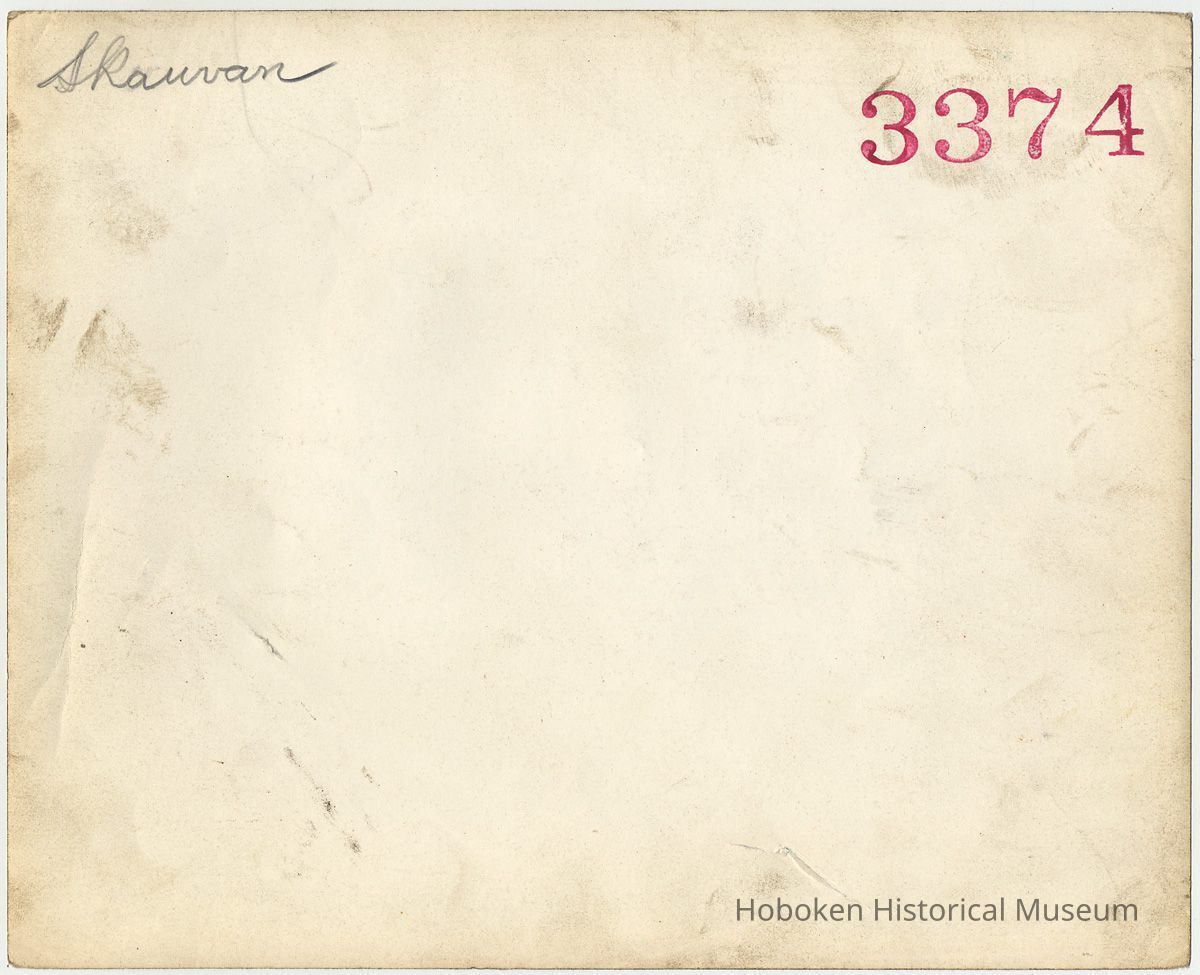 Black-and-white photo of a metal machined part on lathe in machine shop, Bethlehem Steel Shipyard, Hoboken, no date, circa 1940-1945. 8" x 10" print; two copies. Photographer is not indicated, possibly William Craig. Reverse of both prints has large inkstamped file or negative number: 3374; penciled note on copy 1: Skauvan.