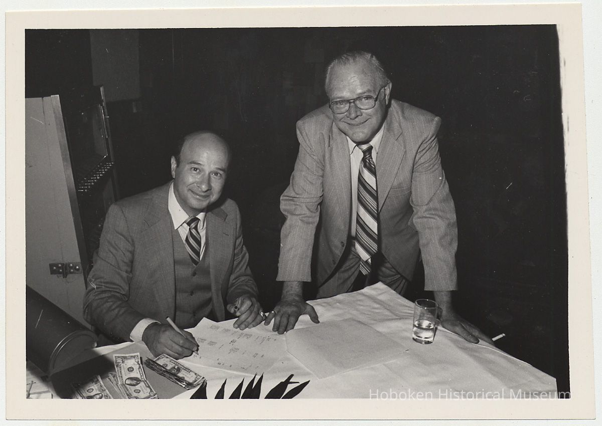 B+W photos, 2, of Joseph Cangelosi, Supt., Bethlehem Steel Hoboken Shipyard at retirement party, Hoboken, 1981.