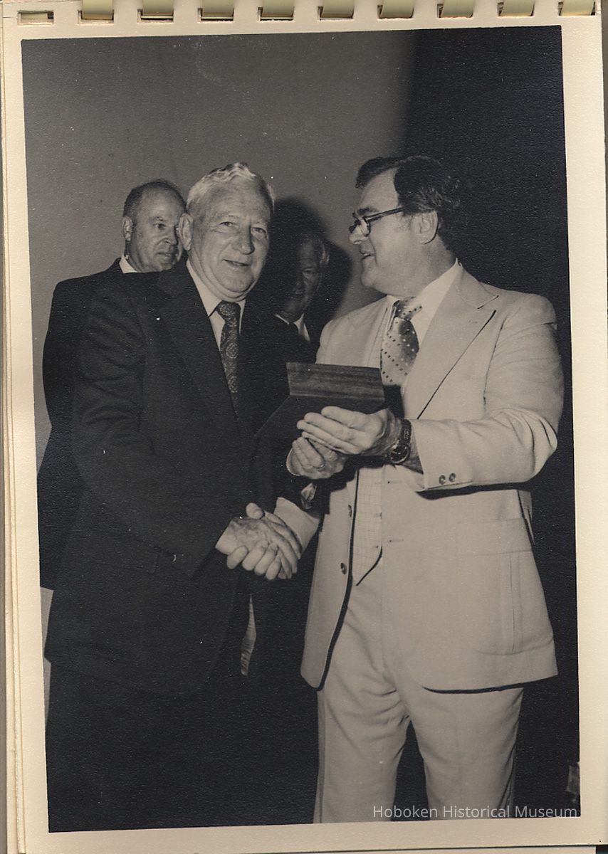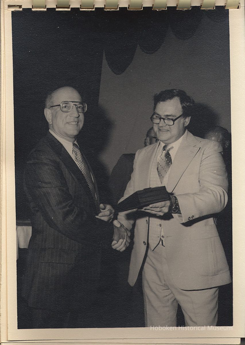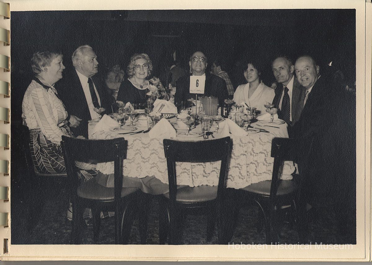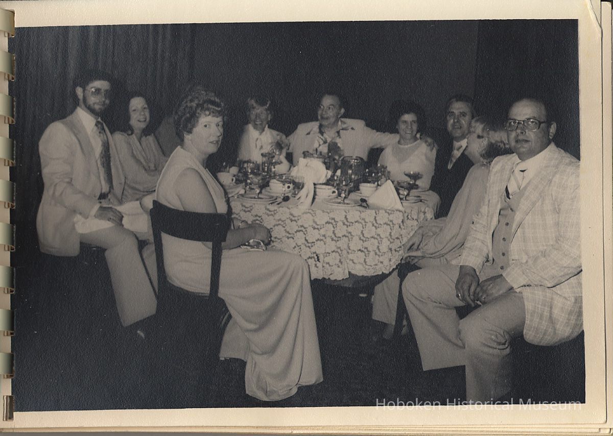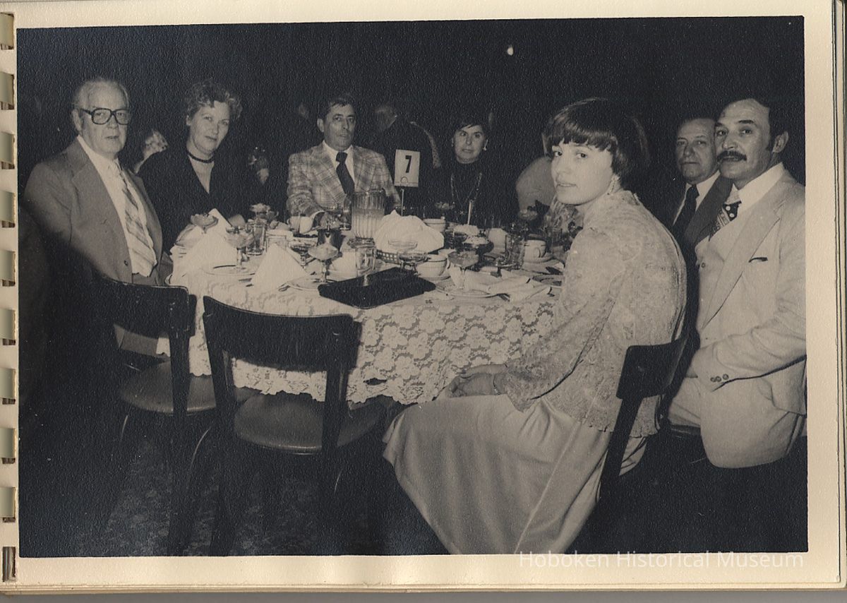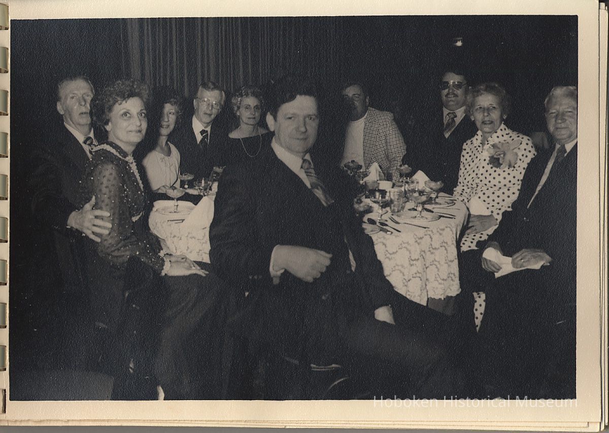 Album of black-and-white photos, twenty-eight of a Bethlehem Steel Hoboken Shipyard retirement party held on the second floor of the Union Club, Hoboken, ca. 1979-1981. 5" x 7" prints in white plastic comb binding; plain gray covers. Photographer not indicated. Reverse of most are blank except for occasional pencil numbers. People are unidentified except for Joseph Cangelosi (see below) and Lawrence Baum.