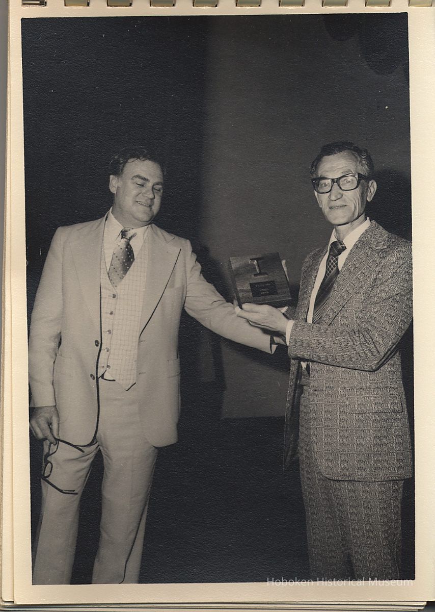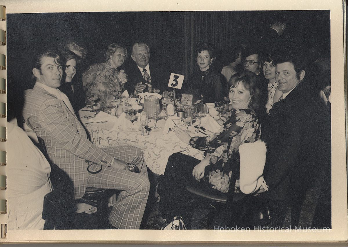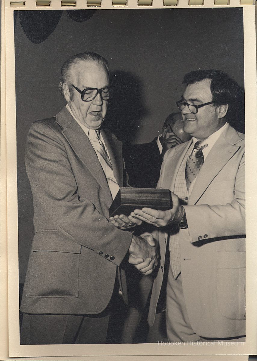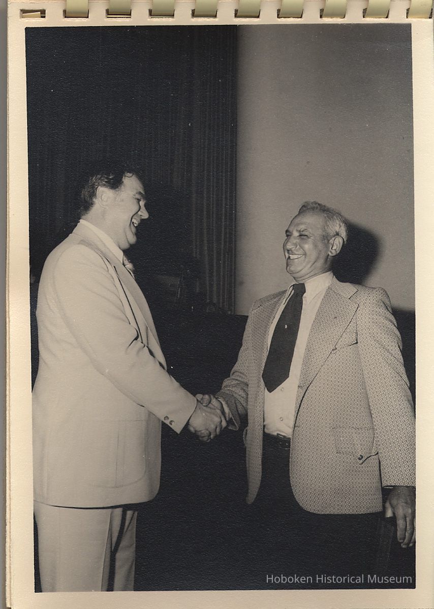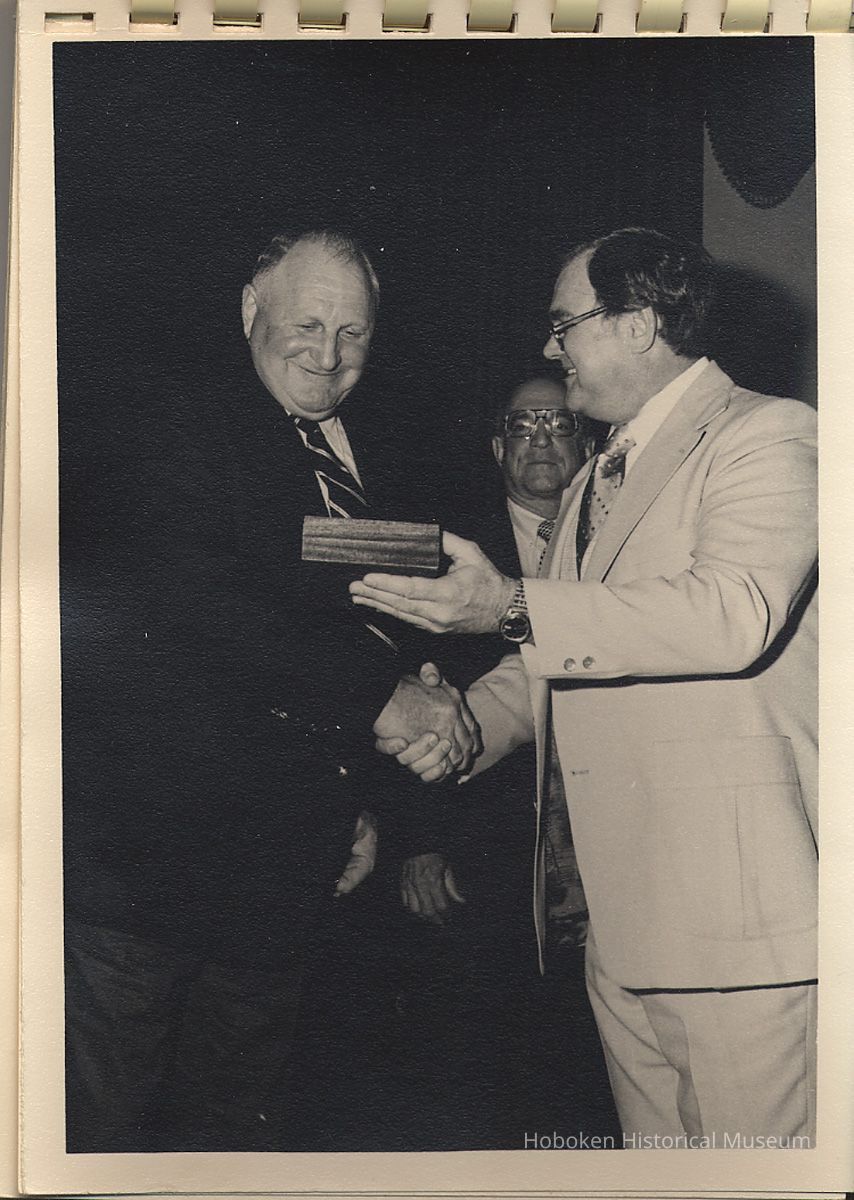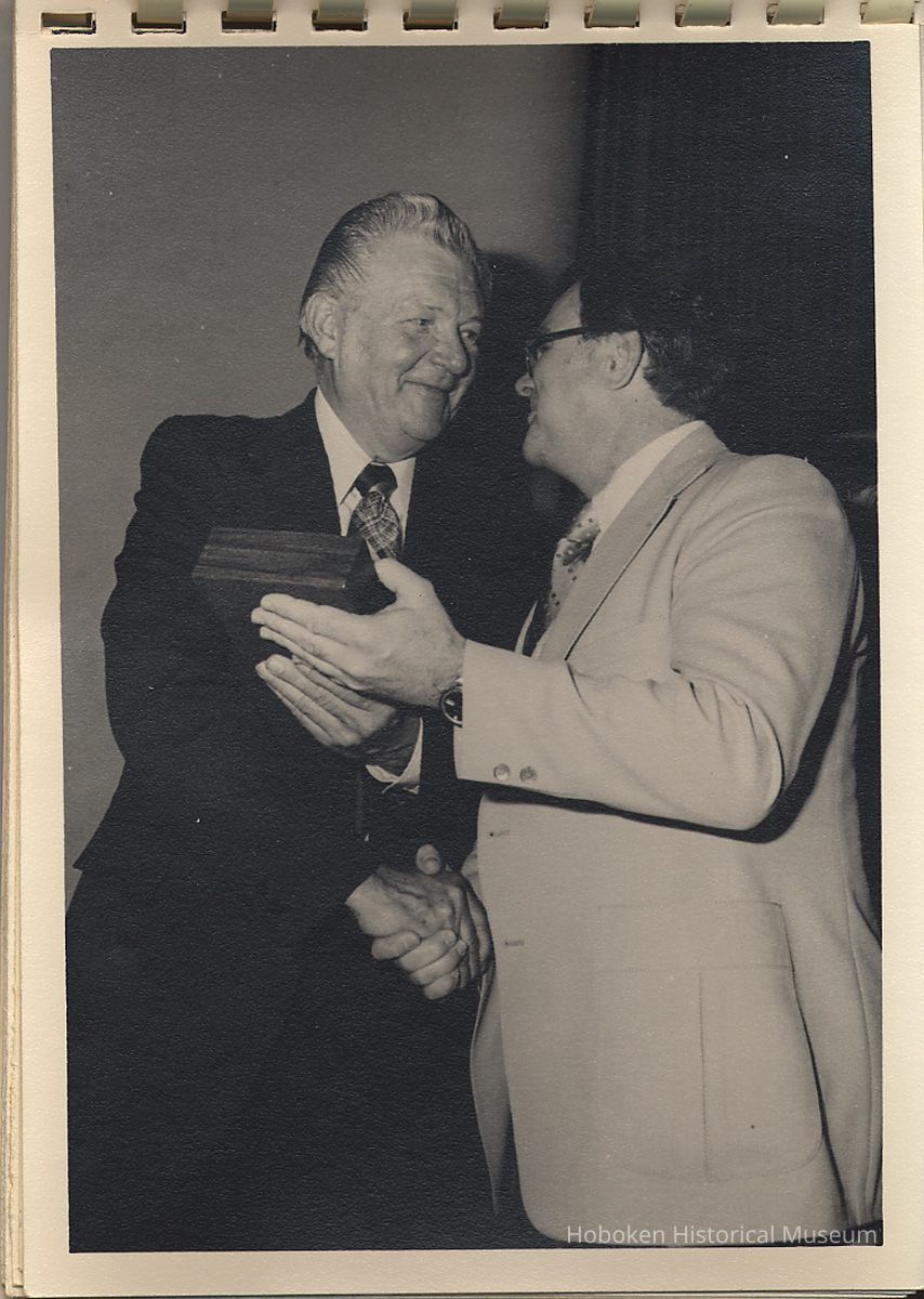 Album of black-and-white photos, twenty-eight of a Bethlehem Steel Hoboken Shipyard retirement party held on the second floor of the Union Club, Hoboken, ca. 1979-1981. 5" x 7" prints in white plastic comb binding; plain gray covers. Photographer not indicated. Reverse of most are blank except for occasional pencil numbers. People are unidentified except for Joseph Cangelosi (see below) and Lawrence Baum.
