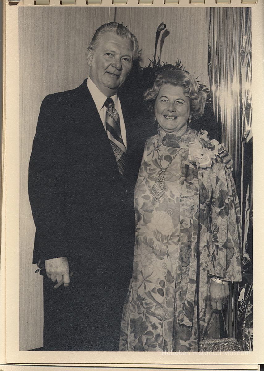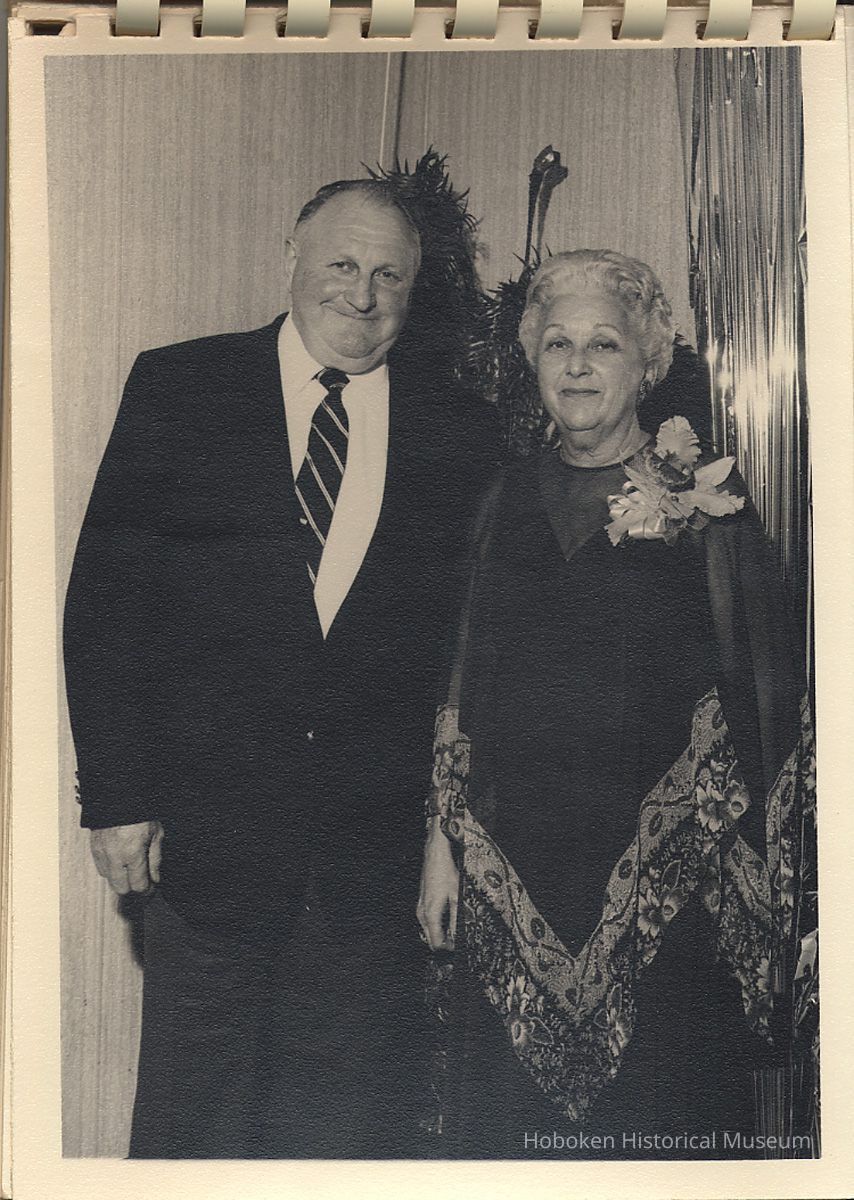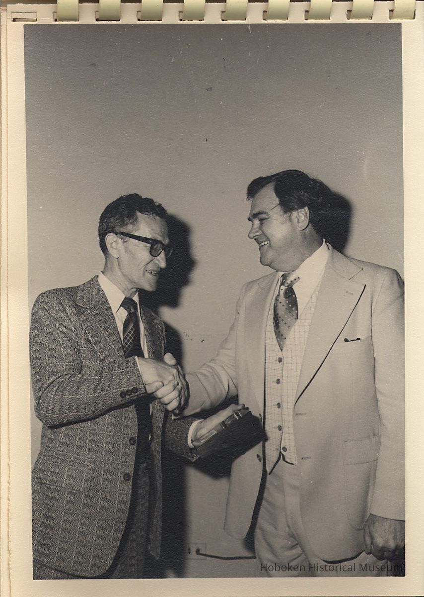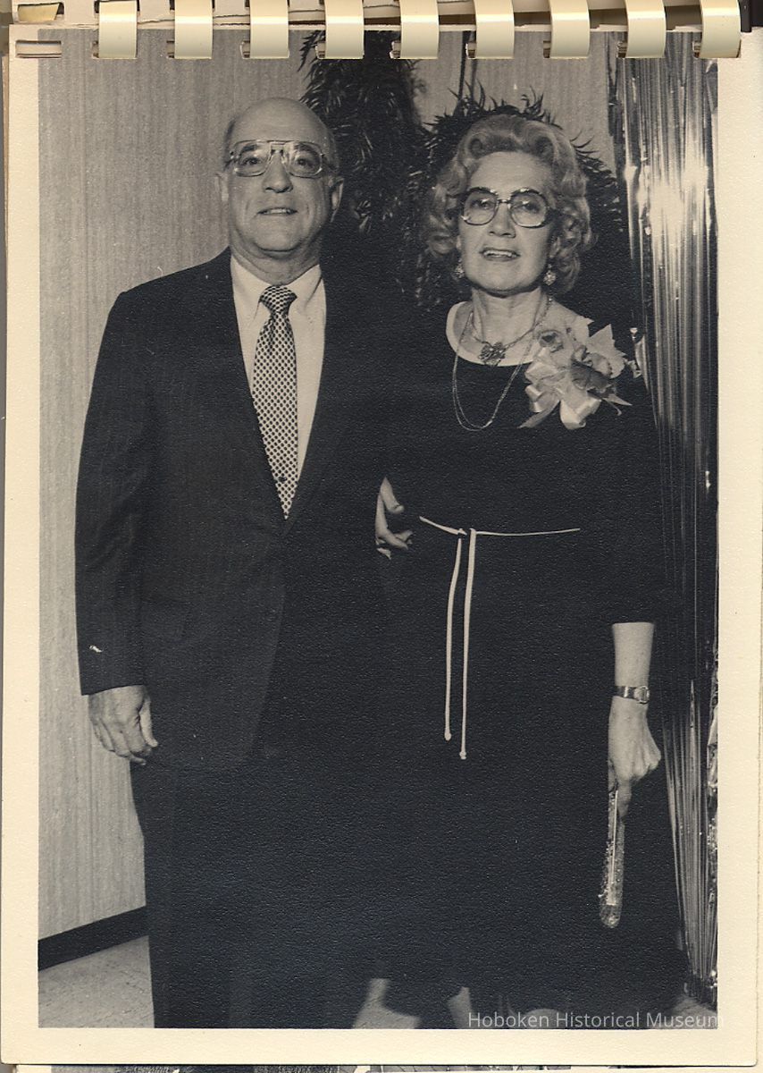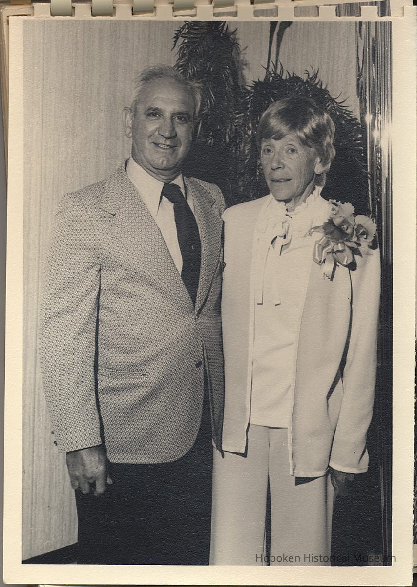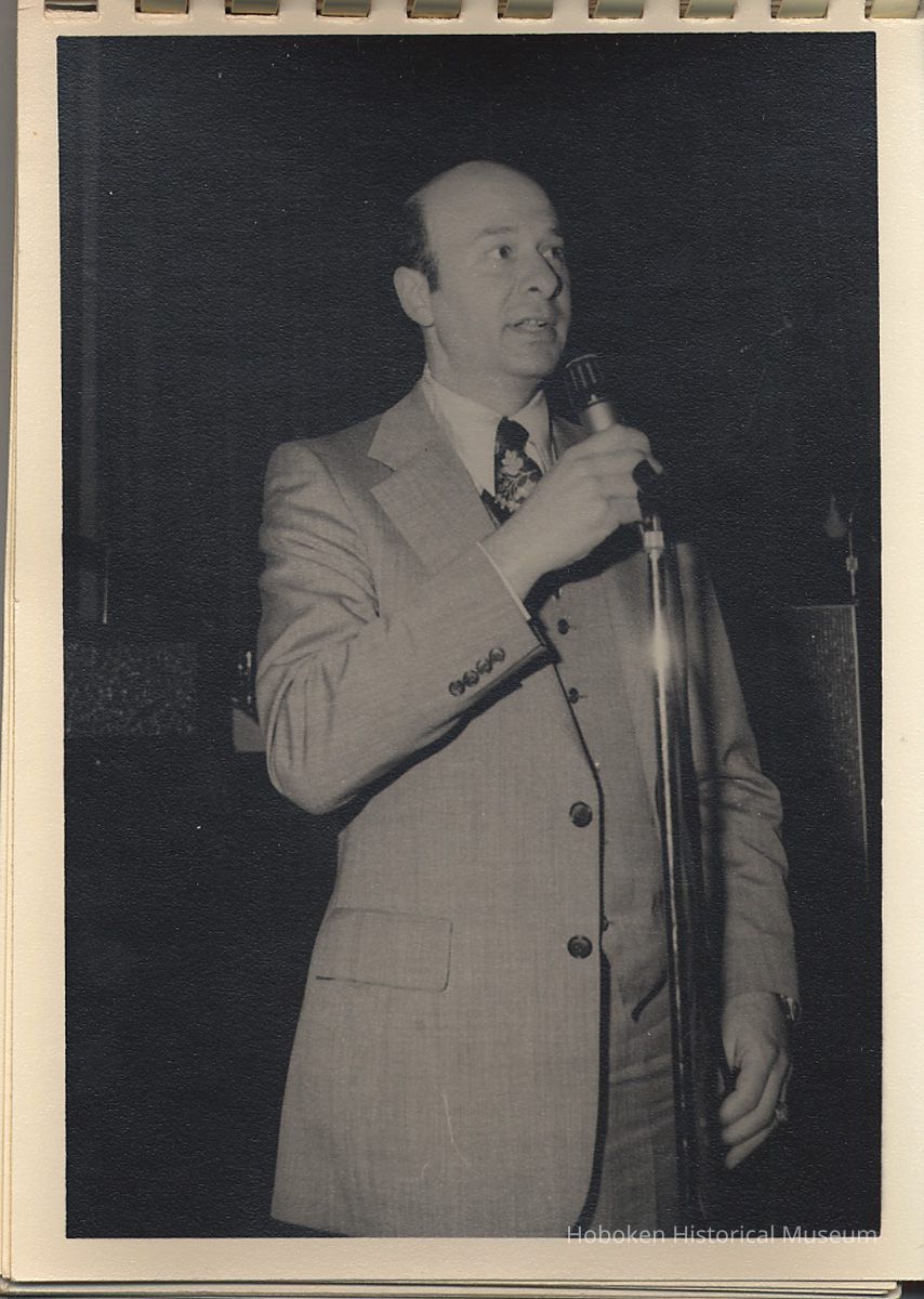 Album of black-and-white photos, twenty-eight of a Bethlehem Steel Hoboken Shipyard retirement party held on the second floor of the Union Club, Hoboken, ca. 1979-1981. 5" x 7" prints in white plastic comb binding; plain gray covers. Photographer not indicated. Reverse of most are blank except for occasional pencil numbers. People are unidentified except for Joseph Cangelosi (see below) and Lawrence Baum.