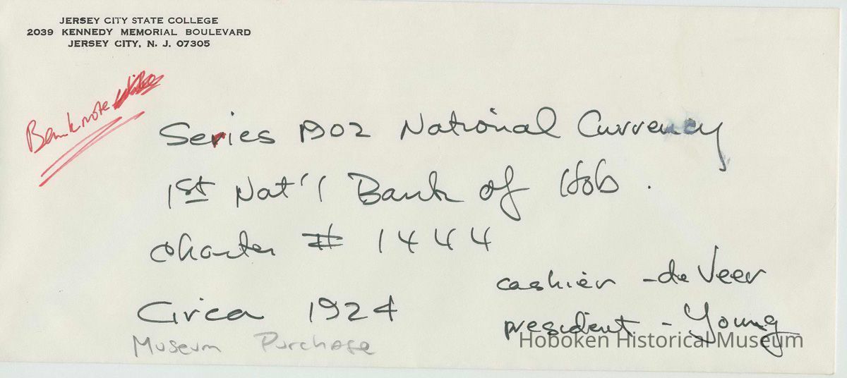 Banknote from the First National Bank of Hoboken, 1905. 7" x 3".
