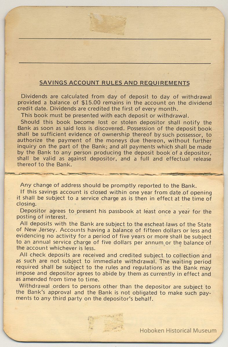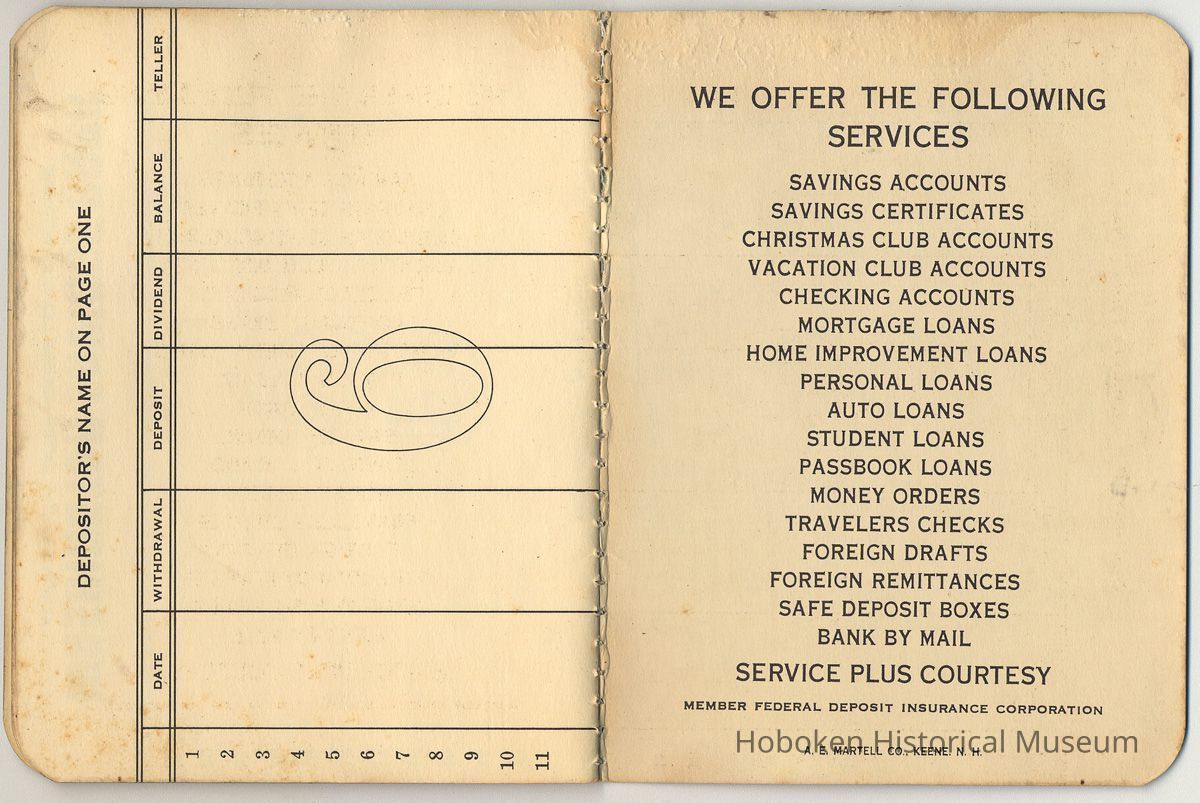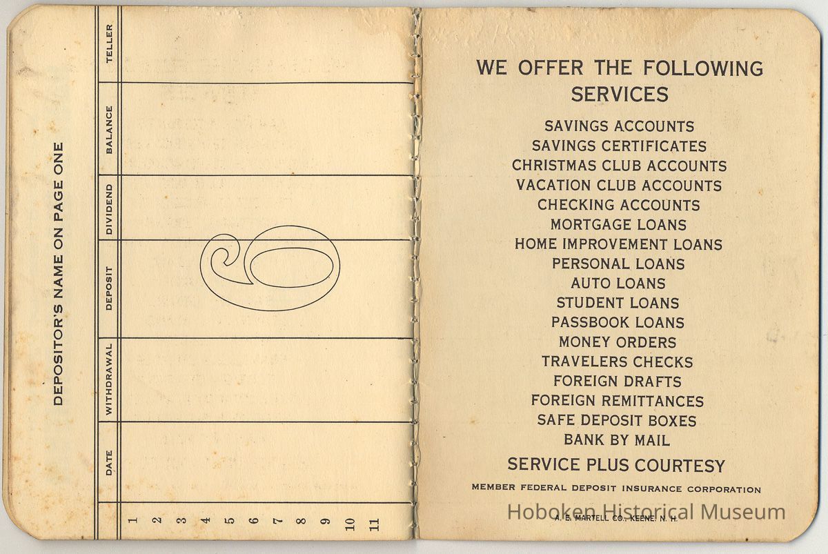 Savings account pass book no. 315481. The bank was established as the Hoboken Bank for Savings in 1857 and renamed Washington Savings Bank in the 1970s.