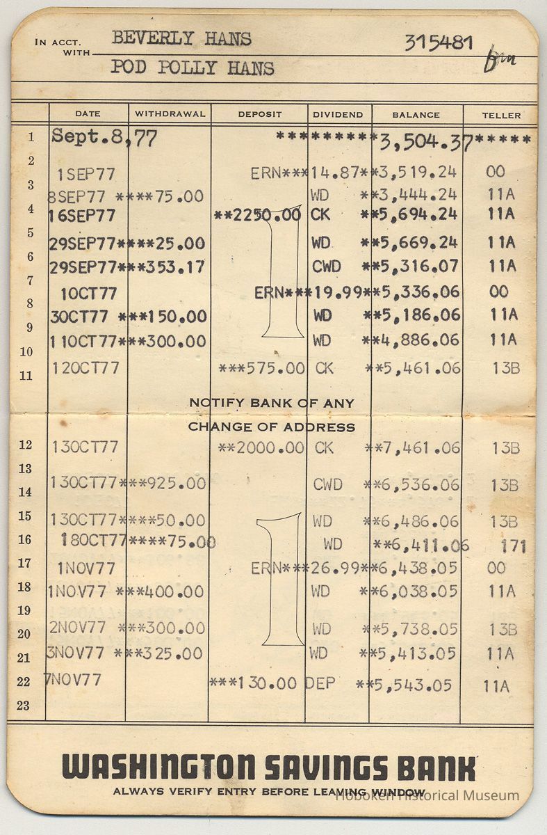 Bank book: Washington Savings Bank, Washington St. at First St., Hoboken, N.J.; account holders Beverly Hans, POD Polly Hans, Hoboken; 1977-1978 (account closed, Jan 30, 1978.) Printed booklet 3-3/8" wide x 4-1/2" high; blue cover imprinted in gold. deposits, withdrawals and interest postings, there are holographic entries by the owners.