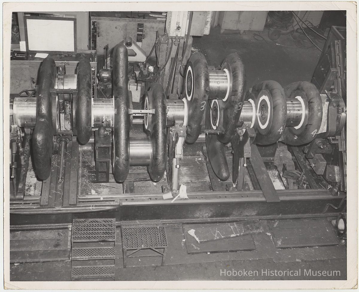 Photo of crank shaft on lathe in machine shop; no vessel named.