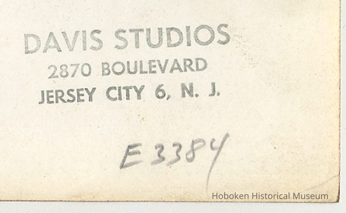 Inkstamp of Davis Studios has address as 2870 Boulevard, Jersey City, 6, N.J. which places it as 1957 or earlier.