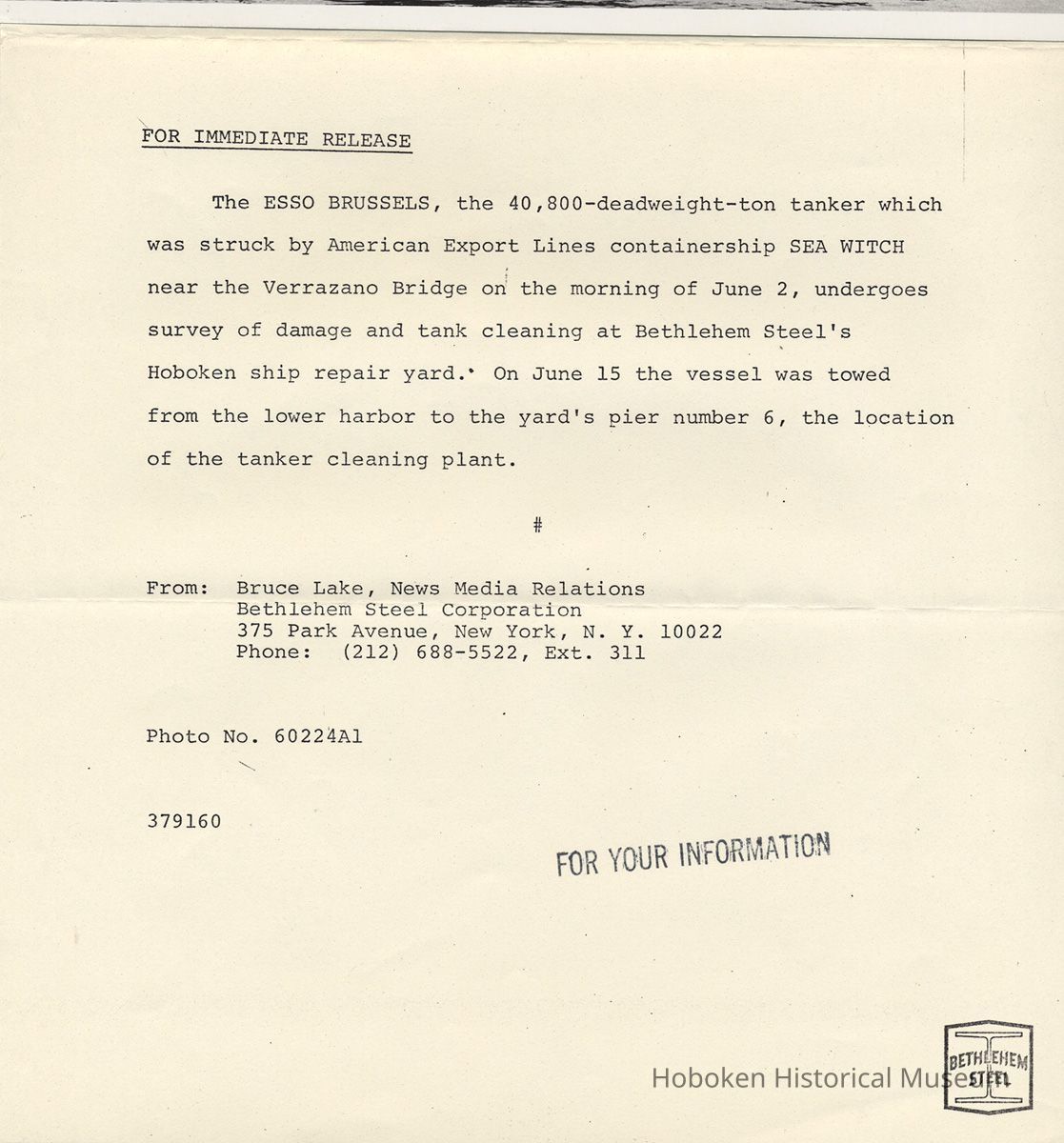 B+W photo of tanker Esso Brussels at Bethlehem Steel Shipyard Pier 6, Hoboken, June 1973.