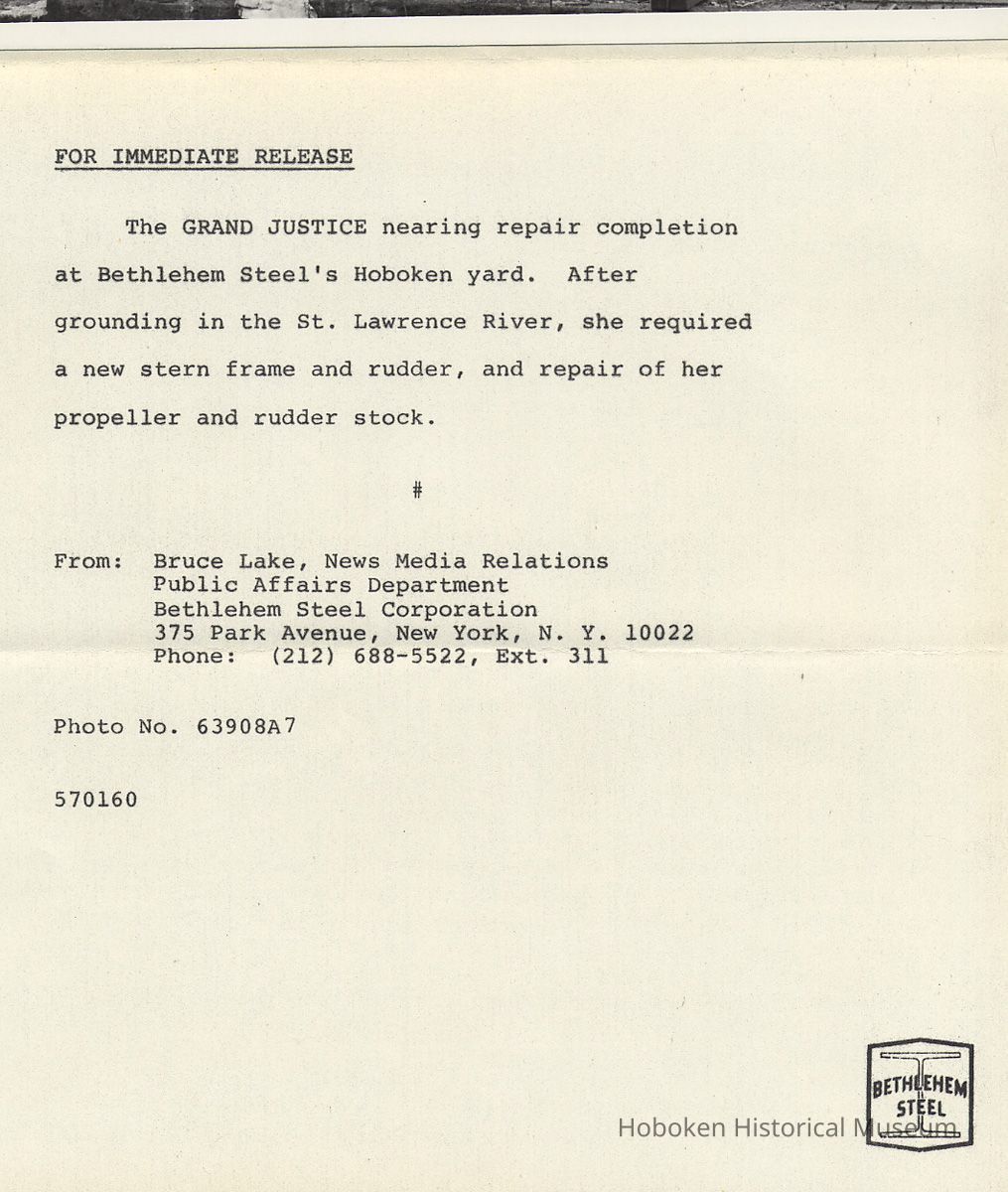 Notes: [text of attached press release] FOR IMMEDIATE RELEASE The GRAND JUSTICE nearing repair completion at Bethlehem Steel's Hoboken yard. After grounding in the St. Lawrence River, she required a new stern frame and rudder, and repair of her propeller and rudder stock. # From: Bruce Lake, News Media Relations Public Affairs Department Bethlehem Steel Corporation 375 Park Avenue, New York, N. Y. 10022 Phone: (212) 688-5522, Ext. 311 Photo No. 63908A7 570160 [end attached press release] ______________ [TEXT OF FULL PAGE PRESS RELEASE; filed with photo 2011.025.0340] From: Bruce Lake, News Media Relations Public Affairs Department Bethlehem Steel Corporation 375 Park Avenue, New York, N. Y. 10022 Phone: (212) 688-5522, Ext. 311 FOR IMMEDIATE RELEASE When the Liberian bulk carrier MV GRAND JUSTICE ran aground in the St. Lawrence River, she cracked her stern frame, tore off her rudder, damaged her tail shaft, and bent her propeller. Fully loaded with grain, the 10,030- gross-ton ship was towed to Bethlehem Steel's Hoboken (N.J.) ship repair yard where she arrived on January 29. There the eight-year-old, 484-foot-long ship was drydocked and surveyed. The chief concern was the rebuilding of the stern frame. / Because of an order backlog in forging shops, the GRAND JUSTICE might have to wait as long as a year. However, Hoboken yard officials were familiar with a faster way, a rarely used method of building stern frames from laminated steel plate. In the yard's machine shop, eight plates, each about 3 inches thick were squirt welded and then reinforced by 20 1-1/2-inch bolts. Meanwhile, the shop fabricated a new rudder, sent the rudder stock to the company's plant in Bethlehem, Pa., for straightening and sent the bent propeller to a sub contractor for repair. The GRAND JUSTICE, with all repairs completed, departed the Hoboken yard on May 15, less than four months after her arrival. # 570160 [end full page press release] Original or Copy: Original Status: OK Status By: dw Status Date: 2011-05-03