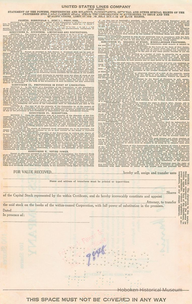 Stock certificate, temporary: United States Lines Co., N.Y. & Hoboken, for 100 shares, July 22, 1943.