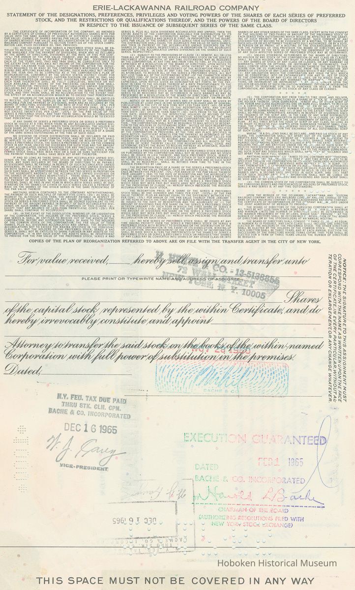 Stock certificate, yellow-orange, of the Erie-Lackawanna Railroad Company for 1000 shares common stock, dated Nov. 22, 1960. 8-1/16" high x 11-15/16" wide. Certificate no. NC/U371. Silver ink masking over printing that stated for less for 100 shares. Additionally perforated with number "1000." Canceled Dec. 12, 1965.