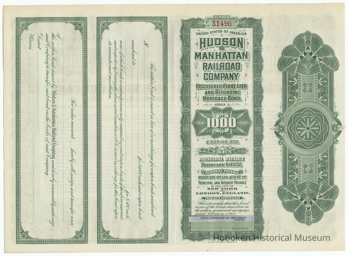 Registered bond: Hudson & Manhattan Railroad Company, Registered First Lien and Refunding Mortgage Bond, Series A, $1000, Five Per Cent (5%), February 1, 1913; Principal Payable February 1, 1957; Trustee's Certificate; Number S1496. Unissued.