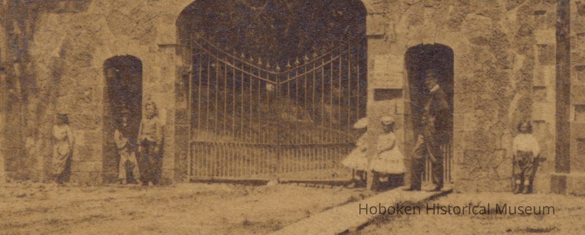 The image is the same as photo 2005.053.0008, a labeled stereoview: Steven's Residence, Castle Point, Hoboken. Portion of Gateway and Grounds [Hoboken]. [NY], no date, ca. 1870's. Anthony's Stereoscopic Views. No. 6614. Published by E. & H.T. Anthony & Co., N.Y. See that record for a full description of the scene.