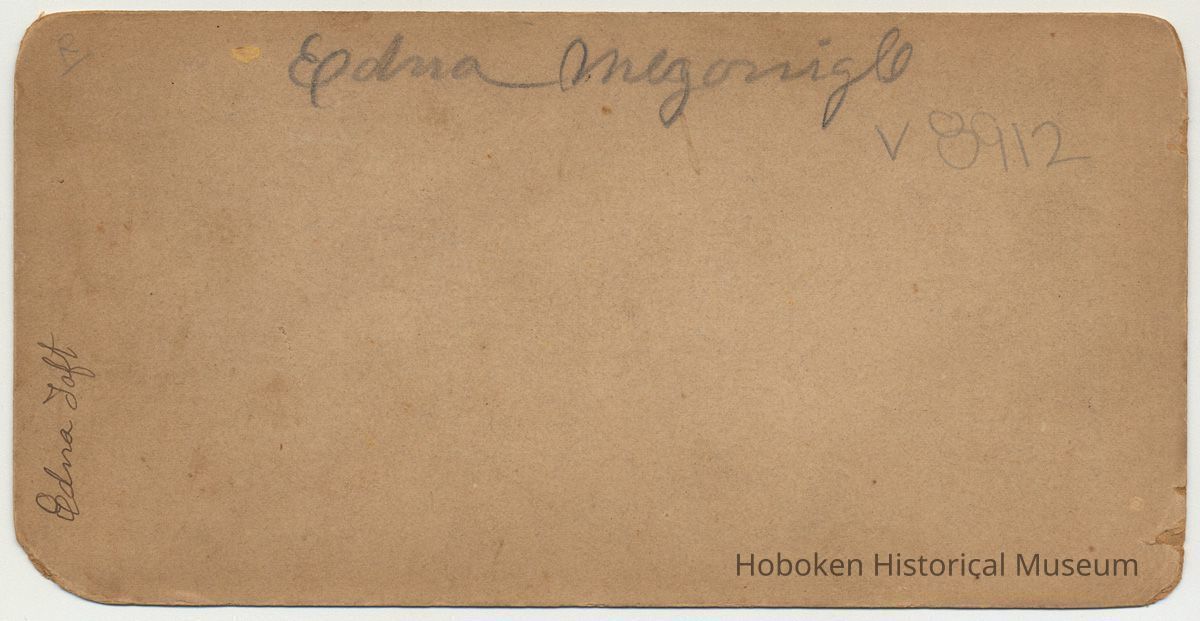 Front has holographic ink name of "Edna" at right in an adult hand; reverse has name "Edna Taft" in same hand plus a larger penciled name: Edna McGonigle. Also penciled code: V8912 (this is not believed to a be a series number.)