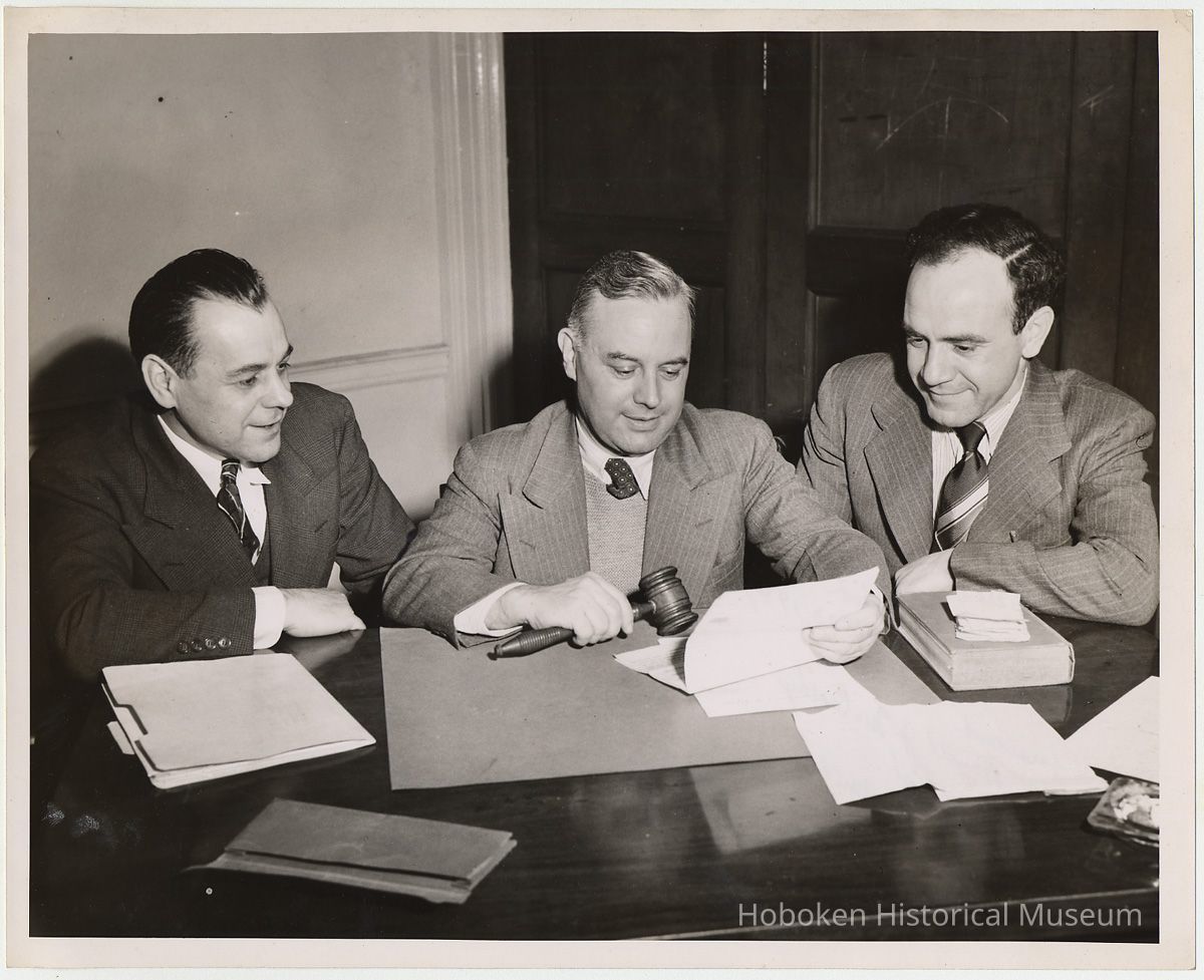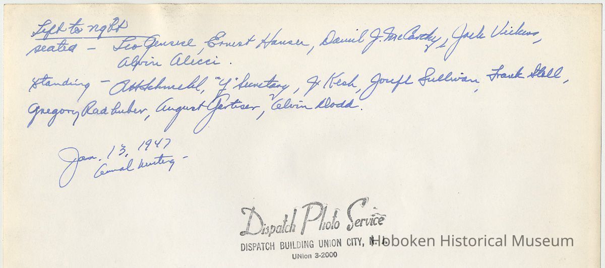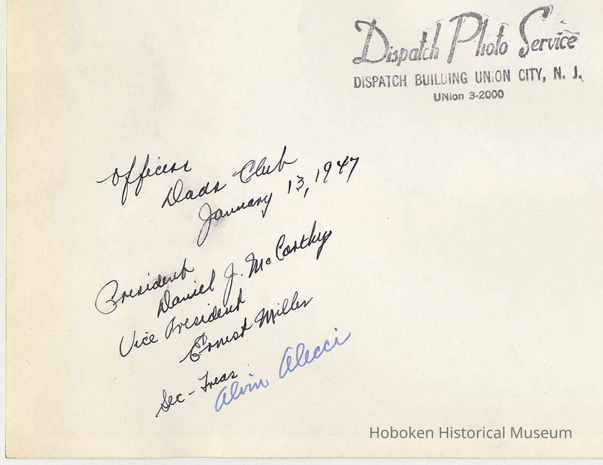 Black-and-white group photos, two, of Dads Club annual meeting and officers at Hoboken Y.M.C.A., Hoboken, January 13, 1947. 8" x 10" prints. Photographs by Dispatch News Service with inkstamp on both prints (presumed to be an agency of the newspaper, Hudson Dispatch.) Ink identifications and dates on reverse.
