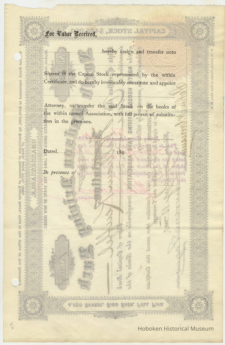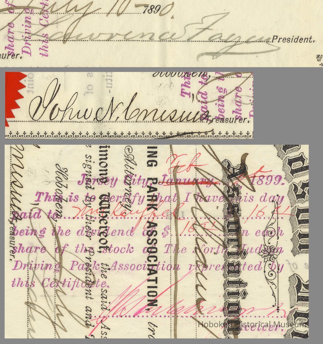 Stock certificate: North Hudson Driving Park Assn., Hoboken, 1 share issued to William Keuffel, July 10, 1890.