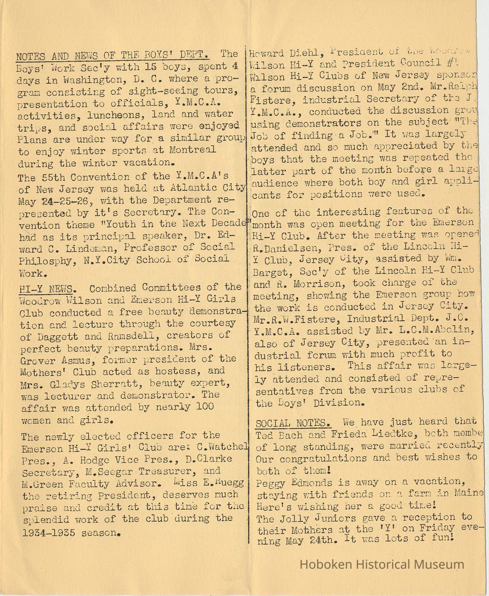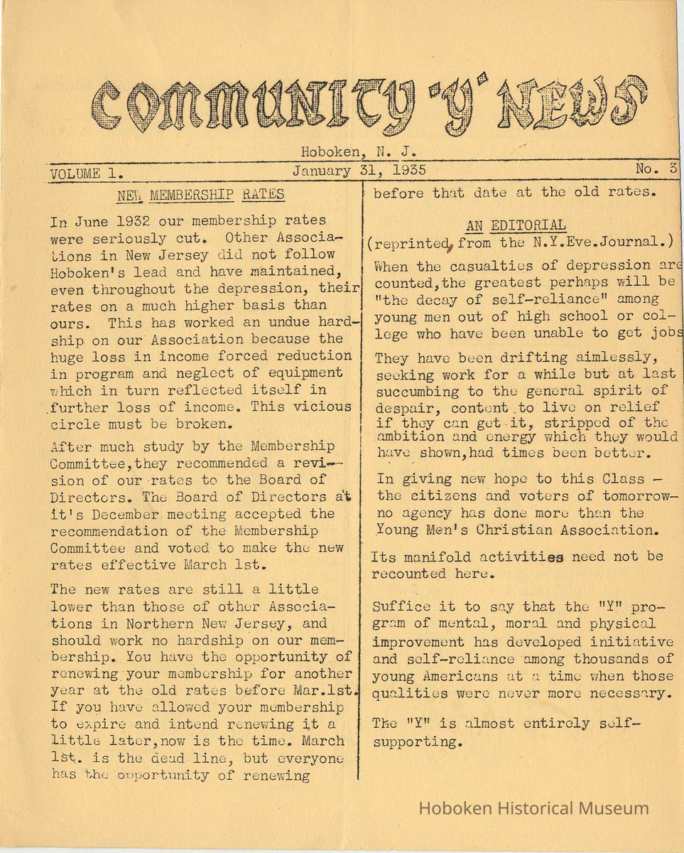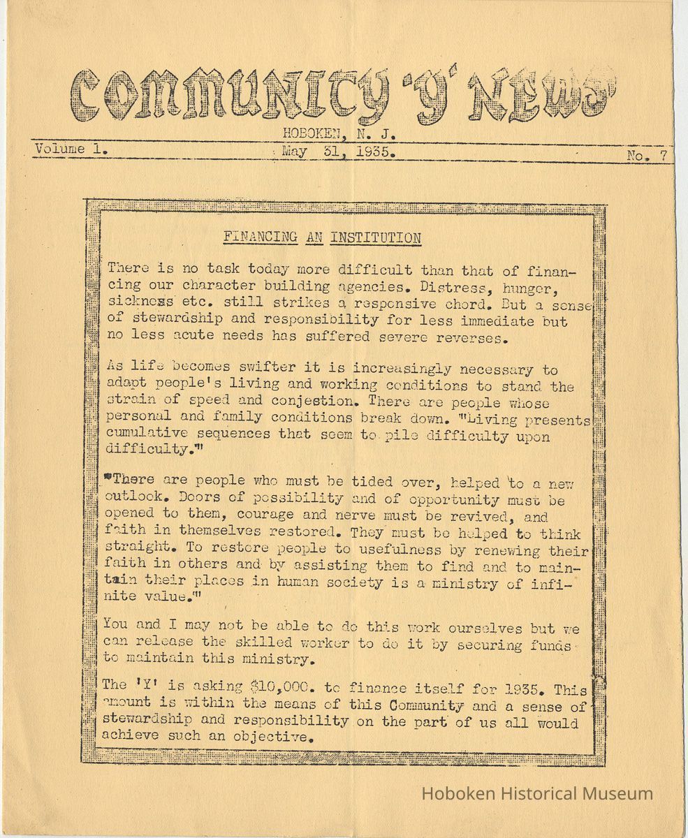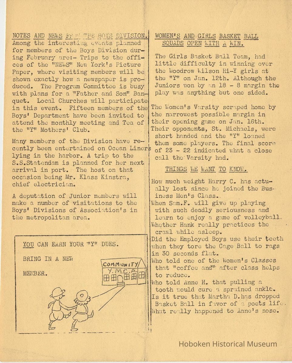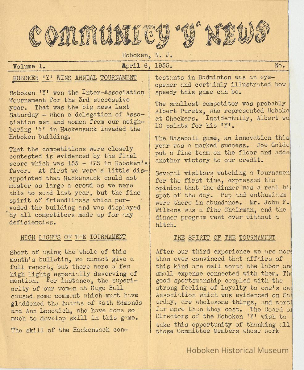 Notes: Archives 2001.126.0060 - Community 'Y" News; selected text from Volume 1 with an emphasis on individual names found. v.1, no. 2, Dec. 31, 1934 pg [3] Leo Beyer; Elma De Martin; Peggy Edmonds pg [4] Helen Linkogel; Martha Delitszcher; Anno Losowich; Ernest Rogers; Victor Moore; Carl Schutz cartoonist; Ted Brooks v.1, no. 3, Jan. 31, 1935 pg [1] New Membership Rates In June 1932 our membership rates were seriously cut. Other Associations in New Jersey did not follow Hoboken's lead and have maintained, even throughout the depression, their rates on a much higher basis than ours. ….. Board of Directors …. voted to make the new rates effective March 1st. pg [2] Girls Division News Our smallest members, the Friendly Indian girls, enjoyed a visit to the Central Park Zoo last month. pg [4] Notes and News from the Boys Division Many members of the Division have recently been entertained on Ocean Liners lying in the harbor. A trip to the S.S. Statendam [Holland America] is planned for her next arrival in port. The host on that occasion being Mr. Klass Kinstra, chief electrician. v.1, no. 4, Feb. 18, 1935 pg [1] In the passing of Frederick W. Janssen. pg [2] annual financial campaign; John G. Applegate, chair. Girl Swimmers Win at Elizabeth pg [3] Mr. & Mrs. J. Henry Wendt leaving Hoboken… (Eleanor Wendt) Mrs. J. George of 1037 Garden St. takes charge of our Cafeteria on March 1st. pg [4] Edith Brennan; Lucy Parsek; Bill Miller; Syl Cohen; Ralph Paoli; Helen Linkogel v.1, no. 5, April 6, 1935 pg [1] Kath Edmonds; Ann Losowich; Albert Puretz (checkers); Joe Golden; John F. Wilkens. pg [2] Clara Essers; Fred Broad; Fred Vincent; Clayton Koons; Louis Meyer; Fred Edmonds. v.1, no. 6, April 30, 1935 pg [1] Camp Tamaqua pg [3] Henry Wigand; Martha Spyksma; Bill Ferinden; Mary George; Walter Ryan; Roland Gioia; Bill Schwartz; Al Ruch pg [4] John Ledlie; Delmo De Martin; Al Bianchi; Carl Ahrnke; Lester Davis; Clara Bell Wood memorial notice. v.1, no. 7, May 31, 1935 pg [1] re financial campaign; raising $10,000 pg [2] Alfred 'Fred' J. Edmonds pg [3] Mrs. Grover Asmius; Mrs. Gladys Sheratt; C. Watchell, A. Hodge; D. Clark; M. Seegar; M. Green; Miss E. Ruegg; Howard Diehl; Ralph Fistere; R. Danielsen; William Barget, R. Morrison; Ted Bach & Frieda Liedtke married; Peggy Edmonds pg [4] Ann Losowich; Mrs. L. Lebert; Mrs. R. Mayer; Mary George [end] Status: OK Status By: dw Status Date: 2011-04-22