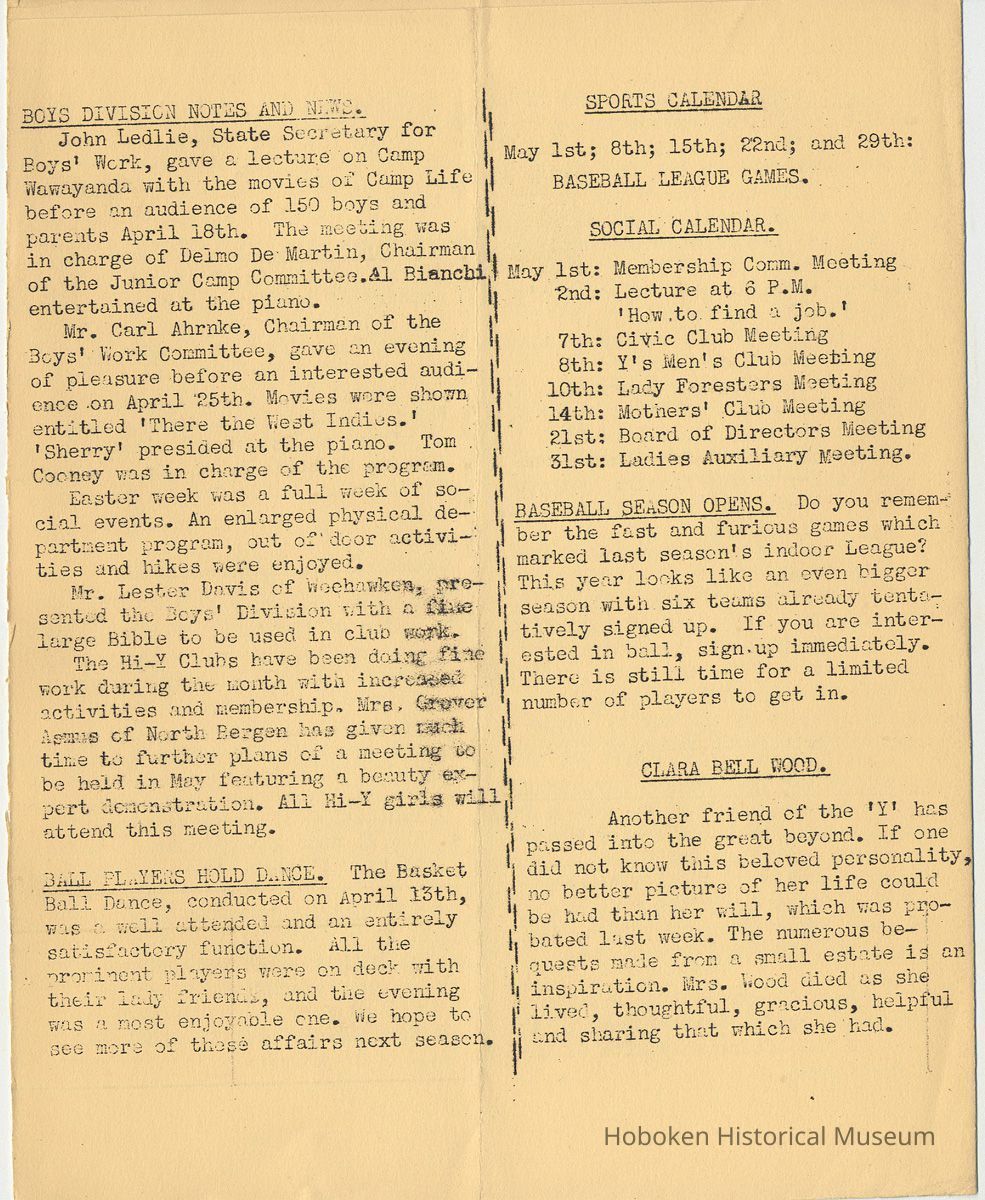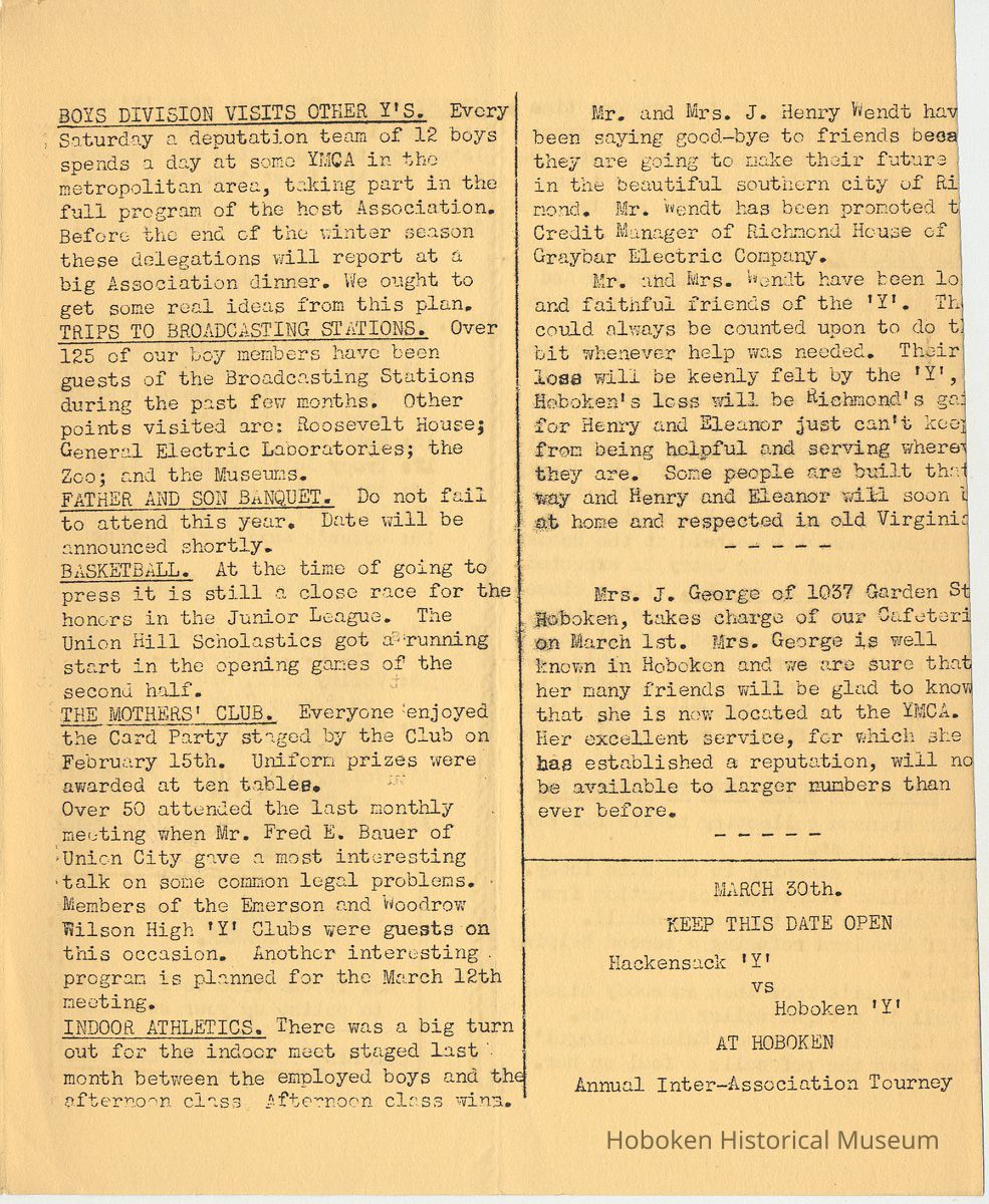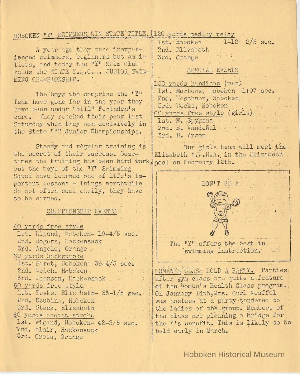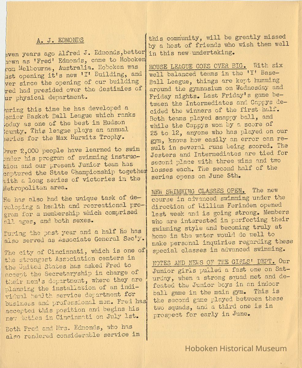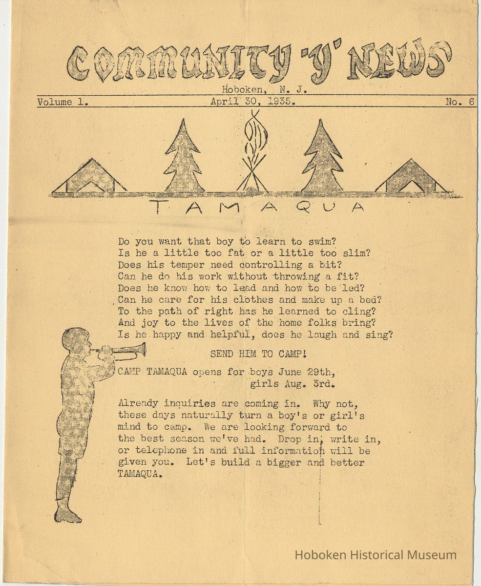 Notes: Archives 2001.126.0060 - Community 'Y" News; selected text from Volume 1 with an emphasis on individual names found. v.1, no. 2, Dec. 31, 1934 pg [3] Leo Beyer; Elma De Martin; Peggy Edmonds pg [4] Helen Linkogel; Martha Delitszcher; Anno Losowich; Ernest Rogers; Victor Moore; Carl Schutz cartoonist; Ted Brooks v.1, no. 3, Jan. 31, 1935 pg [1] New Membership Rates In June 1932 our membership rates were seriously cut. Other Associations in New Jersey did not follow Hoboken's lead and have maintained, even throughout the depression, their rates on a much higher basis than ours. ….. Board of Directors …. voted to make the new rates effective March 1st. pg [2] Girls Division News Our smallest members, the Friendly Indian girls, enjoyed a visit to the Central Park Zoo last month. pg [4] Notes and News from the Boys Division Many members of the Division have recently been entertained on Ocean Liners lying in the harbor. A trip to the S.S. Statendam [Holland America] is planned for her next arrival in port. The host on that occasion being Mr. Klass Kinstra, chief electrician. v.1, no. 4, Feb. 18, 1935 pg [1] In the passing of Frederick W. Janssen. pg [2] annual financial campaign; John G. Applegate, chair. Girl Swimmers Win at Elizabeth pg [3] Mr. & Mrs. J. Henry Wendt leaving Hoboken… (Eleanor Wendt) Mrs. J. George of 1037 Garden St. takes charge of our Cafeteria on March 1st. pg [4] Edith Brennan; Lucy Parsek; Bill Miller; Syl Cohen; Ralph Paoli; Helen Linkogel v.1, no. 5, April 6, 1935 pg [1] Kath Edmonds; Ann Losowich; Albert Puretz (checkers); Joe Golden; John F. Wilkens. pg [2] Clara Essers; Fred Broad; Fred Vincent; Clayton Koons; Louis Meyer; Fred Edmonds. v.1, no. 6, April 30, 1935 pg [1] Camp Tamaqua pg [3] Henry Wigand; Martha Spyksma; Bill Ferinden; Mary George; Walter Ryan; Roland Gioia; Bill Schwartz; Al Ruch pg [4] John Ledlie; Delmo De Martin; Al Bianchi; Carl Ahrnke; Lester Davis; Clara Bell Wood memorial notice. v.1, no. 7, May 31, 1935 pg [1] re financial campaign; raising $10,000 pg [2] Alfred 'Fred' J. Edmonds pg [3] Mrs. Grover Asmius; Mrs. Gladys Sheratt; C. Watchell, A. Hodge; D. Clark; M. Seegar; M. Green; Miss E. Ruegg; Howard Diehl; Ralph Fistere; R. Danielsen; William Barget, R. Morrison; Ted Bach & Frieda Liedtke married; Peggy Edmonds pg [4] Ann Losowich; Mrs. L. Lebert; Mrs. R. Mayer; Mary George [end] Status: OK Status By: dw Status Date: 2011-04-22