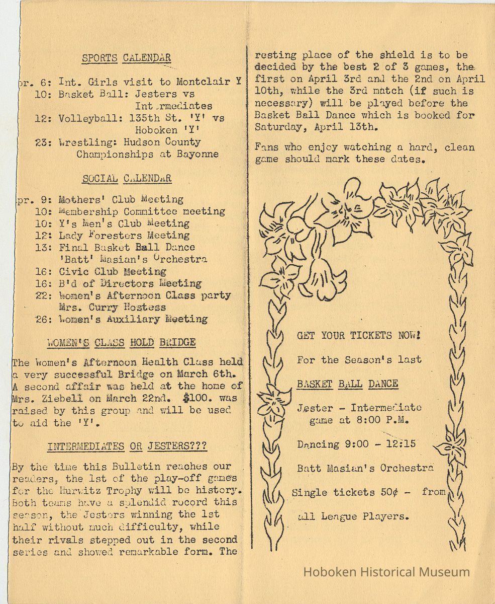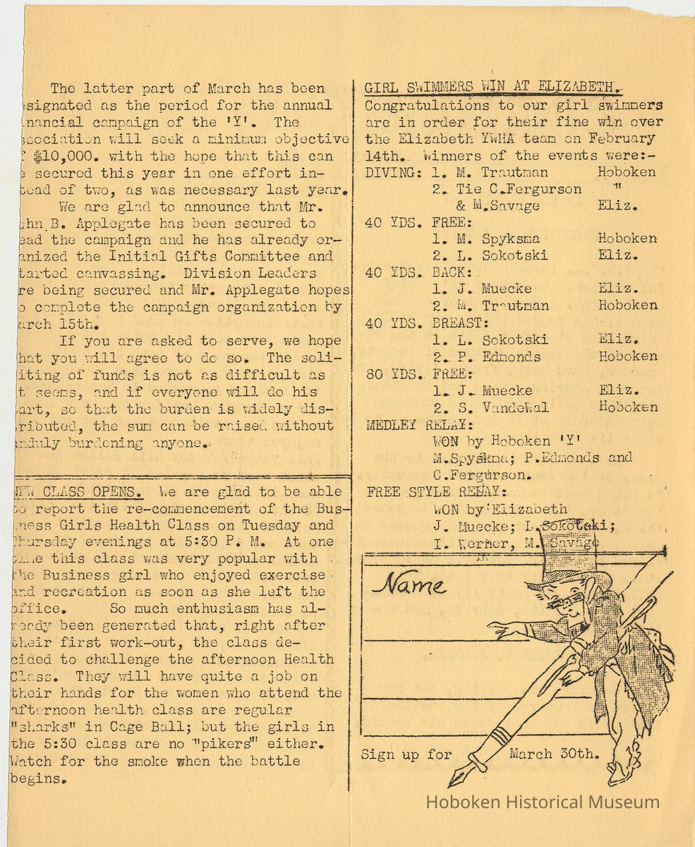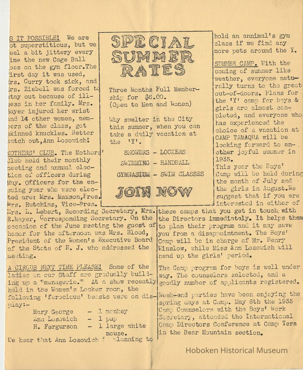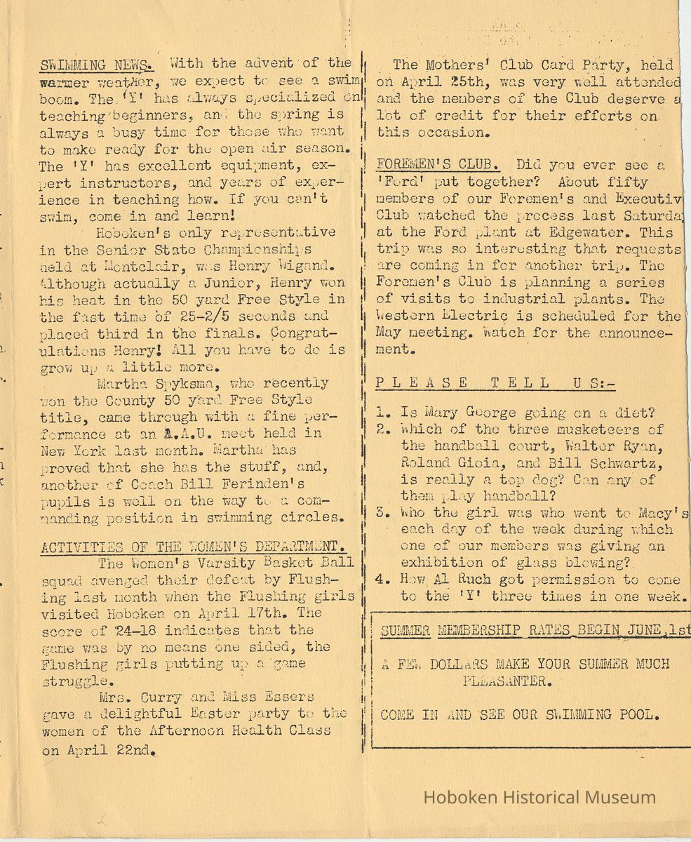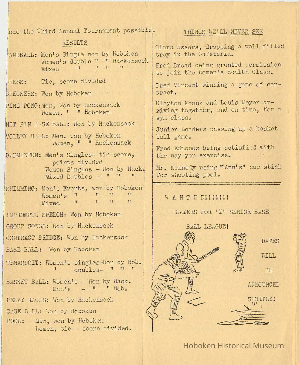 Notes: Archives 2001.126.0060 - Community 'Y" News; selected text from Volume 1 with an emphasis on individual names found. v.1, no. 2, Dec. 31, 1934 pg [3] Leo Beyer; Elma De Martin; Peggy Edmonds pg [4] Helen Linkogel; Martha Delitszcher; Anno Losowich; Ernest Rogers; Victor Moore; Carl Schutz cartoonist; Ted Brooks v.1, no. 3, Jan. 31, 1935 pg [1] New Membership Rates In June 1932 our membership rates were seriously cut. Other Associations in New Jersey did not follow Hoboken's lead and have maintained, even throughout the depression, their rates on a much higher basis than ours. ….. Board of Directors …. voted to make the new rates effective March 1st. pg [2] Girls Division News Our smallest members, the Friendly Indian girls, enjoyed a visit to the Central Park Zoo last month. pg [4] Notes and News from the Boys Division Many members of the Division have recently been entertained on Ocean Liners lying in the harbor. A trip to the S.S. Statendam [Holland America] is planned for her next arrival in port. The host on that occasion being Mr. Klass Kinstra, chief electrician. v.1, no. 4, Feb. 18, 1935 pg [1] In the passing of Frederick W. Janssen. pg [2] annual financial campaign; John G. Applegate, chair. Girl Swimmers Win at Elizabeth pg [3] Mr. & Mrs. J. Henry Wendt leaving Hoboken… (Eleanor Wendt) Mrs. J. George of 1037 Garden St. takes charge of our Cafeteria on March 1st. pg [4] Edith Brennan; Lucy Parsek; Bill Miller; Syl Cohen; Ralph Paoli; Helen Linkogel v.1, no. 5, April 6, 1935 pg [1] Kath Edmonds; Ann Losowich; Albert Puretz (checkers); Joe Golden; John F. Wilkens. pg [2] Clara Essers; Fred Broad; Fred Vincent; Clayton Koons; Louis Meyer; Fred Edmonds. v.1, no. 6, April 30, 1935 pg [1] Camp Tamaqua pg [3] Henry Wigand; Martha Spyksma; Bill Ferinden; Mary George; Walter Ryan; Roland Gioia; Bill Schwartz; Al Ruch pg [4] John Ledlie; Delmo De Martin; Al Bianchi; Carl Ahrnke; Lester Davis; Clara Bell Wood memorial notice. v.1, no. 7, May 31, 1935 pg [1] re financial campaign; raising $10,000 pg [2] Alfred 'Fred' J. Edmonds pg [3] Mrs. Grover Asmius; Mrs. Gladys Sheratt; C. Watchell, A. Hodge; D. Clark; M. Seegar; M. Green; Miss E. Ruegg; Howard Diehl; Ralph Fistere; R. Danielsen; William Barget, R. Morrison; Ted Bach & Frieda Liedtke married; Peggy Edmonds pg [4] Ann Losowich; Mrs. L. Lebert; Mrs. R. Mayer; Mary George [end] Status: OK Status By: dw Status Date: 2011-04-22