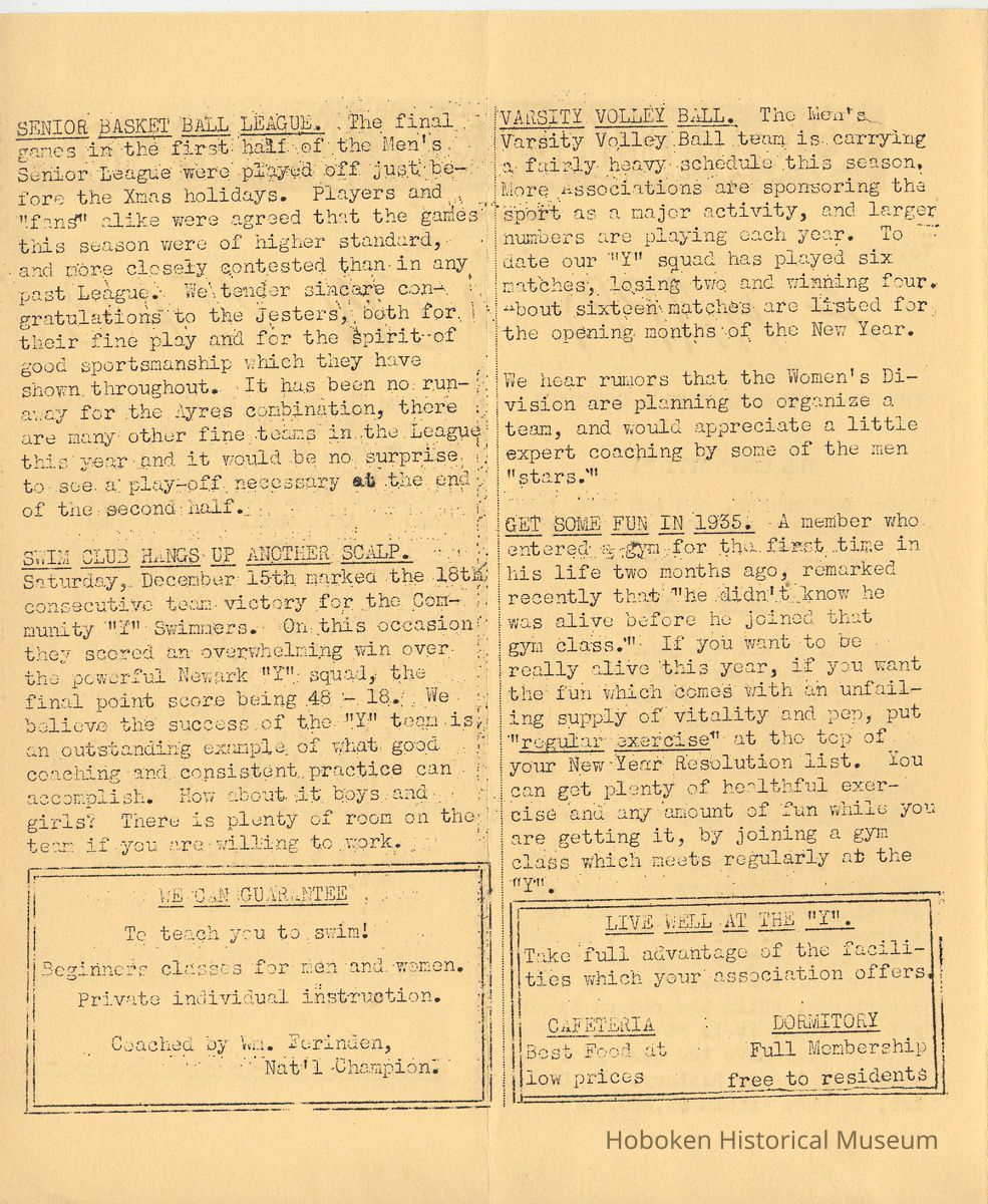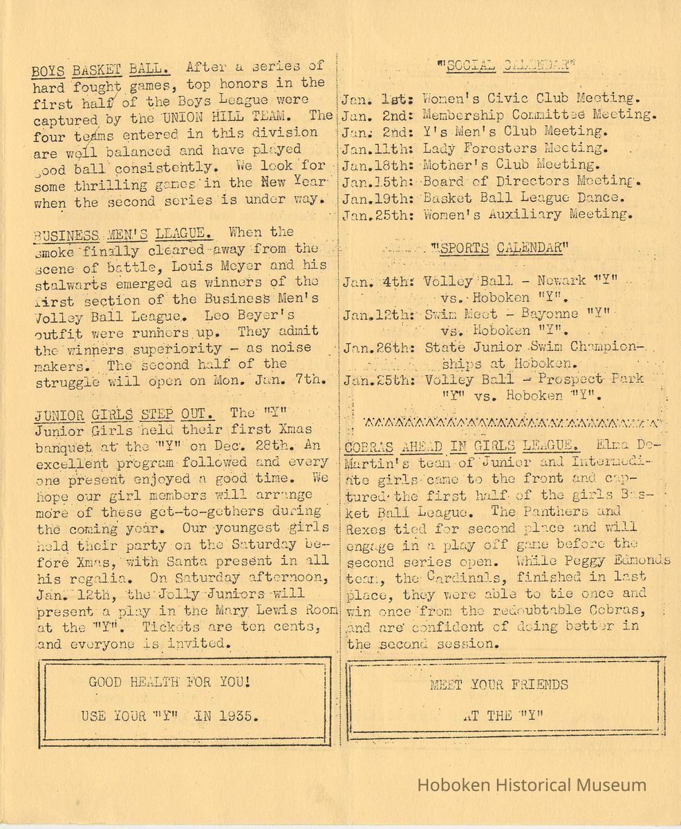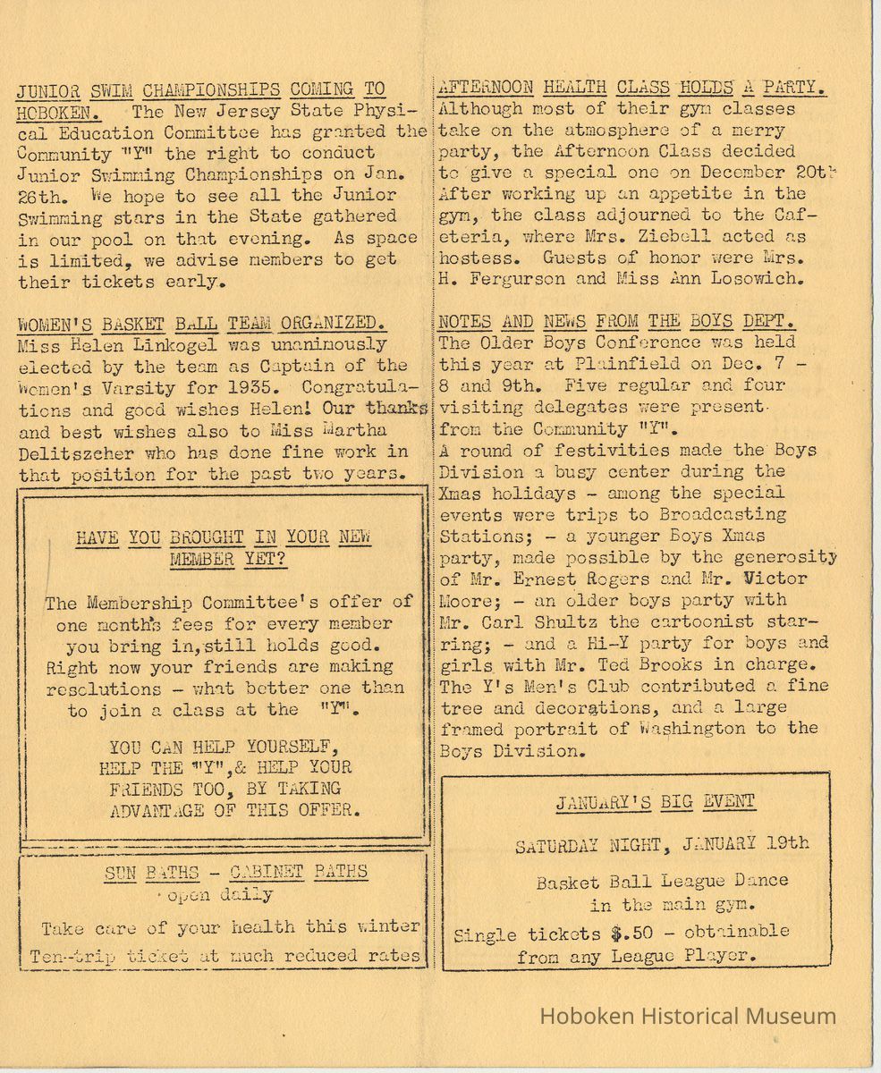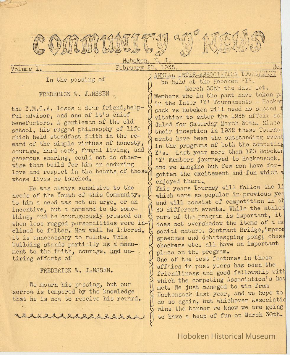 Newsletter: Community "Y" News, Hoboken N.J. Vol. 1, Nos. 2 - 7; Dec. 1934-May 1935. Hoboken YMCA.