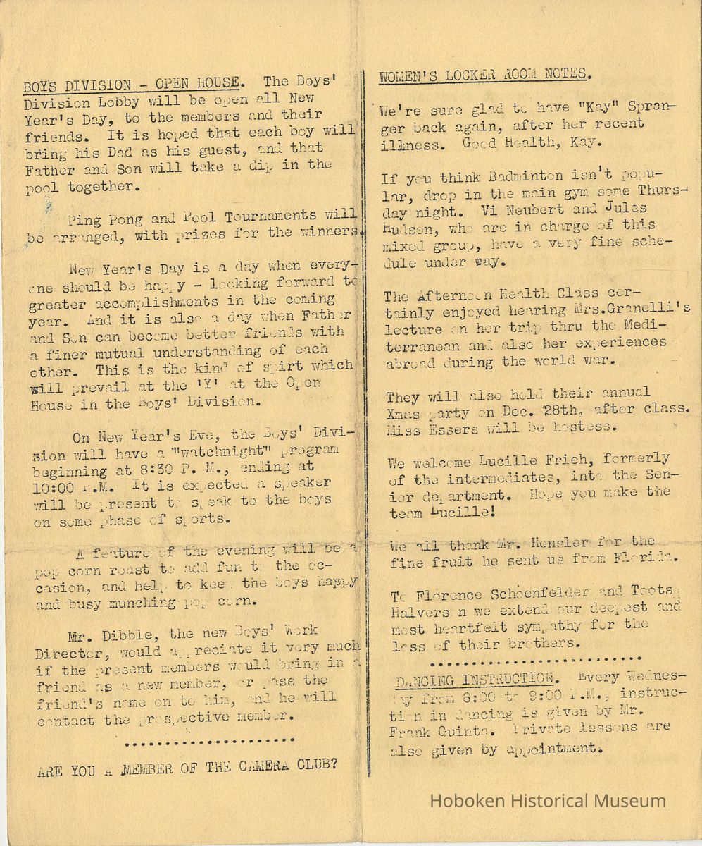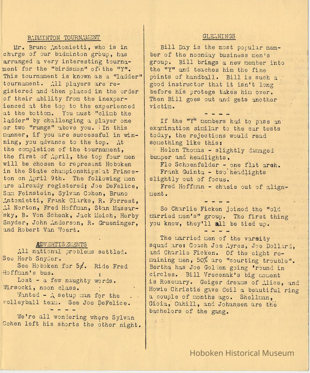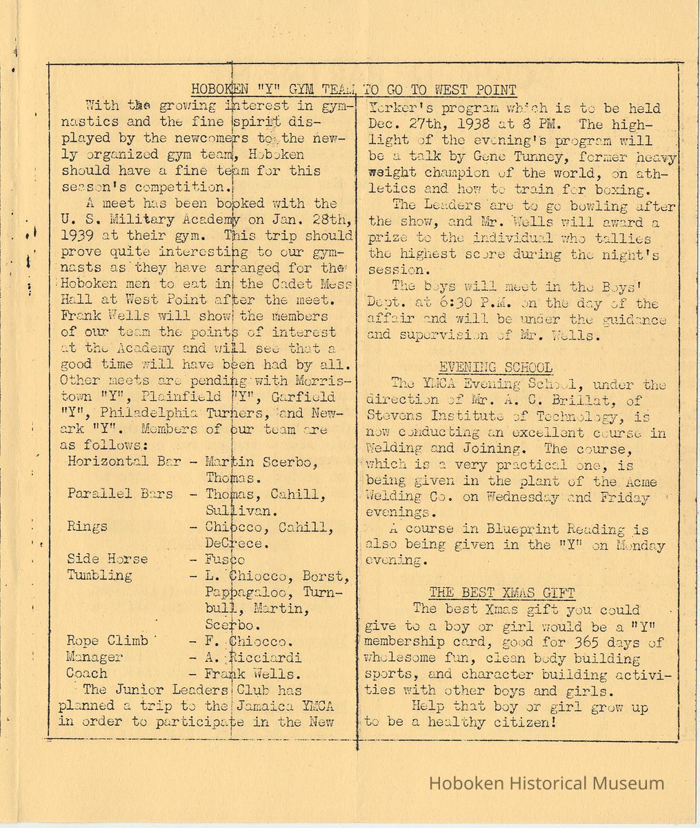 Notes: Archives 2001.126.0061 - Community 'Y" News; selected text from only issues available of volumes 2, 3 and 4 with an emphasis on individual names found. v.2, no. 3 March 1, 1936 pg [2] Gymnastic Exhibition; Rene Korn; Batt Masian's Orchestra pg [2] Swimming; Martha Spyksma; Henry Wigand; Frank Parot pg [3] Ruby M. Jolliffo; Donald Forons; Herbert Lohman; Richard Stolsman; Ivan Pearce pg [4] Marie Braun; Virginia McBride; Martha Dolitszchor v.2, no. 5 Dec. 31, 1936 pp [2-3] massage and ultraviolet rays; solarium; infra-red lamps; electric cabinet baths; massage - rubs; Director Heath Services: Lewis Weissman, Masseur. Includes list of rates for various services Sun Bath 50 cents Ticket of 12 exposures $5.00 Infra-Red Ray Radiation .50 Electric Cabinet Bath .50 (All the former, available on $5.00 ticket) Light Massage $1.00 Ticket of 12 $10.00 pg [4] Women's Locker Room Notes: "Kay" Spangler; Vi Neubert; Jules Hulson; Lucille Frieh; Florence Schoenfelder and Toots Halvers … heartfelt sympathy for the loss of their brothers. pg [4] Dancing Instruction; Frank Guinta v. 3, no. 2 March 1, 1938 pg [2] Evening School; first class in welding; in plant of Atlas Welding Co.; a new class in Blueprint Reading … Mr. A.C. Brillat of the teaching staff of Stevens Institute of Technology is the instructor. On to Princeton: Wally Geiger; Bill Wigginton, physical director; Bill Feinden; Joe Ayres - basketball; Joe DeFelice volleyball; Mike Carbone - fencers; Bruno Antonietti - badminton pg [3] badminton tournament: Bruno Antonietti; Joe DeFelice; Sam Feinstein, Sylvan Cohen, Frank Clarke; R. Forrest; Al Norton; Fred Hoffman; Stan Massarsky; B. Von Schenk; Jack Meich; Herby Snyder; John Anderson; R. Grueninger; Robert Van Woert; Gleanings: Bill Day; Helen Thomas; Flo Schoenfelder; Frank Guinta; Fred Hoffman; Charlie Fickson; Joe Ayres; Joe Dollard; Bill Vrecenak; Howie Christie. pg[4] Charlie Hansen; Tom Kelly; Irwin Brunjes; Thomas Ewen; Robert Jansen; James Pflugh; Ernest Anderson v. 3, no. 3 April 1, 1938 pg [2] Rose Routar; Floe Schoenfeld pg [3] Mrs. Charles Jewell; Blueprint Reading - Mr. A.C. Brillat; Our Fencing Team - Mike DePasquale; Michael Carbone; Edward D'Antonio; defeated Stevens Institute team 6-3 Evening School Extention [sic] Course in Welding - Oxy-Acetylene; Electric Welding pg[4] swim meet: William Allen; Ronald Mack; Thomas Turnbull; Harold Busch; Lou Chiocco; Peter Moeller; Bill Hamilton; Maver Bradley new members: Melvin Wall, Floyd Murphy; Salvatore Izzo; Kurt Muller; Steve Capiello [Cappiello?] tournatments: Louis Chiocco won checker and pool; David Korenstein - ping pong v. 4, no. 4 Dec. 20, 1938 pg [3] gymnastics team meet with U.S. Military Academy, West Point; manager A. Ricciardi; coach Frank Wells pg[4] Jean Harrison; Pauline Monaco; Michael Chiocco; Fred Kochendorfer; Dan Arnhols [end] Status: OK Status By: dw Status Date: 2011-04-22