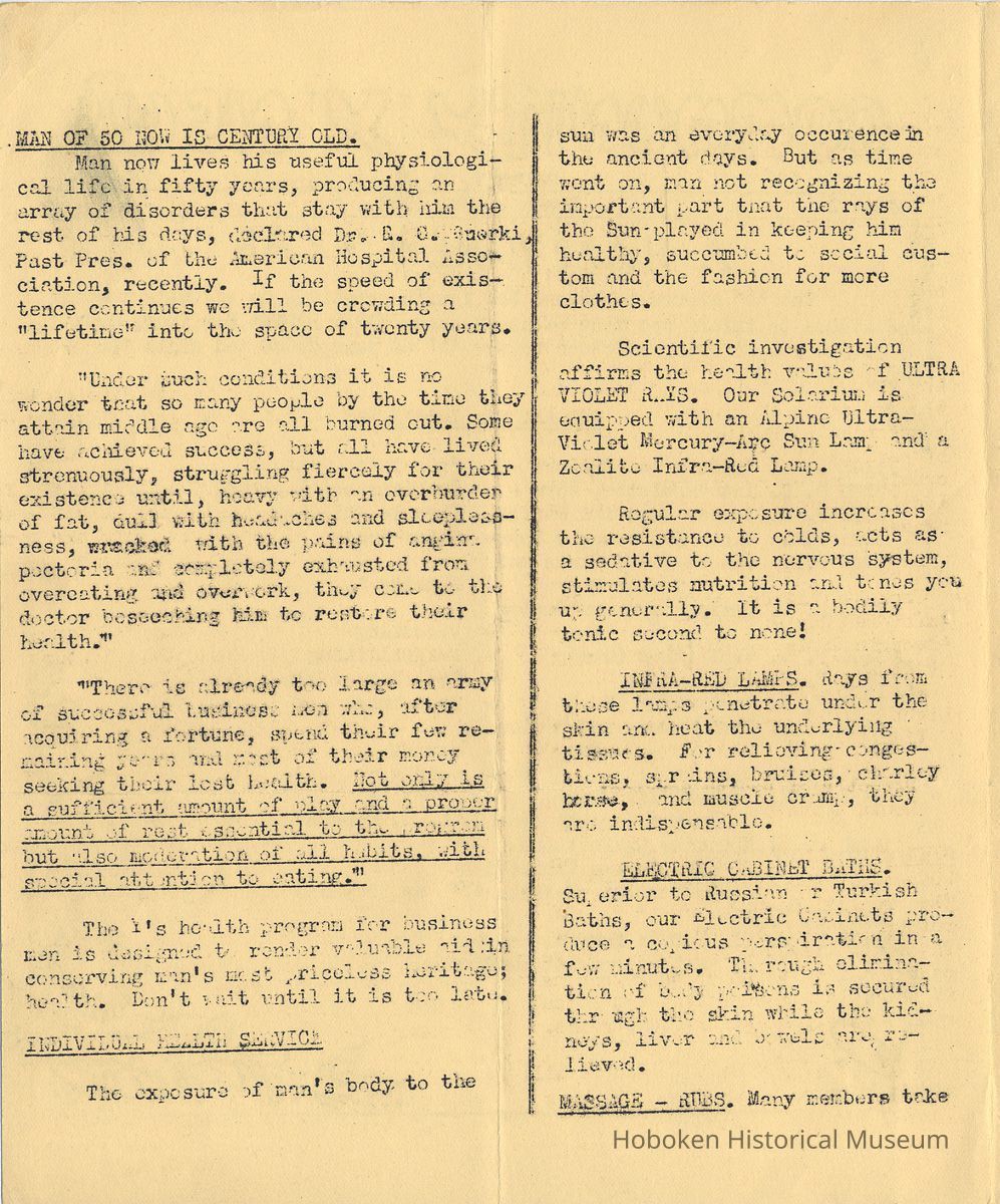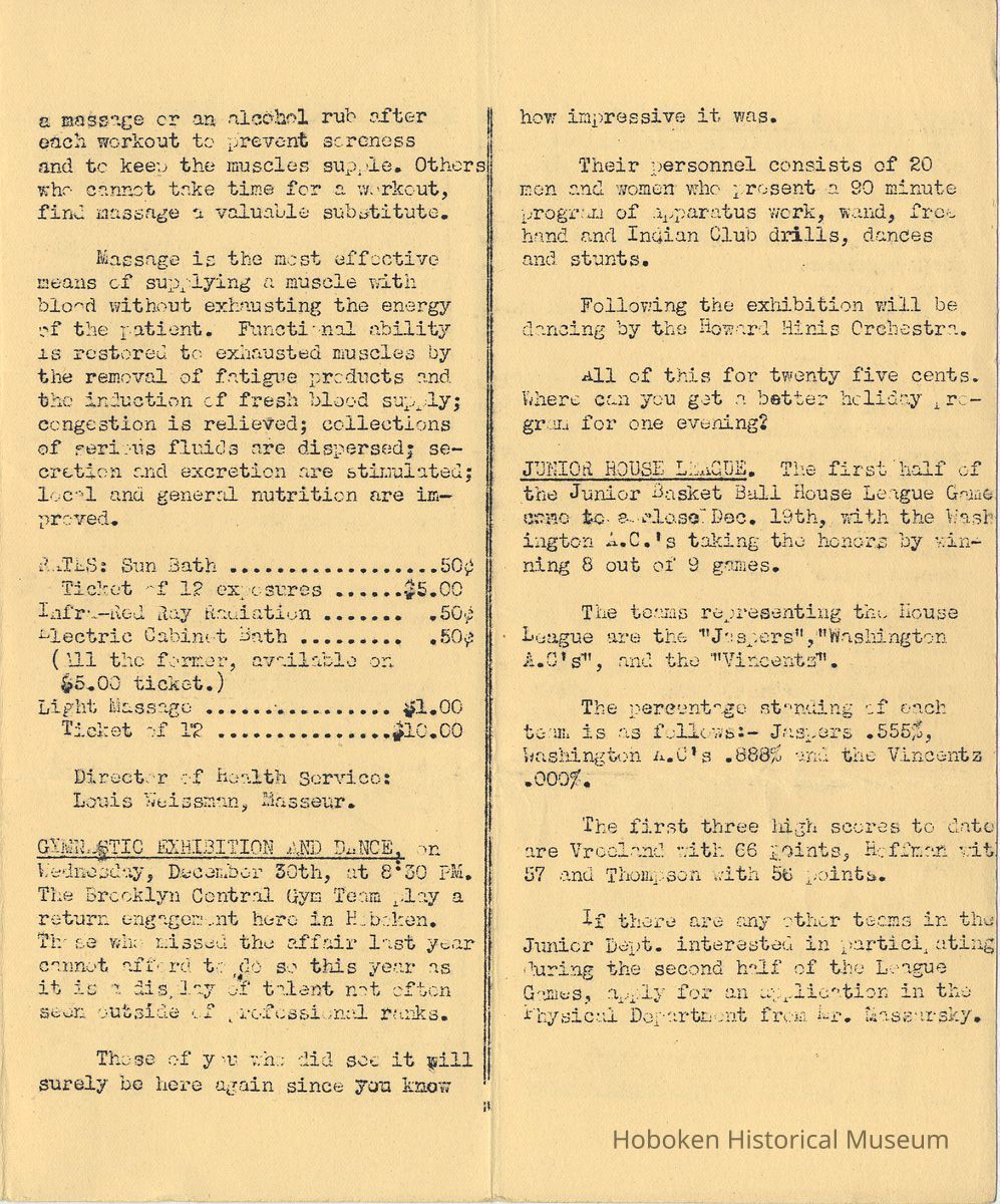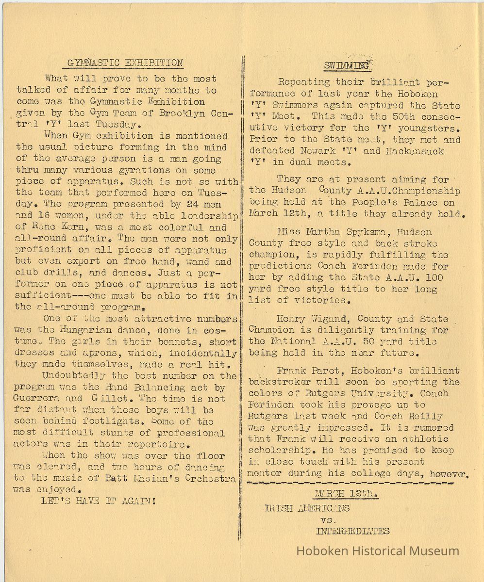 Notes: Archives 2001.126.0061 - Community 'Y" News; selected text from only issues available of volumes 2, 3 and 4 with an emphasis on individual names found. v.2, no. 3 March 1, 1936 pg [2] Gymnastic Exhibition; Rene Korn; Batt Masian's Orchestra pg [2] Swimming; Martha Spyksma; Henry Wigand; Frank Parot pg [3] Ruby M. Jolliffo; Donald Forons; Herbert Lohman; Richard Stolsman; Ivan Pearce pg [4] Marie Braun; Virginia McBride; Martha Dolitszchor v.2, no. 5 Dec. 31, 1936 pp [2-3] massage and ultraviolet rays; solarium; infra-red lamps; electric cabinet baths; massage - rubs; Director Heath Services: Lewis Weissman, Masseur. Includes list of rates for various services Sun Bath 50 cents Ticket of 12 exposures $5.00 Infra-Red Ray Radiation .50 Electric Cabinet Bath .50 (All the former, available on $5.00 ticket) Light Massage $1.00 Ticket of 12 $10.00 pg [4] Women's Locker Room Notes: "Kay" Spangler; Vi Neubert; Jules Hulson; Lucille Frieh; Florence Schoenfelder and Toots Halvers … heartfelt sympathy for the loss of their brothers. pg [4] Dancing Instruction; Frank Guinta v. 3, no. 2 March 1, 1938 pg [2] Evening School; first class in welding; in plant of Atlas Welding Co.; a new class in Blueprint Reading … Mr. A.C. Brillat of the teaching staff of Stevens Institute of Technology is the instructor. On to Princeton: Wally Geiger; Bill Wigginton, physical director; Bill Feinden; Joe Ayres - basketball; Joe DeFelice volleyball; Mike Carbone - fencers; Bruno Antonietti - badminton pg [3] badminton tournament: Bruno Antonietti; Joe DeFelice; Sam Feinstein, Sylvan Cohen, Frank Clarke; R. Forrest; Al Norton; Fred Hoffman; Stan Massarsky; B. Von Schenk; Jack Meich; Herby Snyder; John Anderson; R. Grueninger; Robert Van Woert; Gleanings: Bill Day; Helen Thomas; Flo Schoenfelder; Frank Guinta; Fred Hoffman; Charlie Fickson; Joe Ayres; Joe Dollard; Bill Vrecenak; Howie Christie. pg[4] Charlie Hansen; Tom Kelly; Irwin Brunjes; Thomas Ewen; Robert Jansen; James Pflugh; Ernest Anderson v. 3, no. 3 April 1, 1938 pg [2] Rose Routar; Floe Schoenfeld pg [3] Mrs. Charles Jewell; Blueprint Reading - Mr. A.C. Brillat; Our Fencing Team - Mike DePasquale; Michael Carbone; Edward D'Antonio; defeated Stevens Institute team 6-3 Evening School Extention [sic] Course in Welding - Oxy-Acetylene; Electric Welding pg[4] swim meet: William Allen; Ronald Mack; Thomas Turnbull; Harold Busch; Lou Chiocco; Peter Moeller; Bill Hamilton; Maver Bradley new members: Melvin Wall, Floyd Murphy; Salvatore Izzo; Kurt Muller; Steve Capiello [Cappiello?] tournatments: Louis Chiocco won checker and pool; David Korenstein - ping pong v. 4, no. 4 Dec. 20, 1938 pg [3] gymnastics team meet with U.S. Military Academy, West Point; manager A. Ricciardi; coach Frank Wells pg[4] Jean Harrison; Pauline Monaco; Michael Chiocco; Fred Kochendorfer; Dan Arnhols [end] Status: OK Status By: dw Status Date: 2011-04-22