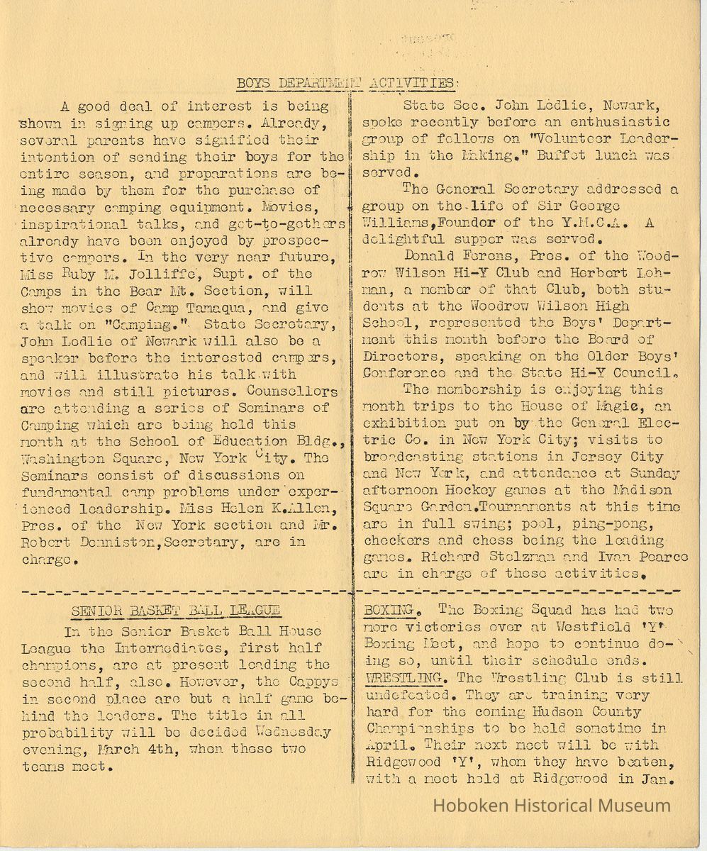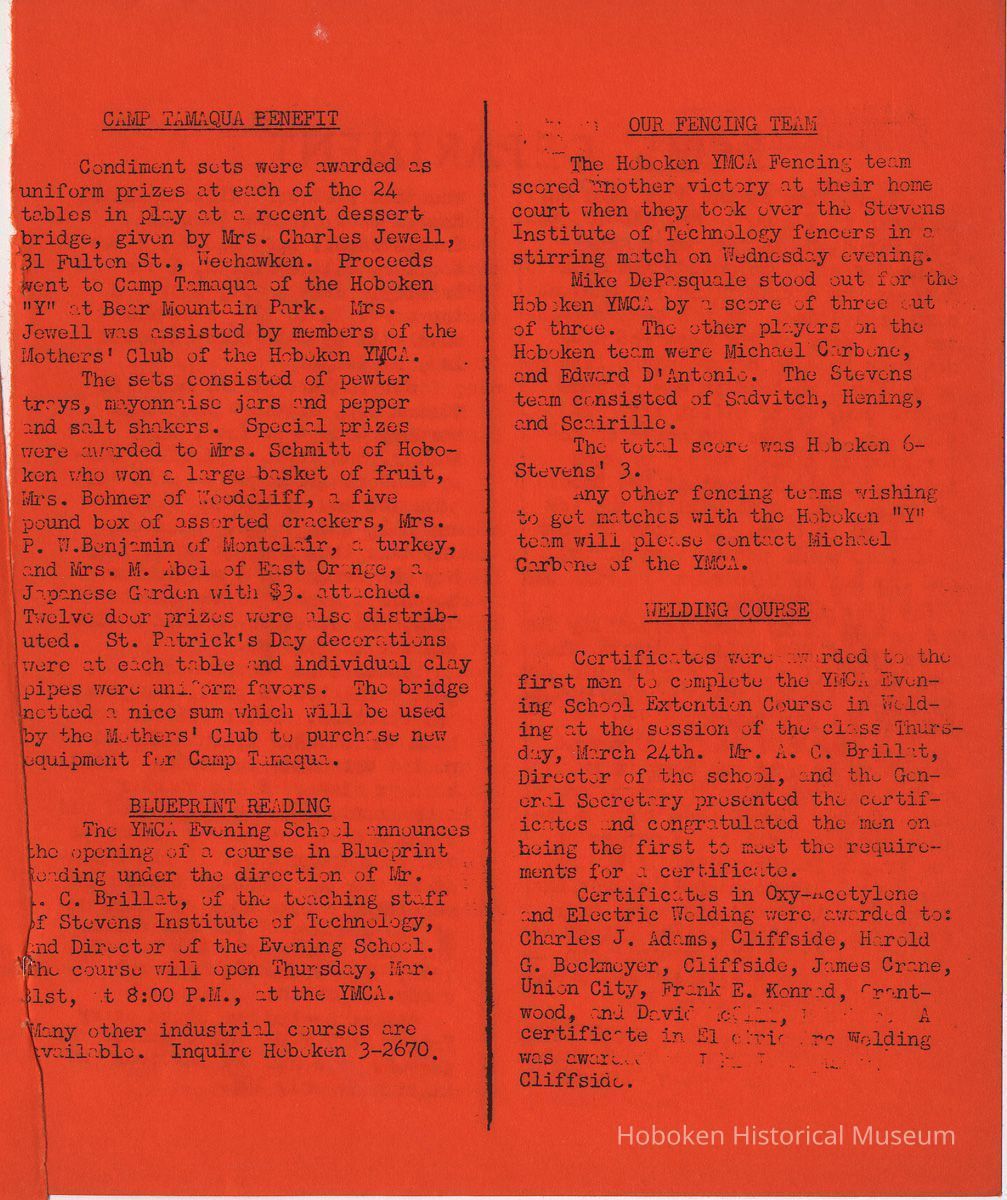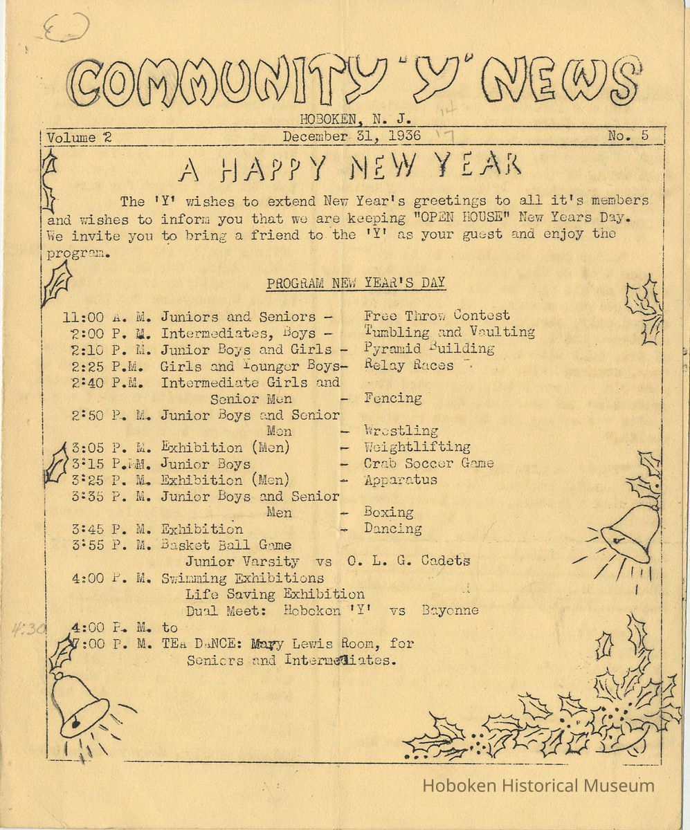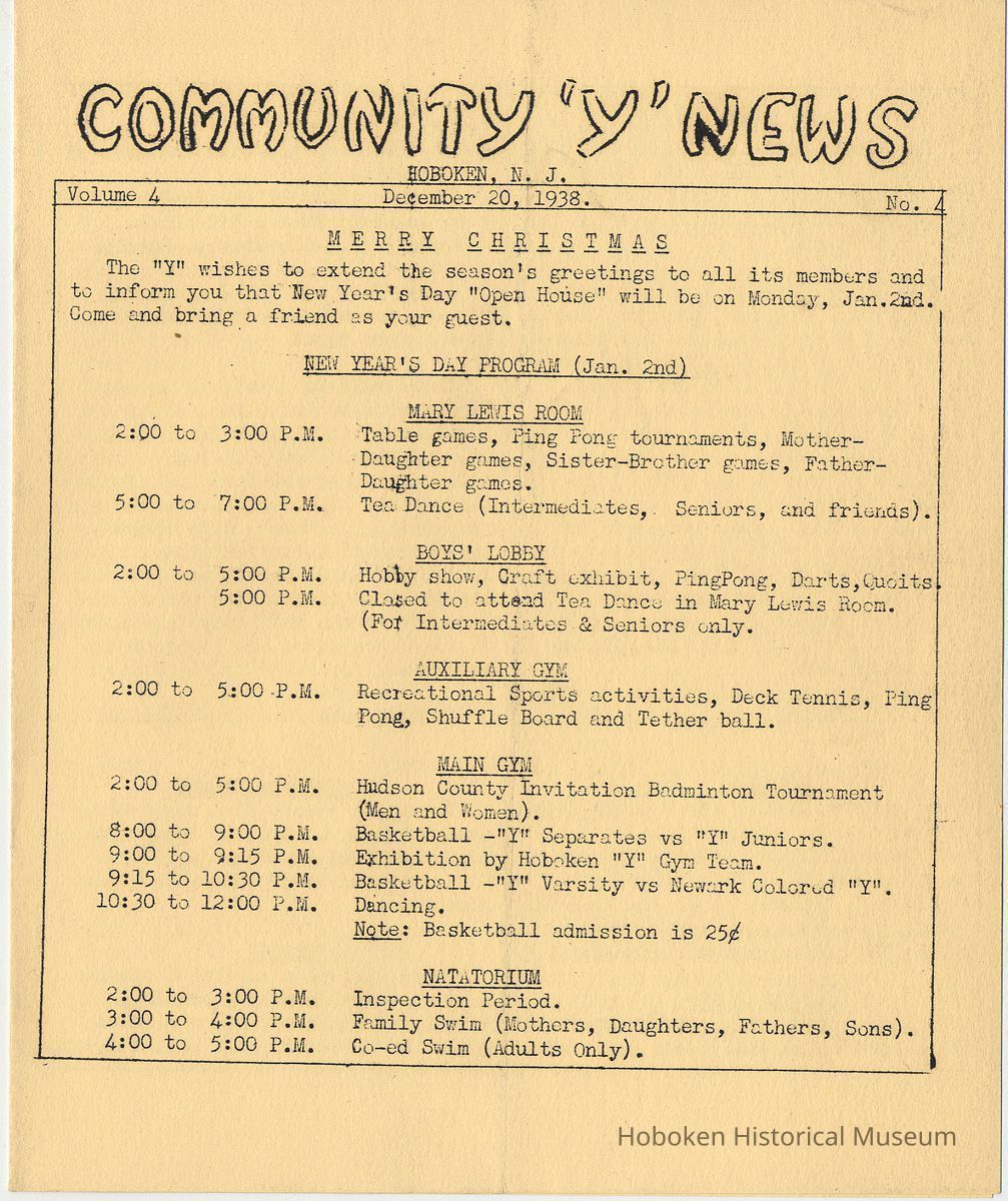 Newsletter: Community "Y" News, Hoboken N.J. Five issues; 1936, 1938. Hoboken YMCA.