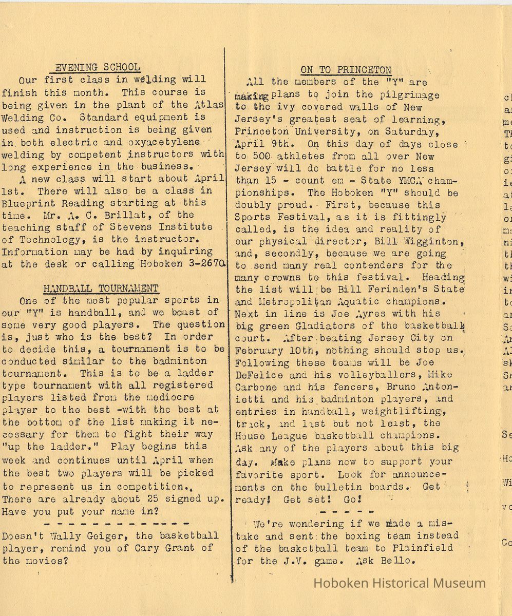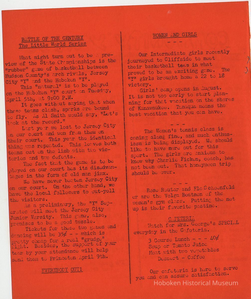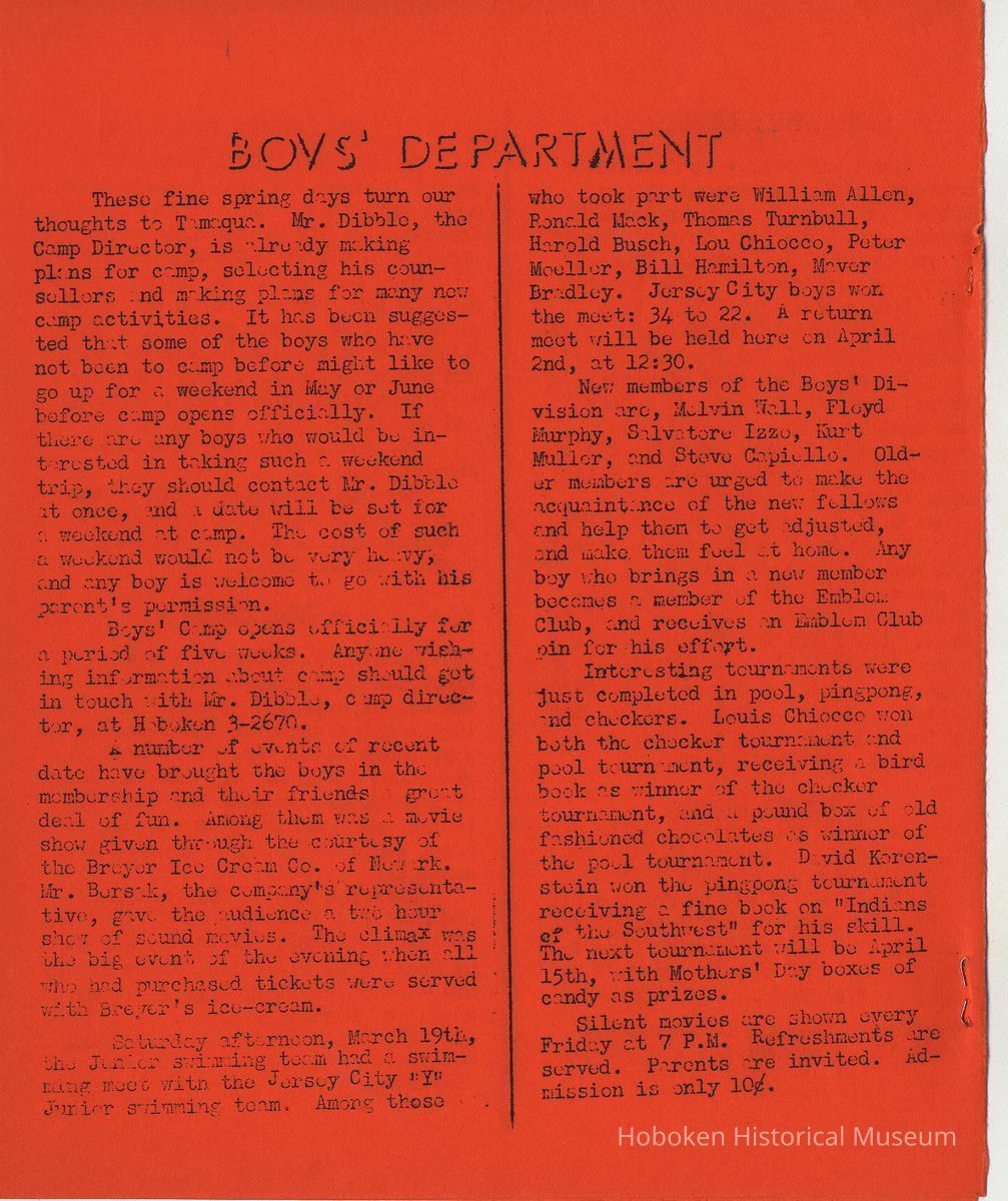 Newsletter: Community "Y" News, Hoboken N.J. Five issues; 1936, 1938. Hoboken YMCA.