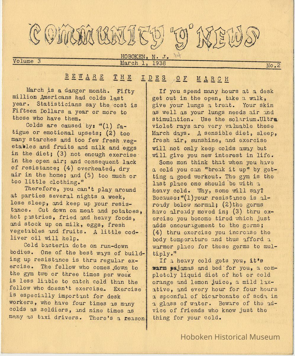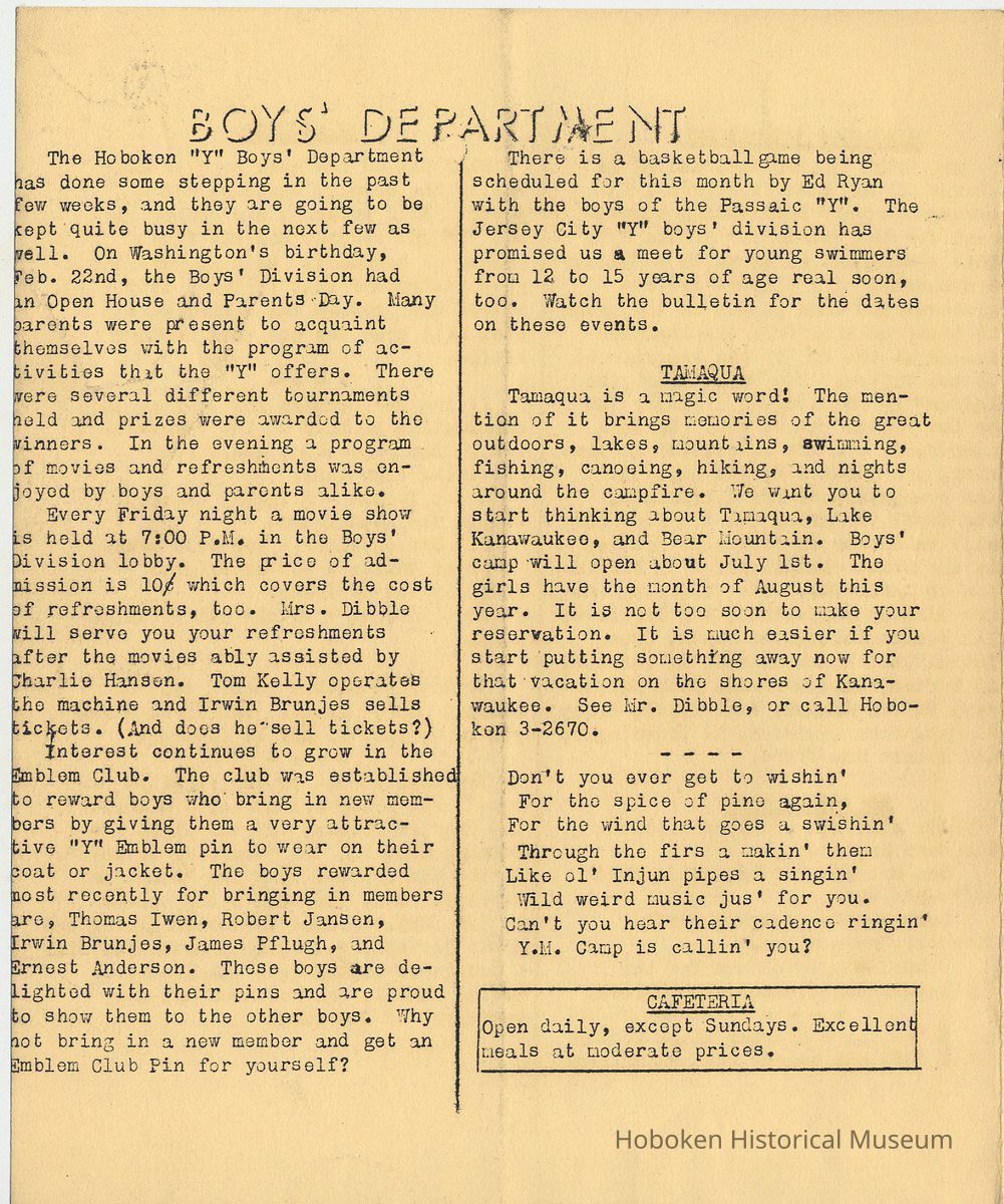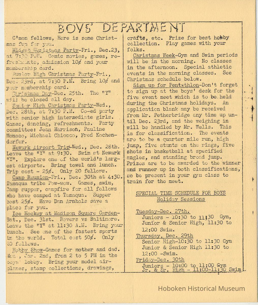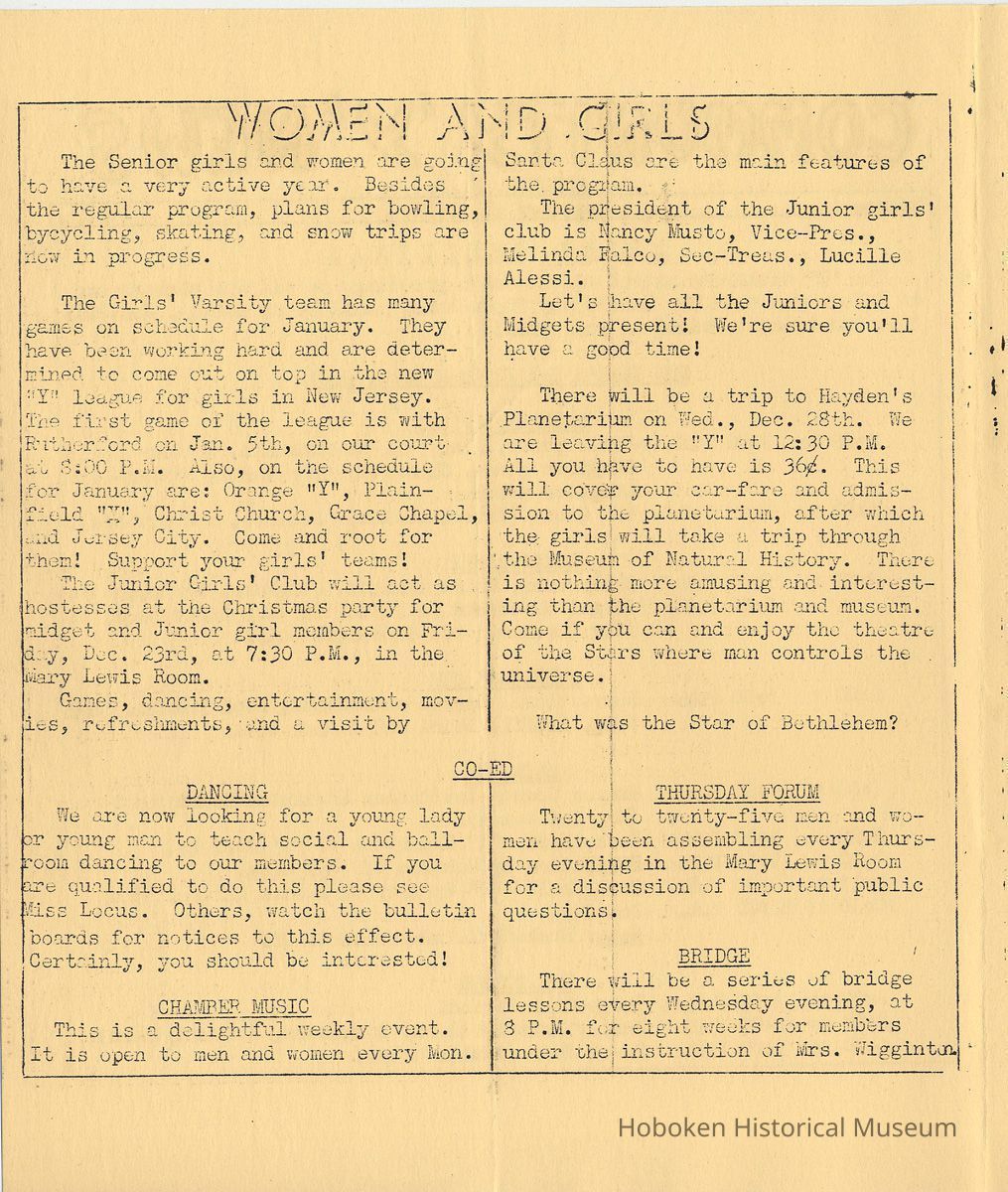 Newsletter: Community "Y" News, Hoboken N.J. Five issues; 1936, 1938. Hoboken YMCA.