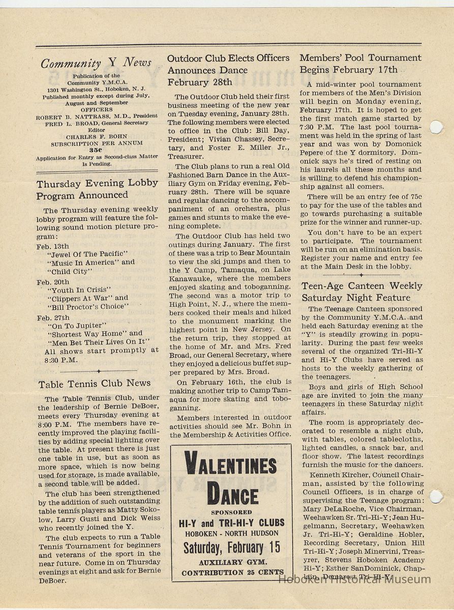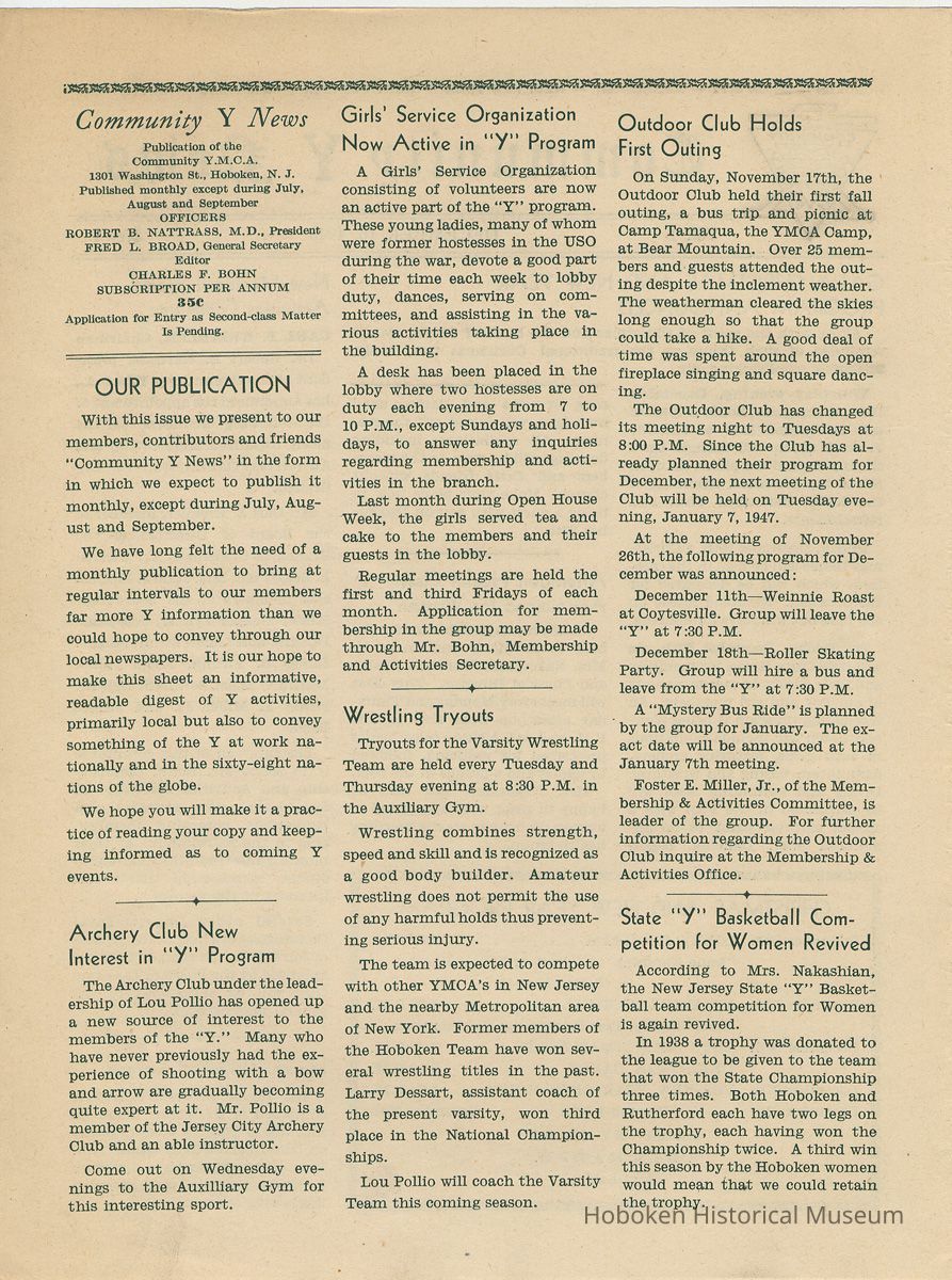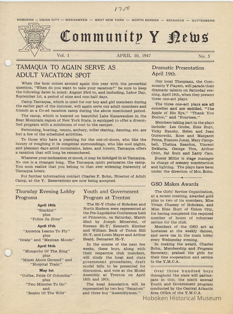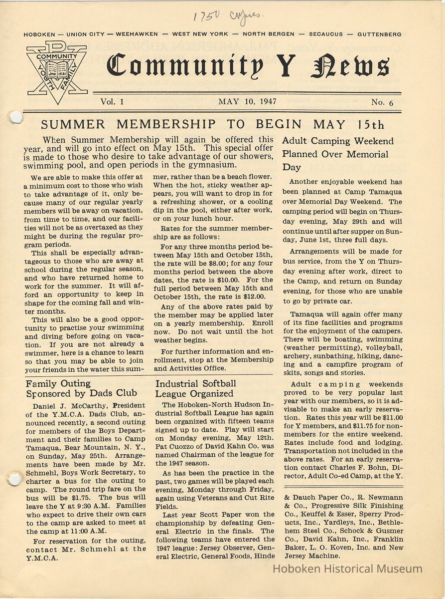 Newsletter: Community Y News, Hoboken N.J. Vol. 1, Nos. 1 to 6 [Second Series], Dec. 1946 - May 1947.[Published by the Young Men's Christian Association, 1301 Washington St., Hoboken] Single folio, 7" x 9-7/8" high. Some issues were three-hole punched.