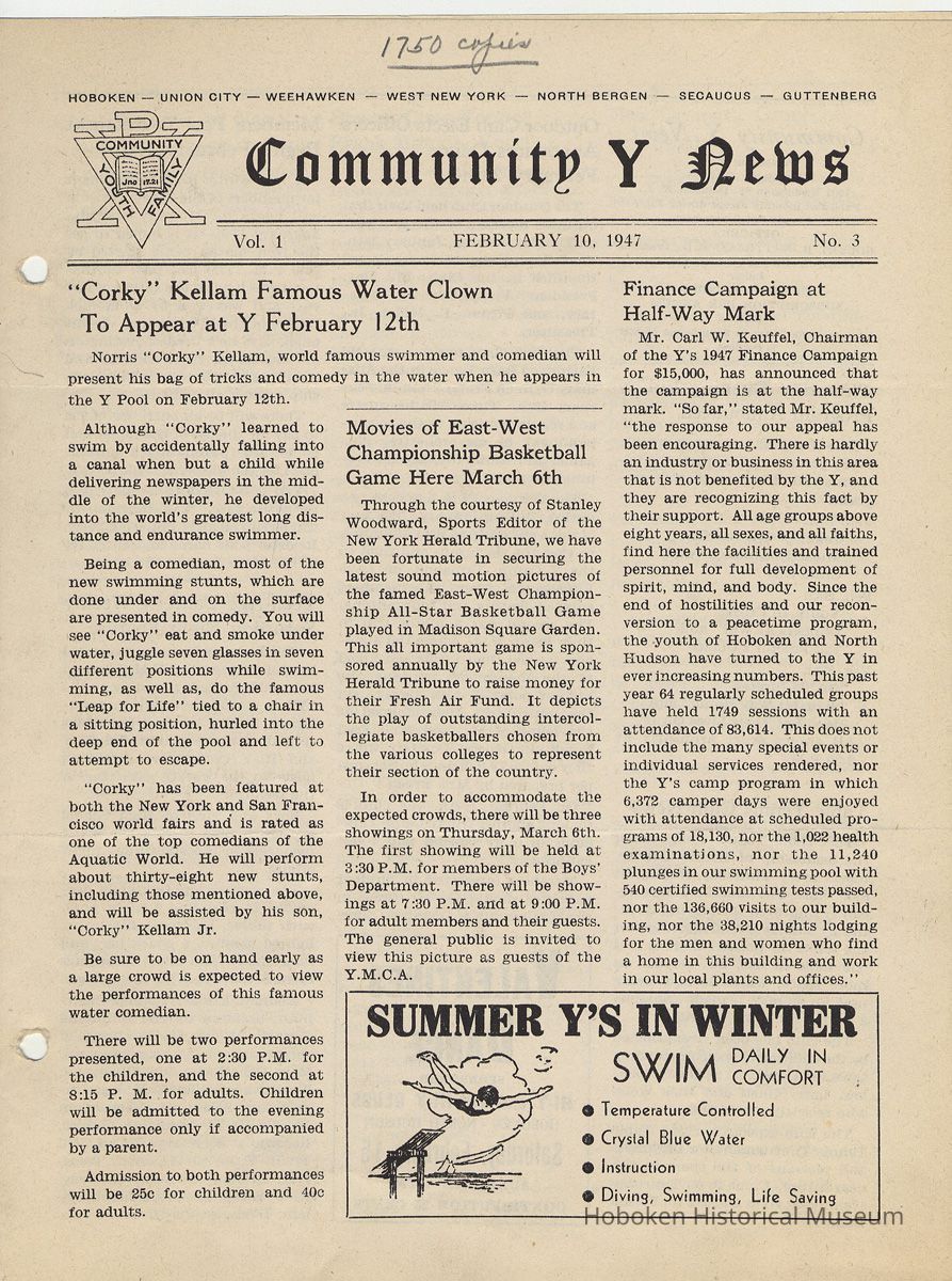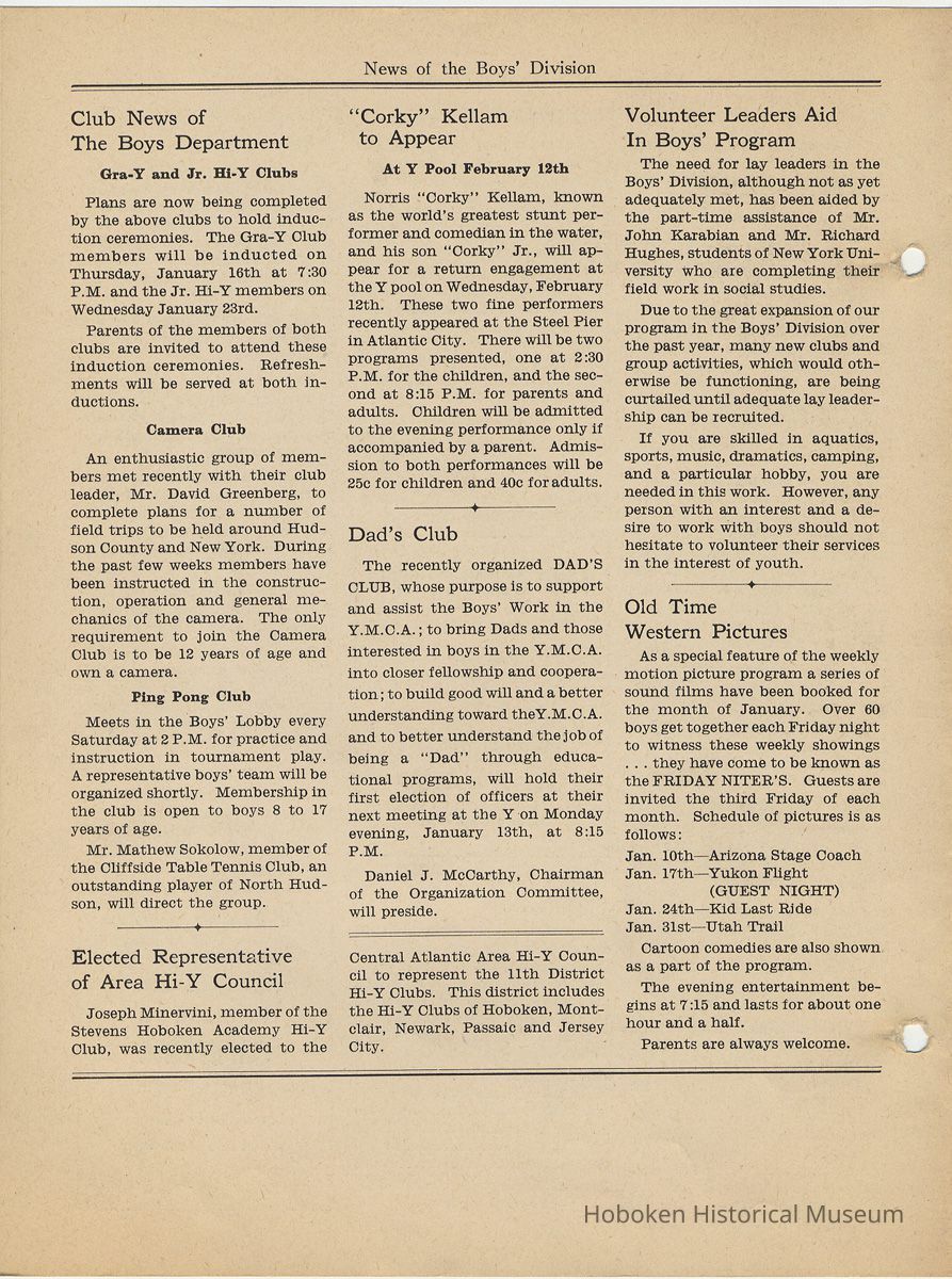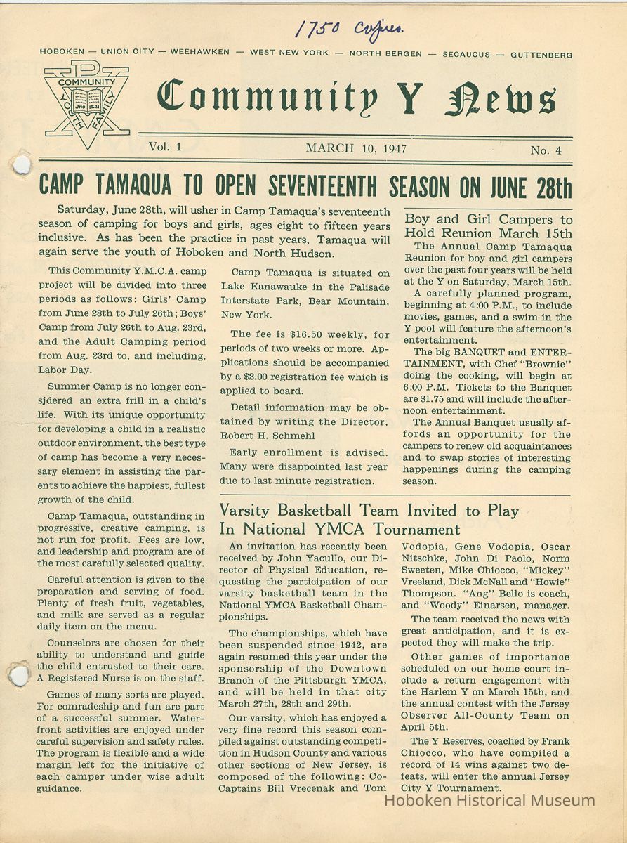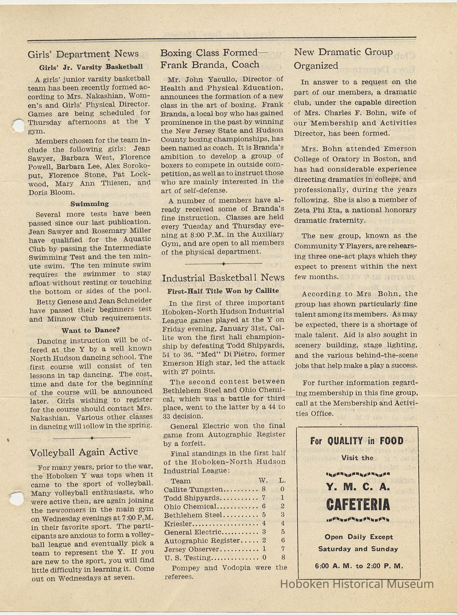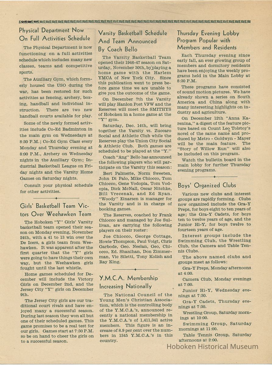 Newsletter: Community Y News, Hoboken N.J. Vol. 1, Nos. 1 to 6 [Second Series], Dec. 1946 - May 1947.[Published by the Young Men's Christian Association, 1301 Washington St., Hoboken] Single folio, 7" x 9-7/8" high. Some issues were three-hole punched.