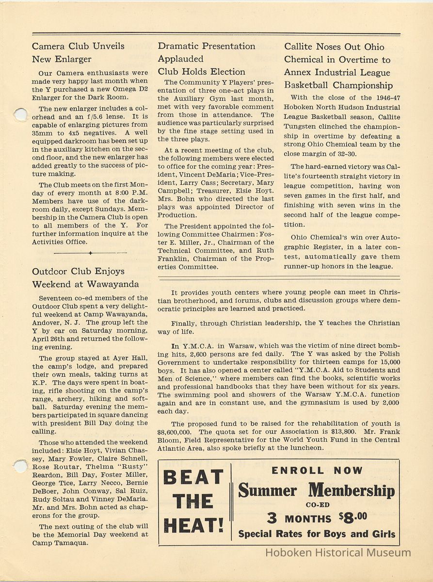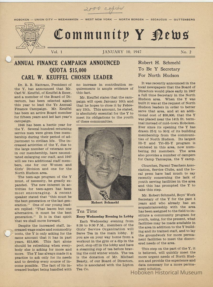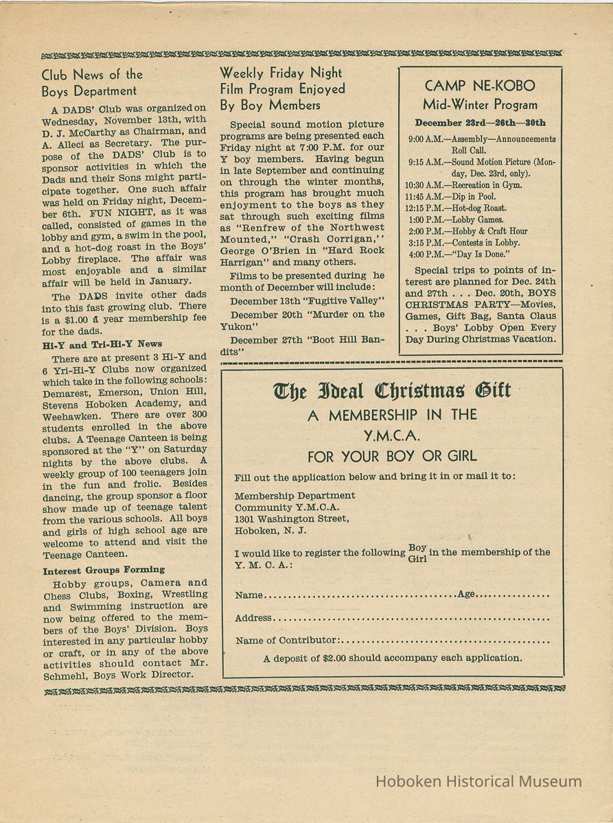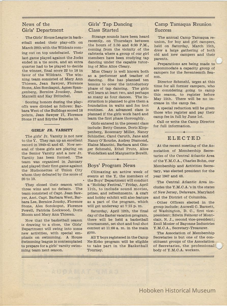 Newsletter: Community Y News, Hoboken N.J. Vol. 1, Nos. 1 to 6 [Second Series], Dec. 1946 - May 1947.[Published by the Young Men's Christian Association, 1301 Washington St., Hoboken] Single folio, 7" x 9-7/8" high. Some issues were three-hole punched.