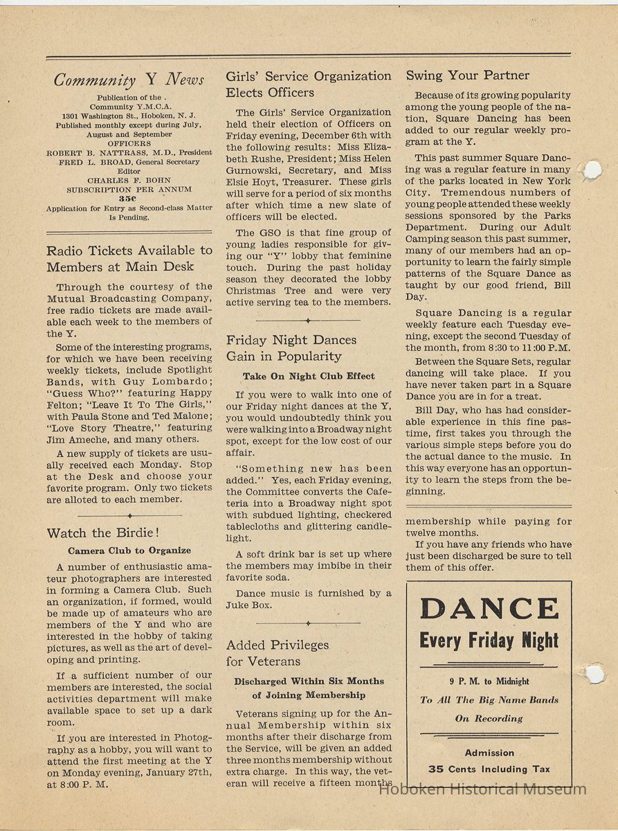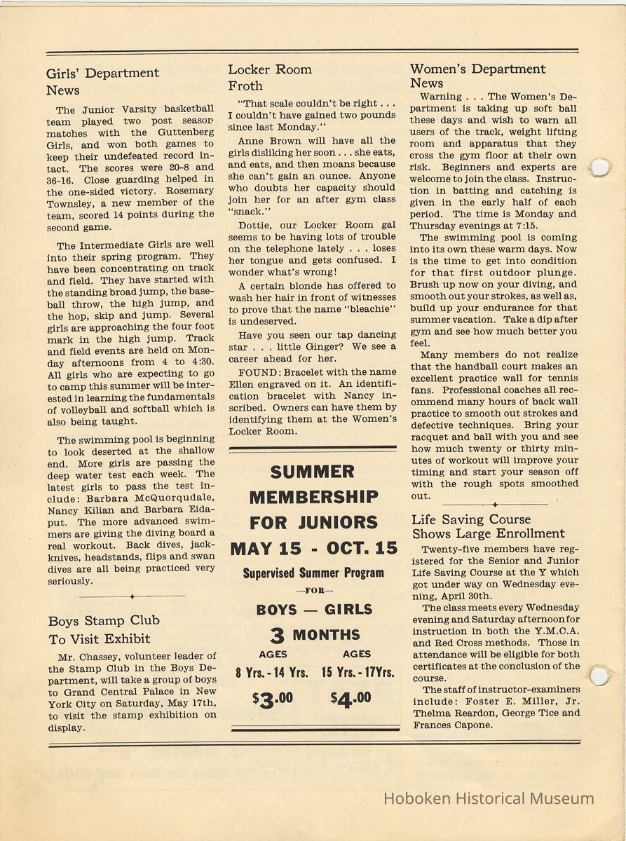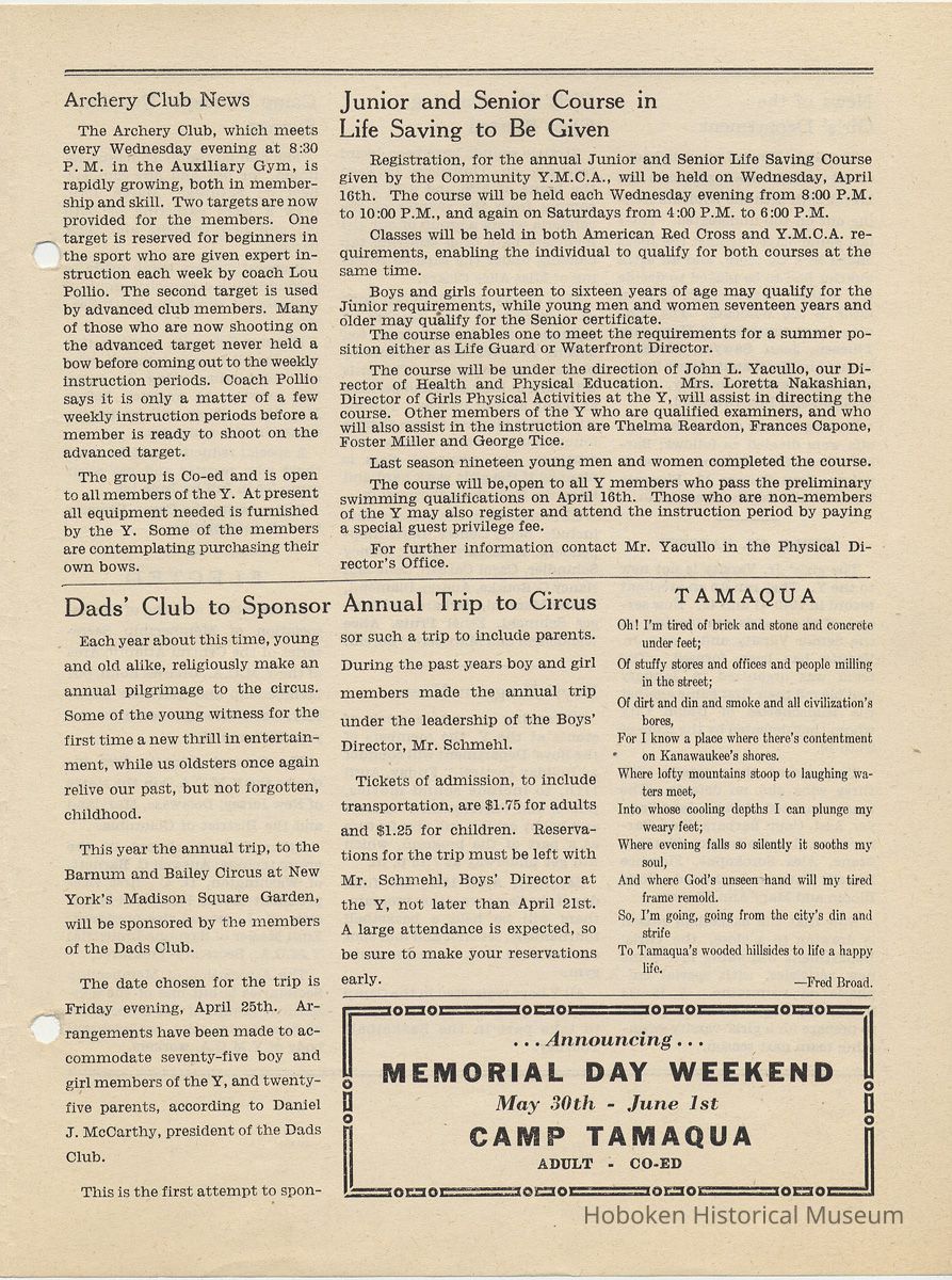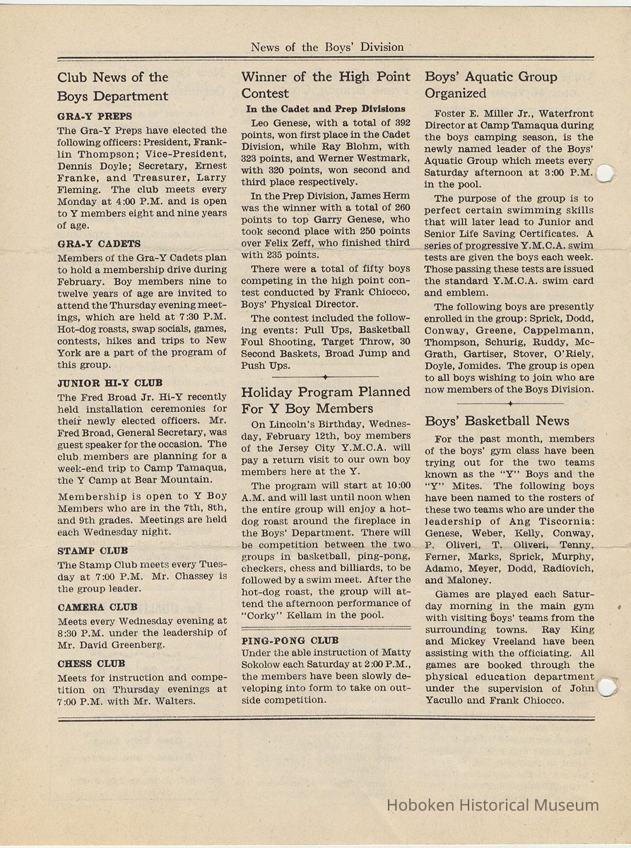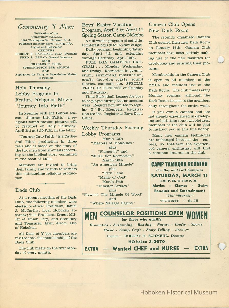 Newsletter: Community Y News, Hoboken N.J. Vol. 1, Nos. 1 to 6 [Second Series], Dec. 1946 - May 1947.[Published by the Young Men's Christian Association, 1301 Washington St., Hoboken] Single folio, 7" x 9-7/8" high. Some issues were three-hole punched.