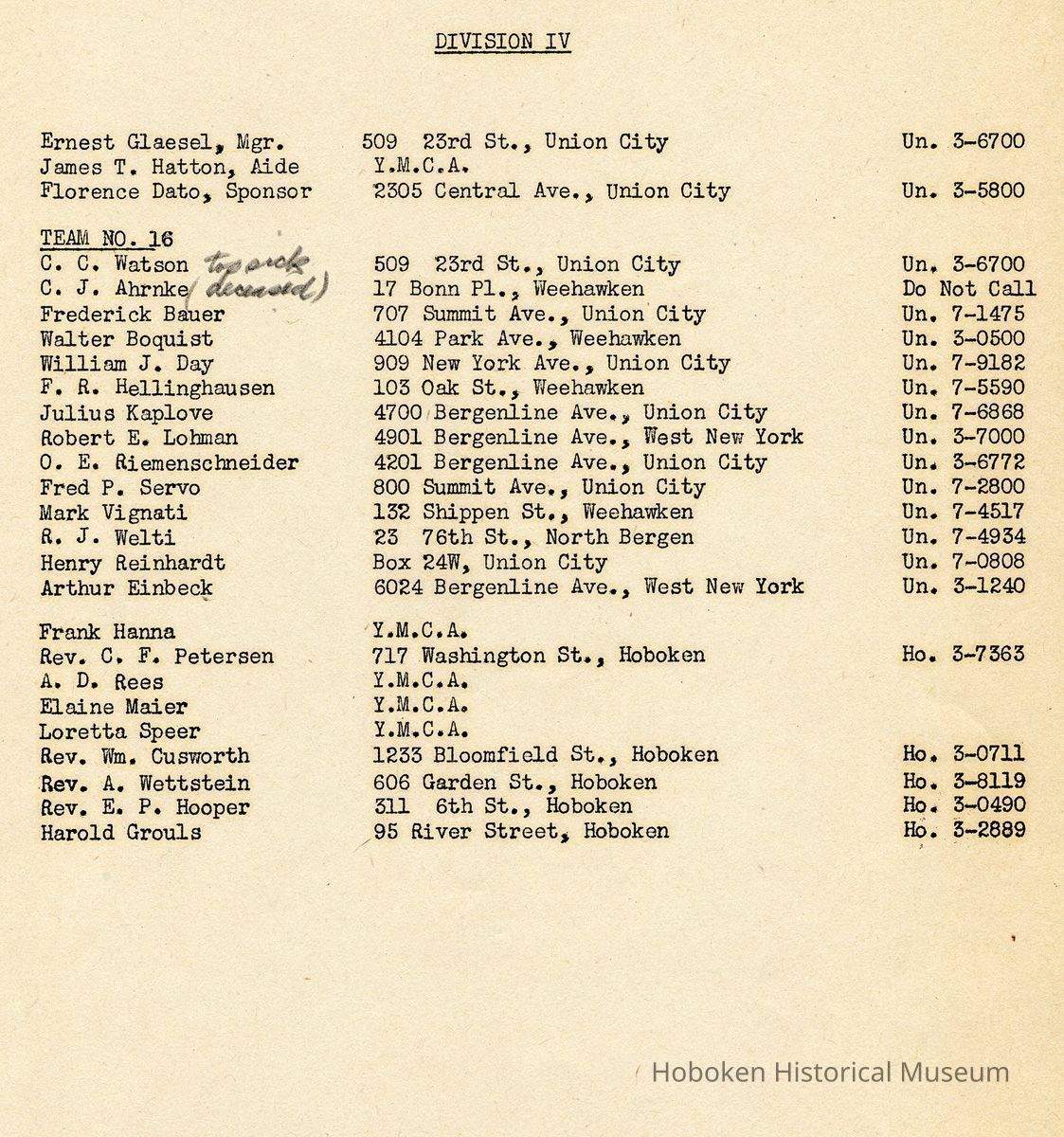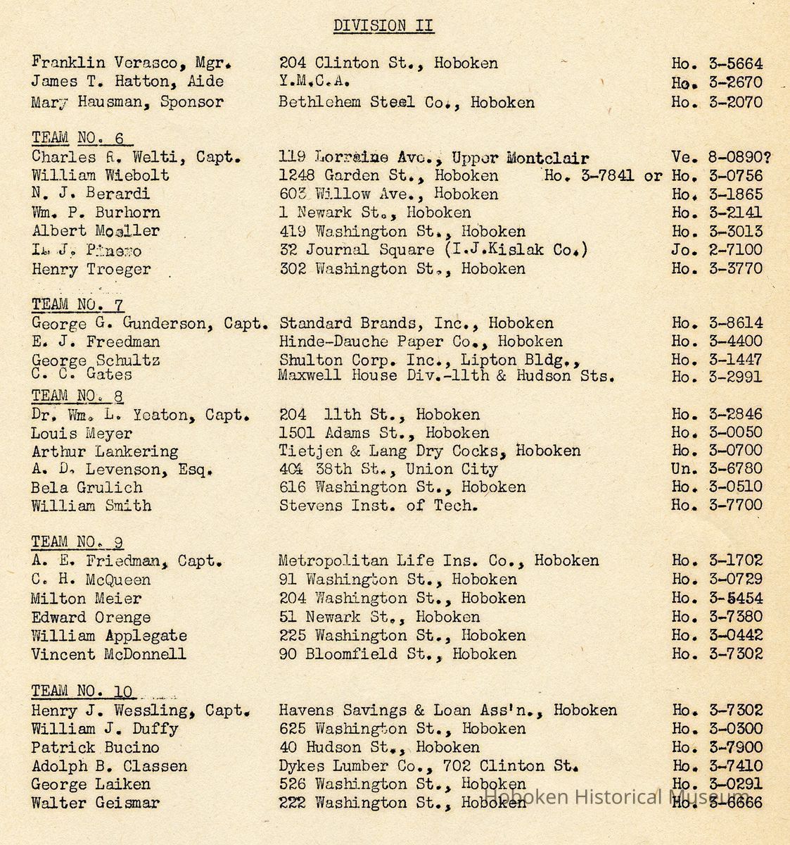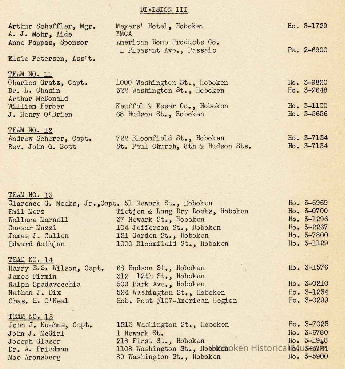 Notes: archives 2001.126.0084 Community Y.M.C.A. Campaign Organization, February 10th -18th, 1941. Max Z. Hurwitz, General Chairman. Fred L. Broad, Executive Secretary. INITIAL GIFTS NAME ADDRESS •PHONE NO. George G. Raymond, Chairman Tietjen & Lang Dry Docks 17th St. & Park Ave., Hoboken Ho. 3-0700 Louis Schelling Vice-Chairman 754 Willow Ave., Hoboken Carl W. Keuffel, Vice-Chairman 300 Adams St., Hoboken Ho. 3-7337 Ho. 3-1100 Fred L. Broad, Executive Secretary YMCA Ho. 3-2670 Anne Parsek, Sponsor 5709 Hudson Ave., West New York Un. 3-8495 Max Z. Hurwitz 416 Washington St., Hoboken Ho. 3-2963 Carl Ahrnke 17 Bonn Pl., Weehawken Do Not Phone John B, Applegate 1 Newark St., Hoboken Ho. 3-0383 Eugene H. Magee 56 Newark St., Hoboken Ho. 3-2861 Louis Meyer Hob, White Lead & Color Works 15th & Adams Sts., Hoboken Ho. 3-0050 Dr. R. B. Nattrass 204 11th St., Hoboken Ho. 3-0245 John D. Pierson 84 Washington St., Hoboken Ho. 3-1560 Anthony J. Volk, Jr. 653 Washington St., Hoboken Ho 3-0820 George Reilly 51 Newark St., Hoboken Ho. 3-1114 John L. Lewis 524 Park Ave., Hoboken Ho. 3-1966 Edward J. Murnane City Hall, Hoboken Ho. 3-0157-? ----- DIVISION I NAME ADDRESS TELEPHONE NO, John Soltman, Mgr. 1 Newark St., Hoboken Ho. 3-0500 Paul Schulz, Aide YMCA Ho. 3-2670 Mary Pappas, Sponsor 1412 Park Ave., Hoboken Ho. 3-2761 TEAM NOa 1 Edward A, Driscoll, Capt. 615 Washington St, Hoboken Ho. 3-7000 M„ L, Beasty Thomas J. Lipton Co., Inc. Hoboken Ho. 3-3300 John Crothers 615 Washington St„, Hoboken Ho. 3-7000 Dr. M, R. Olinger 326 Washington St., Hoboken Ho. 3-0750 Philip J. Reilly 1400 Washington St., Hoboken Ho. 3-0690 Charles Wester 615 Washington St., Hoboken Ho. 3-7000 TEAM NO, 2 Philip Bernheim, Capt. R. Neumann Co. 300 Observer Highway Ho. 3-3400 Hally Hatcher 1400 Washington St., Hoboken Ho. 3-0400 Otto Leimbacher Alco Gravure Co., 9th & Monroe Sts. Ho. 3-3800 Fred Janssen 109 Grand St,, Hoboken Ho. 3-2110 Arthur C. Stout 47 Newark St., Hoboken Ho. 3-3000 TEAM NO. 3 Theodore Furman, Capt, Seaboard Trust Co., 95 River St, Ho. 3-4200 James Creese Stevens Institute of Technology Ho. 3-7700 Herbert Snyder 61 Newark St., Hoboken Ho. 3-8740 Joseph A. Tighe Seaboard Trust Co., 95 River St. Ho. 3-4200 TEAM NOi 4 Guy Trisolini, Capt. 521 Washington St., Hoboken Ho. 3-1311 Arthur Geismar 222 Washington St., Hoboken Ho. 3-6666 Max Barondess 416 Washington St., Hoboken Ho. 3-9797 Thomas J. King 618 Washington St., Hoboken Ho. 3-2990 Edward Schroeder 640 Washington St., Hoboken Ho. 3-3713 TEAM NO. 5 Frank Basso„ Capt. Continental Baking Co., 14th & Park Ho. 3-7481 James Connell 84 Washington St., Hoboken Ho. 3-0942 Peter Daghlian 151 3rd St., Hoboken Ho. 3-5923 David Corcoran 1708 West St., Union City Bruno Omori 715 New York Ave., Union City Harry Ritter 116 68th St., Guttenberg ------- DIVISION II Franklin Verasco, Mgr. 204 Clinton St., Hoboken Ho. 3-5664 James T. Hatton, Aide Y.M.C.A. Ho. 3-2670 Mary Hausman, Sponsor Bethlehem Steel Co., Hoboken Ho. 3-2070 TEAM NO. 6 Charles R. Welti, Capt. 119 Lorraine Ave. Uppor Montclair Ve. 8-0890? William Wiebolt 1248 Garden St., Hoboken Ho. 3-7841 or Ho. 3-0756 N. J. Berardi 605 Willow Ave., Hoboken Ho. 3-1865 Wm. P. Burhorn 1 Newark St., Hoboken Ho. 3-2141 Albert Moeller 419 Washington St., Hoboken Ho. 3-3013 I. J. Pinero 32 Journal Square (I.J. Kislak Co.) Jo. 2-7100 Henry Troeger 302 Washington St,, Hoboken Ho. 3-3770 TEAM NO. 7 George G. Gunderson, Capt. Standard Brands, Inc., Hoboken Ho. 3-8614 E. J. Freedman Hinde-Dauche Paper Co., Hoboken Ho. 3-4400 George Schultz Shulton Corp. Inc., Lipton Bldg. Ho. 3-1447 C. C. Gates Maxwell House Div. -11th & Hudson Sts. Ho. 3-2991 TEAM NO.8 Dr. Wm. L. Yeaton, Capt. 204 11th St., Hoboken Ho. 3-2846 Louis Meyer 1501 Adams St., Hoboken Ho. 3-0050 Arthur Lankering Tietjen & Lang Dry Docks, Hoboken Ho. 3-0700 A. D. Levenson, Esq. 404 38th St., Union City Un. 3-6780 Bela Grulich 616 Washington St., Hoboken Ho. 3-0510 William Smith Stevens Inst. of Tech. Ho. 3-7700 TEAM NO. 9 A. E. Friedman, Capt. Metropolitan Life Ins. Co., Hoboken Ho. 3-1702 C. H. McQueen 91 Washington St., Hoboken Ho. 3-0729 Milton Meier 204 Washington St., Hoboken Ho. 3-5454 Edward Orenge 51 Newark St., Hoboken Ho. 3-7380 William Applegate 225 Washington St., Hoboken Ho. 3-0442 Vincent McDonnell 90 Bloomfield St., Hoboken Ho. 3-7302 TEAM NO. 10 Henry J. Wessling, Capt, Havens Savings & Loan Ass'n., Hoboken Ho. 3-7302 William J. Duffy 625 Washington St., Hoboken Ho. 3-0300 Patrick Bucino 40 Hudson St,, Hoboken Ho. 3-7900 Adolph B. Classen Dykes Lumber Co., 702 Clinton St. Ho. 3-7410 George Laiken 52,6 Washington St., Hoboken Ho. 3-0291 Walter Geismar 222 Washington St., Hoboken Ho. 3-6666 ------ DIVISION III Arthur Scheffler, Mgr. Meyers' Hotel, Hoboken Ho. 3-1729 A. J. Mohr, Aide YMCA Anne Pappas, Sponsor American Home Products Co, 1 Pleasant Ave., Passaic Pa. 2-6900 Elsie Petersen, Ass't. TEAM NO. 11 Charles Gratz, Capt. 1000 Washington St., Hoboken Ho. 3-9820 Dr. L. Ghasin 322 Washington St., Hoboken Ho. 3-2.648 Arthur McDonald William Ferber Keuffel & Esser Co., Hoboken Ho. 3-1100 J. Henry O'Brien 68 Hudson St., Hoboken Ho. 3-5656 TEAM NO. 12 Andrew Scherer, Capt. 722 Bloomfield St., Hoboken Ho. 3-7134 Rev. John G. Bott St. Paul Church, 8th & Hudson Sts. Ho. 3-7134 TEAM NO. 15 Clarence G. Meeks, Jr., Capt. 51 Newark St., Hoboken Ho. 3-6969 Emil Merz Tietjen & Lang Dry Docks, Hoboken Ho. 3-0700 Wallace Marnell 37 Newark St., Hoboken Ho. 3-1296 Caesar Muzzi 104 Jefferson St., Hoboken Ho. 3-2267 James J. Cullen 121 Garden St., Hoboken Ho. 3-7800 Edward Rathjen 1000 Bloomfield St., Hoboken Ho. 3-1129 TEAM NO. 14 Harry E.S. Wilson, Capt. 68 Hudson St., Hoboken Ho. 3-1576 James Firmin 312 12th St., Hoboken Ralph Spadavecchia 509 Park Ave., Hoboken Ho. 3-0210 Nathan J. Dix 524 Washington St., Hoboken Ho. 3-1234 Chas. H. O'Neal Hob. Post #107-American Legion Ho. 3-0299 TEAM NO. 15 John J. Kuehns, Capt. 1215 Washington St., Hoboken Ho. 3-7023 John J. McGirl 1 N