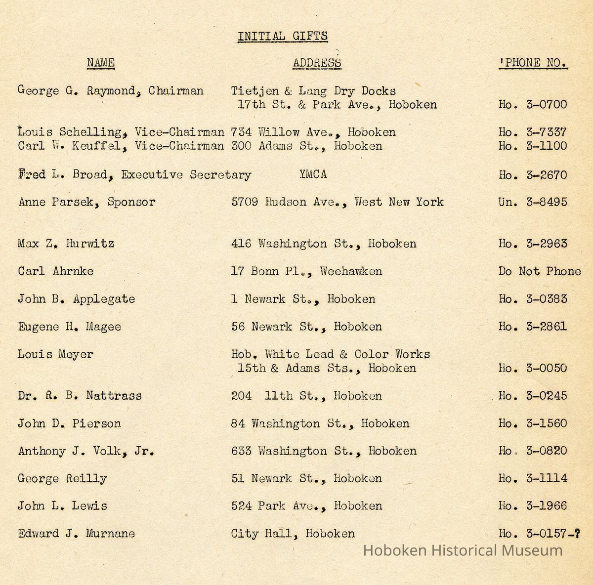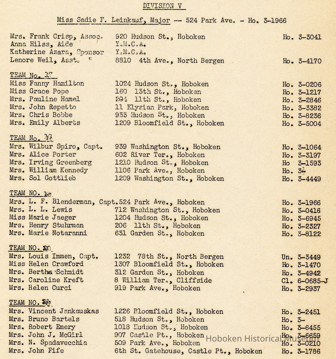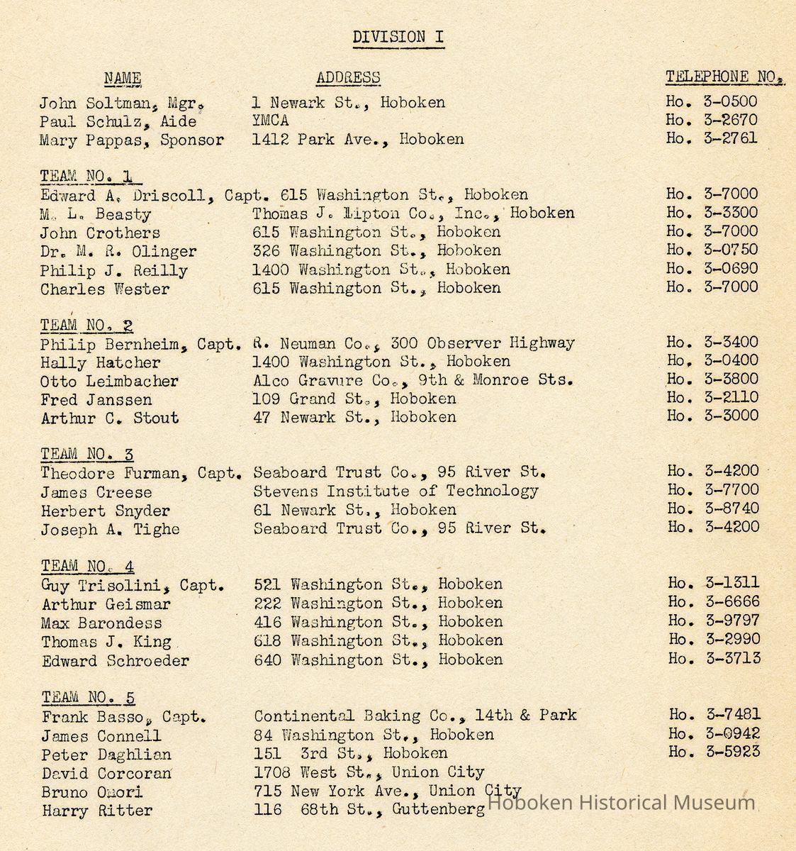 Notes: archives 2001.126.0084 Community Y.M.C.A. Campaign Organization, February 10th -18th, 1941. Max Z. Hurwitz, General Chairman. Fred L. Broad, Executive Secretary. INITIAL GIFTS NAME ADDRESS •PHONE NO. George G. Raymond, Chairman Tietjen & Lang Dry Docks 17th St. & Park Ave., Hoboken Ho. 3-0700 Louis Schelling Vice-Chairman 754 Willow Ave., Hoboken Carl W. Keuffel, Vice-Chairman 300 Adams St., Hoboken Ho. 3-7337 Ho. 3-1100 Fred L. Broad, Executive Secretary YMCA Ho. 3-2670 Anne Parsek, Sponsor 5709 Hudson Ave., West New York Un. 3-8495 Max Z. Hurwitz 416 Washington St., Hoboken Ho. 3-2963 Carl Ahrnke 17 Bonn Pl., Weehawken Do Not Phone John B, Applegate 1 Newark St., Hoboken Ho. 3-0383 Eugene H. Magee 56 Newark St., Hoboken Ho. 3-2861 Louis Meyer Hob, White Lead & Color Works 15th & Adams Sts., Hoboken Ho. 3-0050 Dr. R. B. Nattrass 204 11th St., Hoboken Ho. 3-0245 John D. Pierson 84 Washington St., Hoboken Ho. 3-1560 Anthony J. Volk, Jr. 653 Washington St., Hoboken Ho 3-0820 George Reilly 51 Newark St., Hoboken Ho. 3-1114 John L. Lewis 524 Park Ave., Hoboken Ho. 3-1966 Edward J. Murnane City Hall, Hoboken Ho. 3-0157-? ----- DIVISION I NAME ADDRESS TELEPHONE NO, John Soltman, Mgr. 1 Newark St., Hoboken Ho. 3-0500 Paul Schulz, Aide YMCA Ho. 3-2670 Mary Pappas, Sponsor 1412 Park Ave., Hoboken Ho. 3-2761 TEAM NOa 1 Edward A, Driscoll, Capt. 615 Washington St, Hoboken Ho. 3-7000 M„ L, Beasty Thomas J. Lipton Co., Inc. Hoboken Ho. 3-3300 John Crothers 615 Washington St„, Hoboken Ho. 3-7000 Dr. M, R. Olinger 326 Washington St., Hoboken Ho. 3-0750 Philip J. Reilly 1400 Washington St., Hoboken Ho. 3-0690 Charles Wester 615 Washington St., Hoboken Ho. 3-7000 TEAM NO, 2 Philip Bernheim, Capt. R. Neumann Co. 300 Observer Highway Ho. 3-3400 Hally Hatcher 1400 Washington St., Hoboken Ho. 3-0400 Otto Leimbacher Alco Gravure Co., 9th & Monroe Sts. Ho. 3-3800 Fred Janssen 109 Grand St,, Hoboken Ho. 3-2110 Arthur C. Stout 47 Newark St., Hoboken Ho. 3-3000 TEAM NO. 3 Theodore Furman, Capt, Seaboard Trust Co., 95 River St, Ho. 3-4200 James Creese Stevens Institute of Technology Ho. 3-7700 Herbert Snyder 61 Newark St., Hoboken Ho. 3-8740 Joseph A. Tighe Seaboard Trust Co., 95 River St. Ho. 3-4200 TEAM NOi 4 Guy Trisolini, Capt. 521 Washington St., Hoboken Ho. 3-1311 Arthur Geismar 222 Washington St., Hoboken Ho. 3-6666 Max Barondess 416 Washington St., Hoboken Ho. 3-9797 Thomas J. King 618 Washington St., Hoboken Ho. 3-2990 Edward Schroeder 640 Washington St., Hoboken Ho. 3-3713 TEAM NO. 5 Frank Basso„ Capt. Continental Baking Co., 14th & Park Ho. 3-7481 James Connell 84 Washington St., Hoboken Ho. 3-0942 Peter Daghlian 151 3rd St., Hoboken Ho. 3-5923 David Corcoran 1708 West St., Union City Bruno Omori 715 New York Ave., Union City Harry Ritter 116 68th St., Guttenberg ------- DIVISION II Franklin Verasco, Mgr. 204 Clinton St., Hoboken Ho. 3-5664 James T. Hatton, Aide Y.M.C.A. Ho. 3-2670 Mary Hausman, Sponsor Bethlehem Steel Co., Hoboken Ho. 3-2070 TEAM NO. 6 Charles R. Welti, Capt. 119 Lorraine Ave. Uppor Montclair Ve. 8-0890? William Wiebolt 1248 Garden St., Hoboken Ho. 3-7841 or Ho. 3-0756 N. J. Berardi 605 Willow Ave., Hoboken Ho. 3-1865 Wm. P. Burhorn 1 Newark St., Hoboken Ho. 3-2141 Albert Moeller 419 Washington St., Hoboken Ho. 3-3013 I. J. Pinero 32 Journal Square (I.J. Kislak Co.) Jo. 2-7100 Henry Troeger 302 Washington St,, Hoboken Ho. 3-3770 TEAM NO. 7 George G. Gunderson, Capt. Standard Brands, Inc., Hoboken Ho. 3-8614 E. J. Freedman Hinde-Dauche Paper Co., Hoboken Ho. 3-4400 George Schultz Shulton Corp. Inc., Lipton Bldg. Ho. 3-1447 C. C. Gates Maxwell House Div. -11th & Hudson Sts. Ho. 3-2991 TEAM NO.8 Dr. Wm. L. Yeaton, Capt. 204 11th St., Hoboken Ho. 3-2846 Louis Meyer 1501 Adams St., Hoboken Ho. 3-0050 Arthur Lankering Tietjen & Lang Dry Docks, Hoboken Ho. 3-0700 A. D. Levenson, Esq. 404 38th St., Union City Un. 3-6780 Bela Grulich 616 Washington St., Hoboken Ho. 3-0510 William Smith Stevens Inst. of Tech. Ho. 3-7700 TEAM NO. 9 A. E. Friedman, Capt. Metropolitan Life Ins. Co., Hoboken Ho. 3-1702 C. H. McQueen 91 Washington St., Hoboken Ho. 3-0729 Milton Meier 204 Washington St., Hoboken Ho. 3-5454 Edward Orenge 51 Newark St., Hoboken Ho. 3-7380 William Applegate 225 Washington St., Hoboken Ho. 3-0442 Vincent McDonnell 90 Bloomfield St., Hoboken Ho. 3-7302 TEAM NO. 10 Henry J. Wessling, Capt, Havens Savings & Loan Ass'n., Hoboken Ho. 3-7302 William J. Duffy 625 Washington St., Hoboken Ho. 3-0300 Patrick Bucino 40 Hudson St,, Hoboken Ho. 3-7900 Adolph B. Classen Dykes Lumber Co., 702 Clinton St. Ho. 3-7410 George Laiken 52,6 Washington St., Hoboken Ho. 3-0291 Walter Geismar 222 Washington St., Hoboken Ho. 3-6666 ------ DIVISION III Arthur Scheffler, Mgr. Meyers' Hotel, Hoboken Ho. 3-1729 A. J. Mohr, Aide YMCA Anne Pappas, Sponsor American Home Products Co, 1 Pleasant Ave., Passaic Pa. 2-6900 Elsie Petersen, Ass't. TEAM NO. 11 Charles Gratz, Capt. 1000 Washington St., Hoboken Ho. 3-9820 Dr. L. Ghasin 322 Washington St., Hoboken Ho. 3-2.648 Arthur McDonald William Ferber Keuffel & Esser Co., Hoboken Ho. 3-1100 J. Henry O'Brien 68 Hudson St., Hoboken Ho. 3-5656 TEAM NO. 12 Andrew Scherer, Capt. 722 Bloomfield St., Hoboken Ho. 3-7134 Rev. John G. Bott St. Paul Church, 8th & Hudson Sts. Ho. 3-7134 TEAM NO. 15 Clarence G. Meeks, Jr., Capt. 51 Newark St., Hoboken Ho. 3-6969 Emil Merz Tietjen & Lang Dry Docks, Hoboken Ho. 3-0700 Wallace Marnell 37 Newark St., Hoboken Ho. 3-1296 Caesar Muzzi 104 Jefferson St., Hoboken Ho. 3-2267 James J. Cullen 121 Garden St., Hoboken Ho. 3-7800 Edward Rathjen 1000 Bloomfield St., Hoboken Ho. 3-1129 TEAM NO. 14 Harry E.S. Wilson, Capt. 68 Hudson St., Hoboken Ho. 3-1576 James Firmin 312 12th St., Hoboken Ralph Spadavecchia 509 Park Ave., Hoboken Ho. 3-0210 Nathan J. Dix 524 Washington St., Hoboken Ho. 3-1234 Chas. H. O'Neal Hob. Post #107-American Legion Ho. 3-0299 TEAM NO. 15 John J. Kuehns, Capt. 1215 Washington St., Hoboken Ho. 3-7023 John J. McGirl 1 N