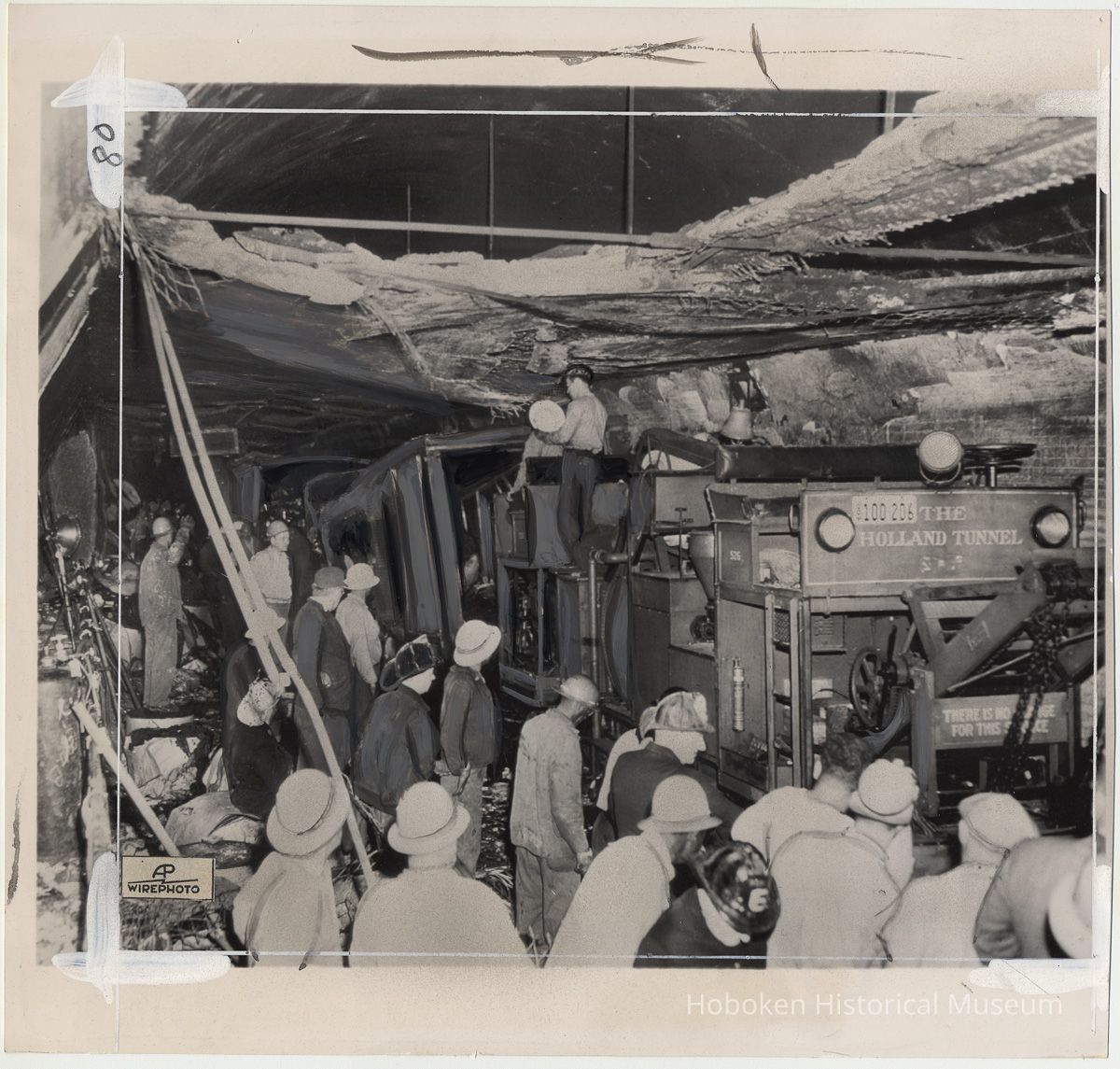 Caption: A towing vehicle is used to move one of the trucks trapped in Holland Tunnel after blasts.