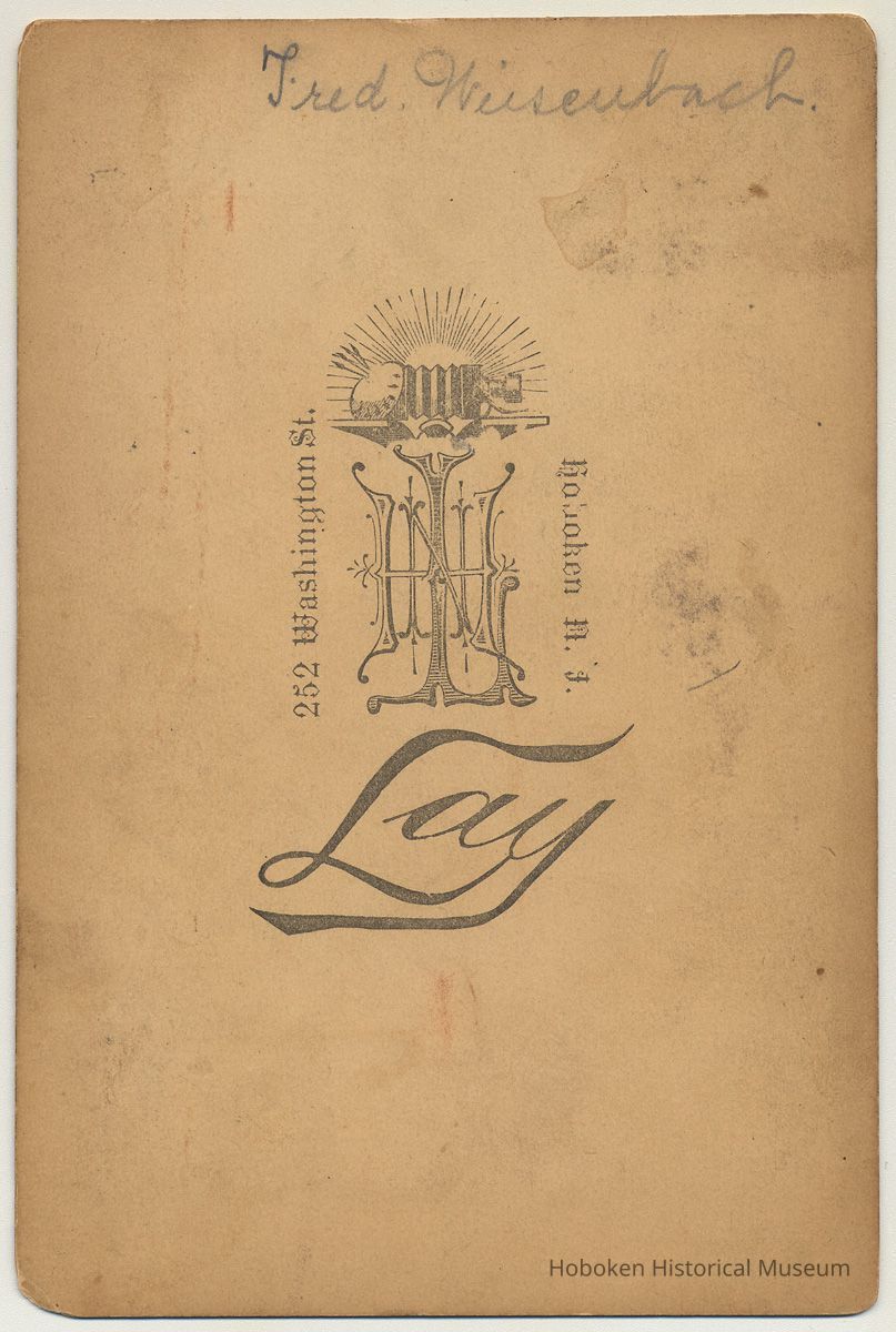 4" x 6" mount. Photograph taken by Lay, 252 Washington St. (old number; modern 628), Hoboken. Mount imprinted on front in bottom margin: Lay Hoboken. Reverse has larger photographer's imprint with address plus penciled identification at top: Fred. Weisenbach.