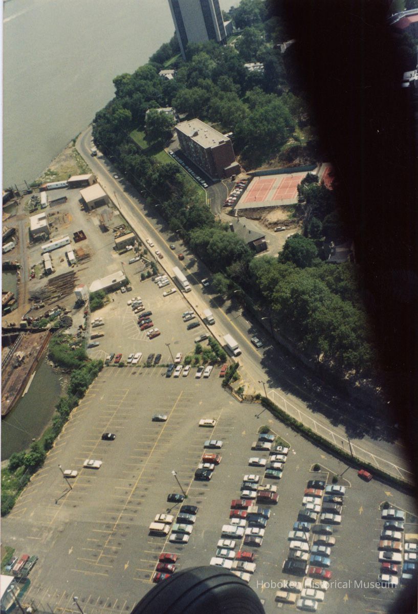 Photo 2: a view south over a parking lot (bottom) of the Maxwell House Coffee plant; Union Dry Dock is at center left; Stevens campus to the right and top plus the southeast corner of Elysian Park. River Road.