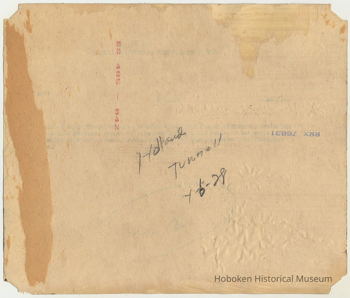 Masked and trimmed print, 8-1/2" wide x 7-1/4" high. Photographer not indicated. Reverse has penciled note: Holland Tunnell [sic] 4-6-28. Paper mounted on back with remains of other attachments.