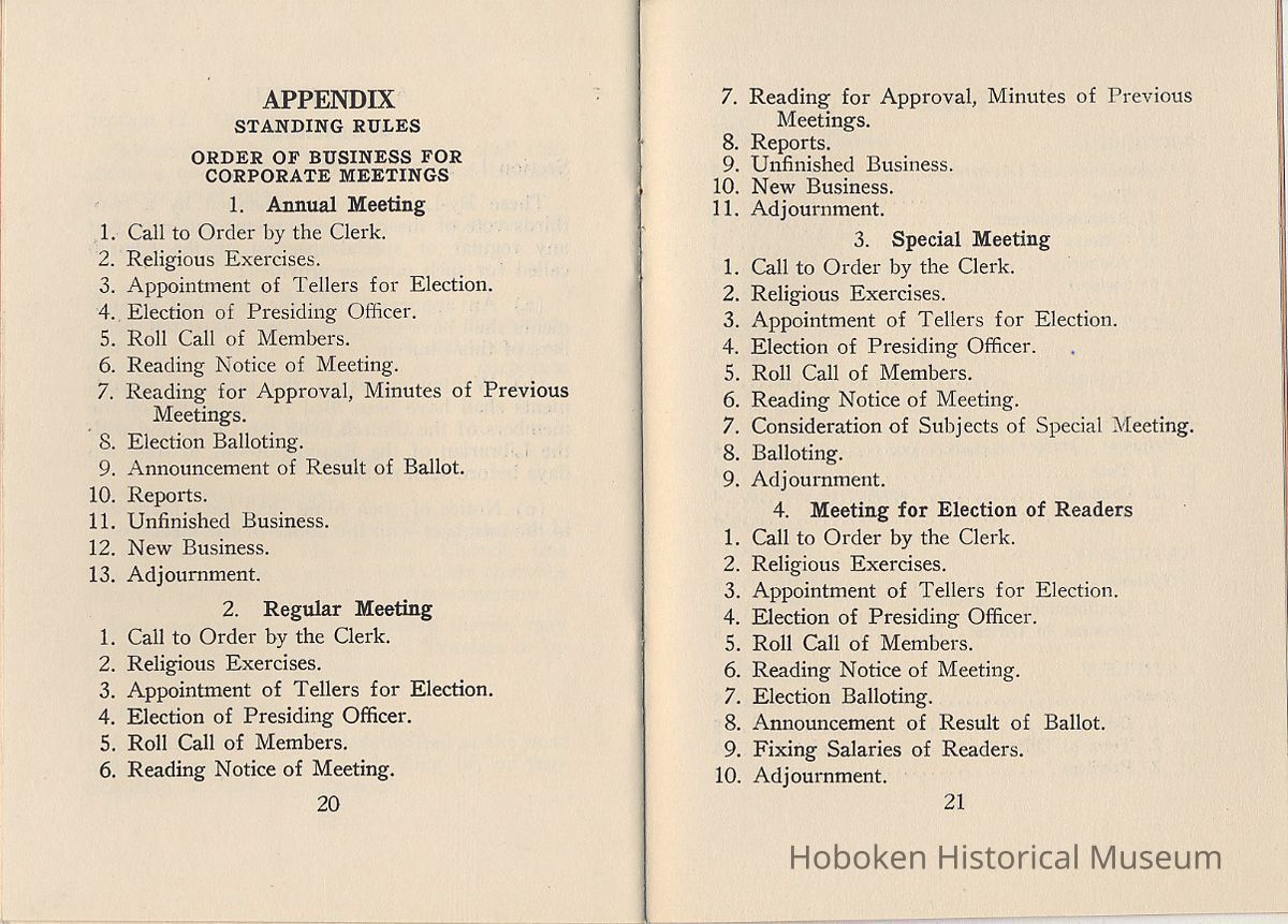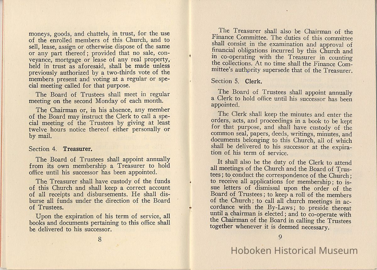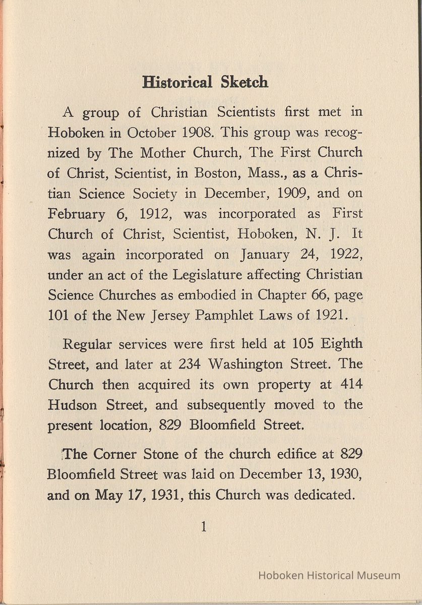 Legal Status: Abandoned records found on site of former church. The Church apparently ceased operations here ca. 2005 (latest dates found on utility bills.) Building was sold in 2010 or 2011 to real estate developer; demolition June 2011 commenced on interior for conversion to residential building. Notes: 2011.036.0102 By-Laws of First Church of Christ, Scientist of Hoboken, N.J., No date, issued at least after May 1931 and probably up to 1960s. Text from page 1: Historical Sketch A group of Christian Scientists first met inHoboken in October 1908. This group was recognized by The Mother Church, The First Church of Christ, Scientist, in Boston, Mass., as a Christian Science Society in December, 1909, and on February 6, 1912, was incorporated as First Church of Christ, Scientist, Hoboken, N. J. It was again incorporated on January 24, 1922, under an act of the Legislature affecting Christian Science Churches as embodied in Chapter 66, page 101 of the New Jersey Pamphlet Laws of 1921. Regular services were first held at 105 Eighth Street, and later at 234 Washington Street. The Church then acquired its own property at 414 Hudson Street, and subsequently moved to the present location, 829 Bloomfield Street. The Corner Stone of the church edifice at 829 Bloomfield Street was laid on December 13, 1930, and on May 17, 1931, this Church was dedicated. [end] Status: OK Status By: dw Status Date: 2011-06-22