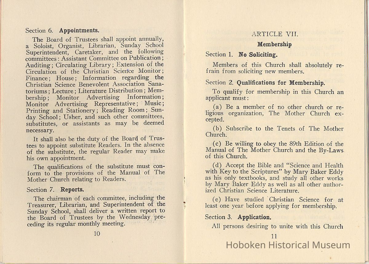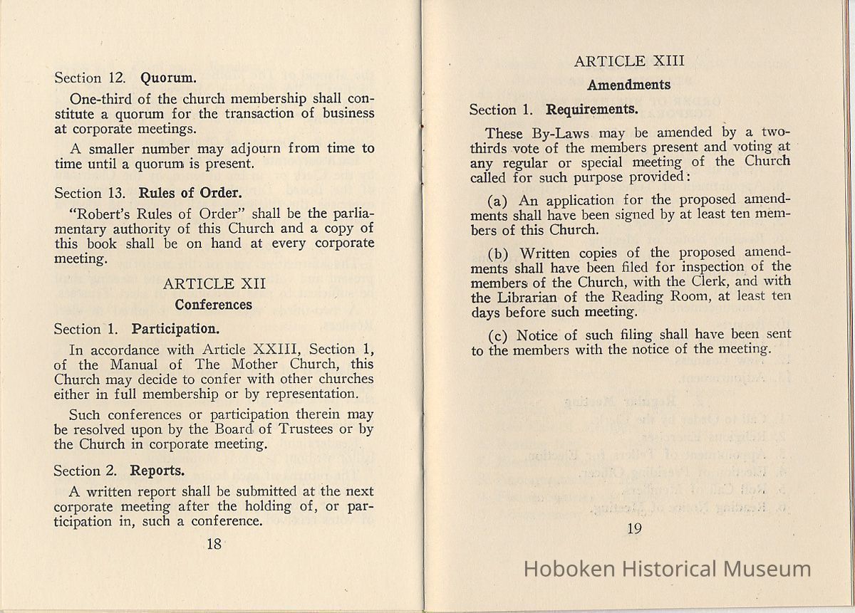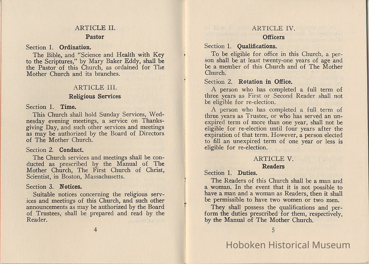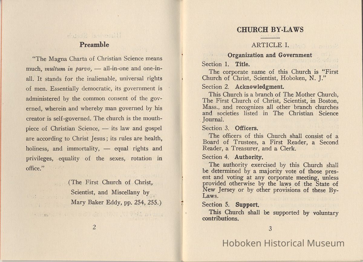 By-Laws of First Church of Christ, Scientist of Hoboken, N.J., n.d., ca. 1931-1960.