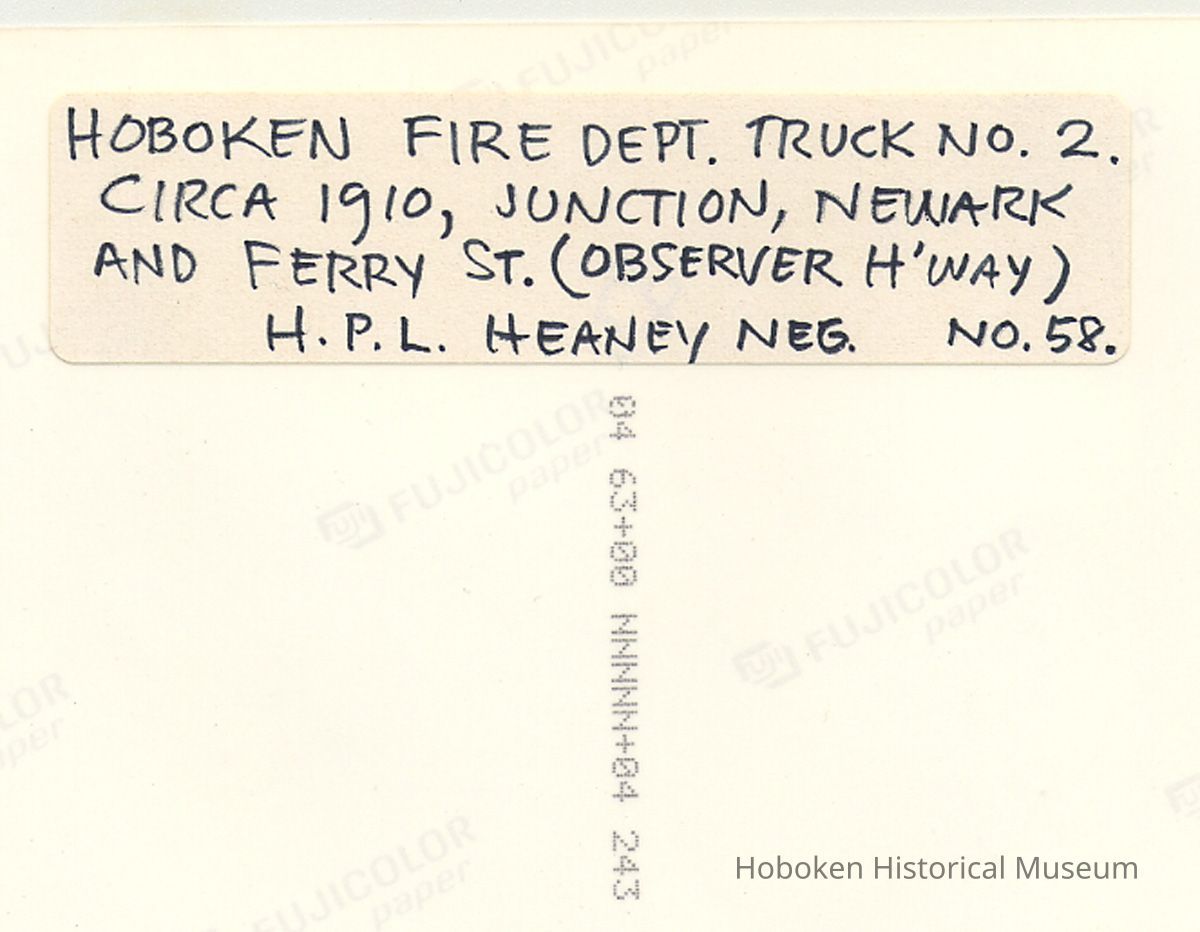 Label text: Hoboken Fire Dept. Truck No. 2 circa 1910, Junction, Newark and Ferry St. (Observer H'way) H.P.L. [Hoboken Public Library] Heaney Neg. No. 58.