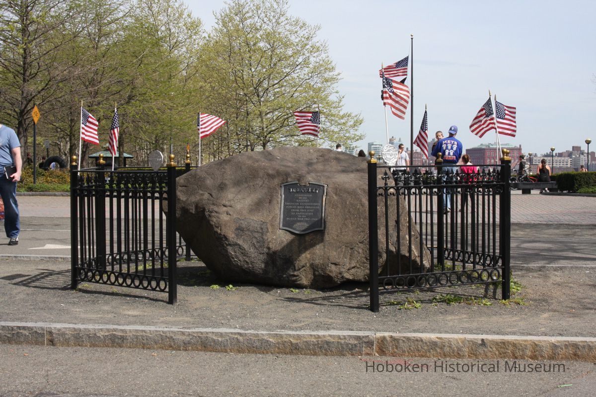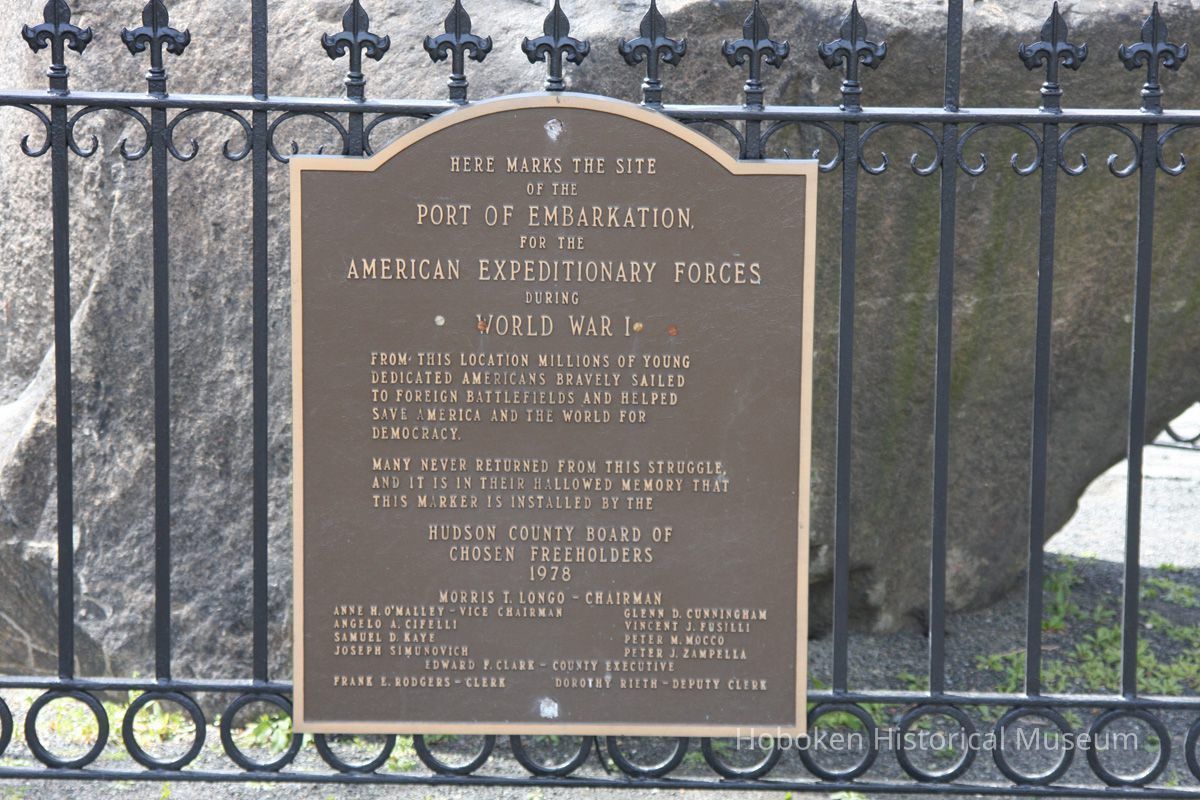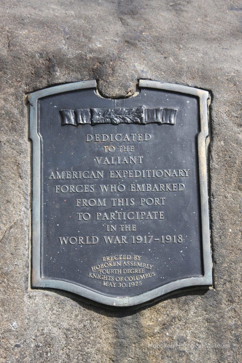 Officially known as World War One Memorial Tablet. Original location was Pier 4 near River Street (circa Fourth St.) It was located on River St. near Pier B, between 2nd and 3rd Sts. in 1976. It was moved to its present location ca. 2002-2003 with the completion of the Hudson River Waterfront Walkway in this area.