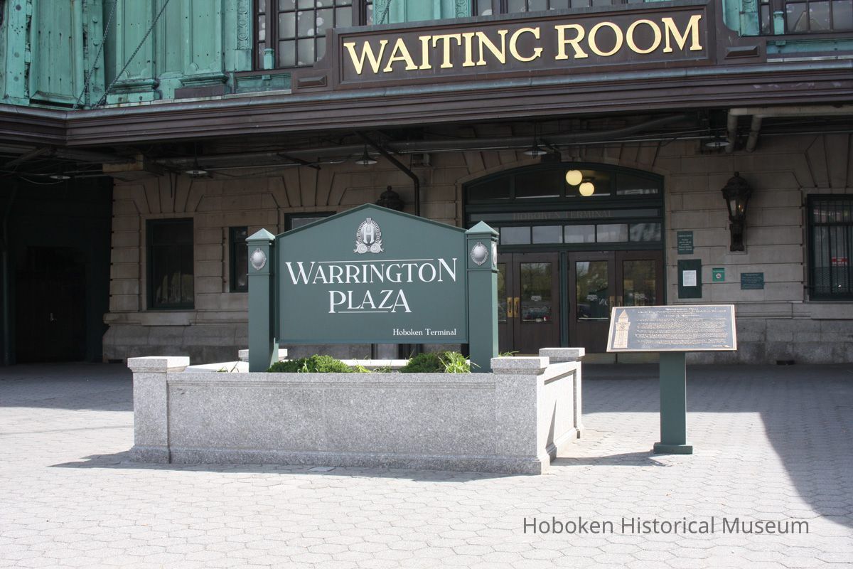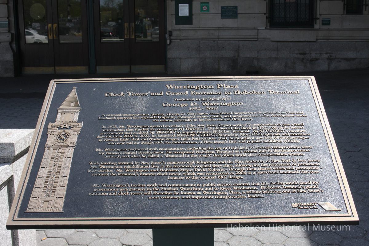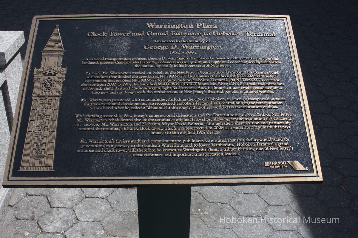 Notes: Text on bronze plaque reads: Warrington Plaza Clock Tower and Grand Entrance to Hoboken Terminal Dedicated to the Memory of George D. Warrington 1952-2007 A national transportation pioneer, George D. Warrington championed innovative transportation services and landmark projects that expanded capacity, enhanced service quality and supported economic development across the nation, especially in his home state of New Jersey. In 1975, Mr. Warrington worked on behalf of the New Jersey Department of Transportation to pass a bond referendum that funded the creation of NJ TRANSIT. He delivered the check for $322,000 to the federal government that enabled NJ TRANSIT to acquire historic Hoboken Terminal. As NJ TRANSIT's executive director from 2002 to 2007, he launched MidTOWN DIRECT - Montclair, River LINE light rail, and extensions of Newark Light Rail and Hudson-Bergen Light Rail services. And, he brought a new level of customer input into new rail car design with the introduction of New Jersey's first and popular multilevel vehicles. Mr. Warrington partnered with communities, including the city of Hoboken, to leverage transportation assets for transit-oriented development. He recognized Hoboken Terminal as a central hub in the transportation network and what he called a "diamond in the rough" that offers world class transportation options. With funding secured by New Jersey's congressional delegation and the Port Authority of New York & New Jersey, Mr. Warrington rehabilitated five of the terminal's original ferry slips, allowing for the restoration of permanent ferry service. Mr. Warrington and Hoboken Mayor David Roberts - through their shared vision and partnership - restored the terminal's historic clock tower, which was resurrected in 2008 as a waterfront landmark that pays homage to the original 1907 design. Mr. Warrington's tireless work and commitment to public service ensured that this facility would stand for generations as a gateway to the Hudson Waterfront and to lower Manhattan. Hoboken Terminal's grand entrance and clock tower will therefore be known as Warrington Plaza, a tribute befitting one of New Jersey's most visionary and important transportation leaders. NJ TRANSIT The Way To Go Original or Copy: Digital copy Status: OK Status By: dw Status Date: 2012-04-17