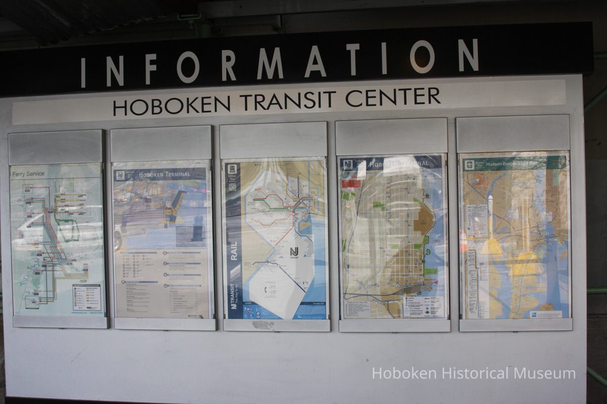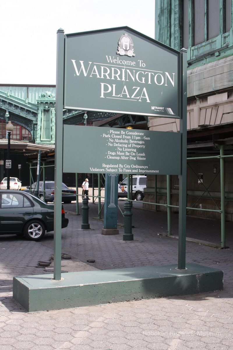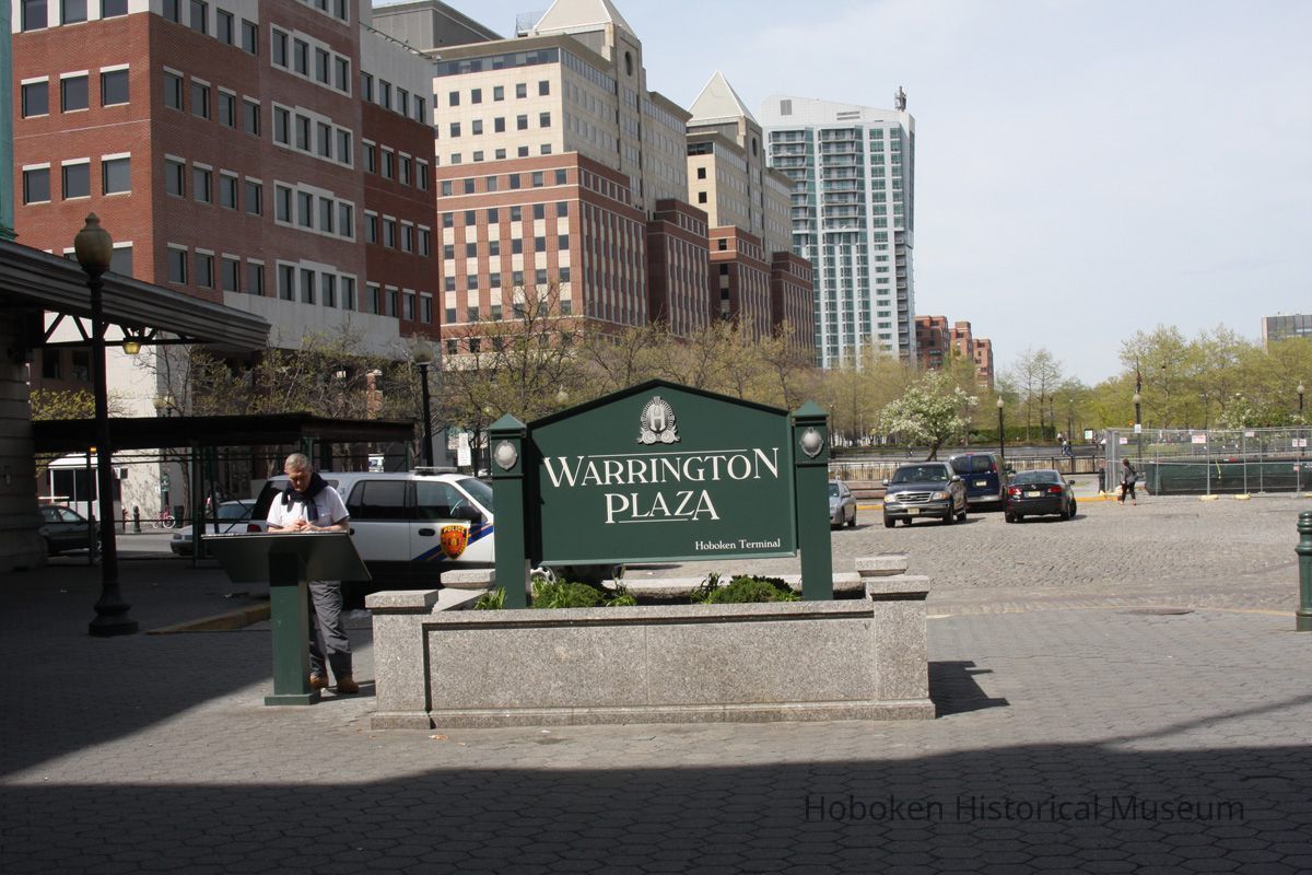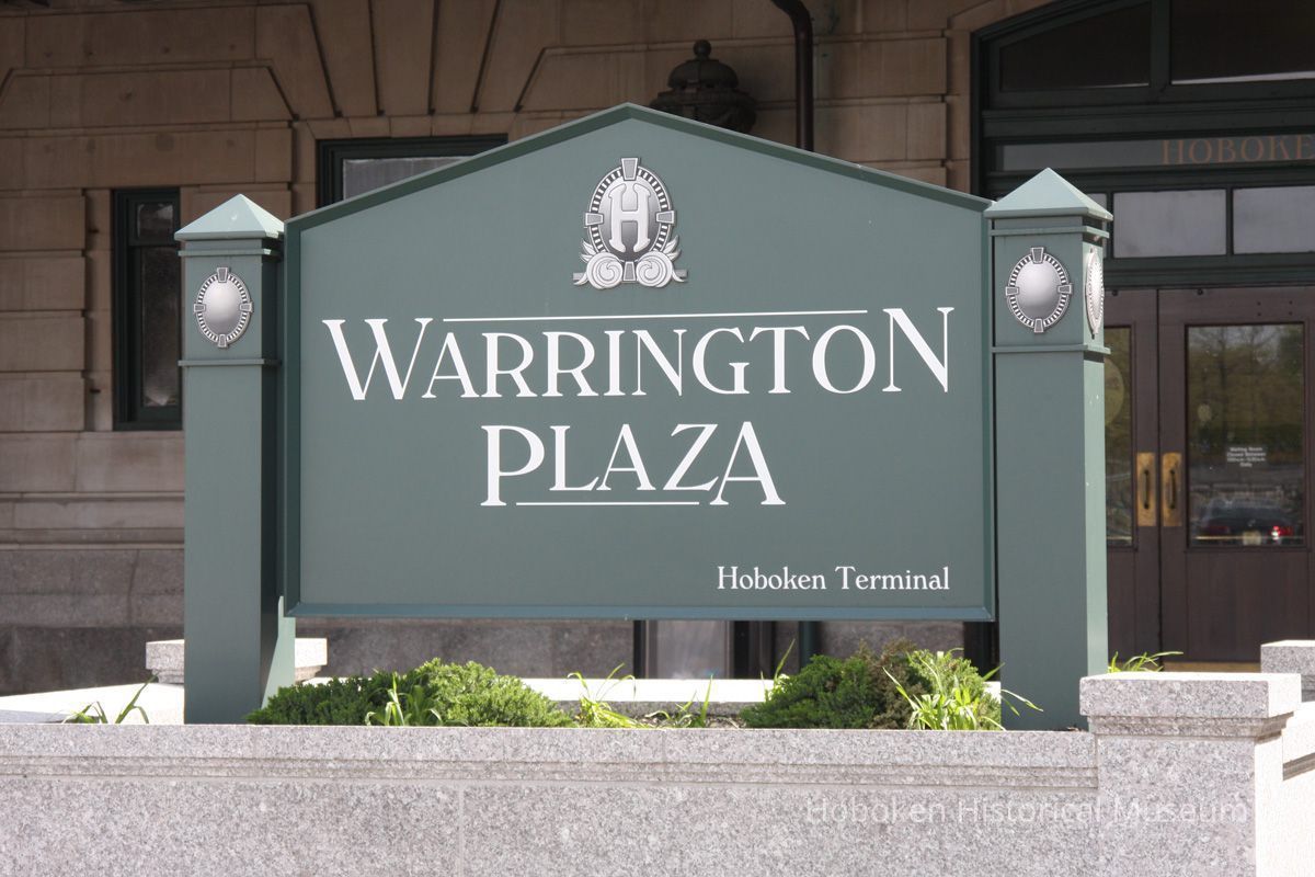 Notes: Text on bronze plaque reads: Warrington Plaza Clock Tower and Grand Entrance to Hoboken Terminal Dedicated to the Memory of George D. Warrington 1952-2007 A national transportation pioneer, George D. Warrington championed innovative transportation services and landmark projects that expanded capacity, enhanced service quality and supported economic development across the nation, especially in his home state of New Jersey. In 1975, Mr. Warrington worked on behalf of the New Jersey Department of Transportation to pass a bond referendum that funded the creation of NJ TRANSIT. He delivered the check for $322,000 to the federal government that enabled NJ TRANSIT to acquire historic Hoboken Terminal. As NJ TRANSIT's executive director from 2002 to 2007, he launched MidTOWN DIRECT - Montclair, River LINE light rail, and extensions of Newark Light Rail and Hudson-Bergen Light Rail services. And, he brought a new level of customer input into new rail car design with the introduction of New Jersey's first and popular multilevel vehicles. Mr. Warrington partnered with communities, including the city of Hoboken, to leverage transportation assets for transit-oriented development. He recognized Hoboken Terminal as a central hub in the transportation network and what he called a "diamond in the rough" that offers world class transportation options. With funding secured by New Jersey's congressional delegation and the Port Authority of New York & New Jersey, Mr. Warrington rehabilitated five of the terminal's original ferry slips, allowing for the restoration of permanent ferry service. Mr. Warrington and Hoboken Mayor David Roberts - through their shared vision and partnership - restored the terminal's historic clock tower, which was resurrected in 2008 as a waterfront landmark that pays homage to the original 1907 design. Mr. Warrington's tireless work and commitment to public service ensured that this facility would stand for generations as a gateway to the Hudson Waterfront and to lower Manhattan. Hoboken Terminal's grand entrance and clock tower will therefore be known as Warrington Plaza, a tribute befitting one of New Jersey's most visionary and important transportation leaders. NJ TRANSIT The Way To Go Original or Copy: Digital copy Status: OK Status By: dw Status Date: 2012-04-17