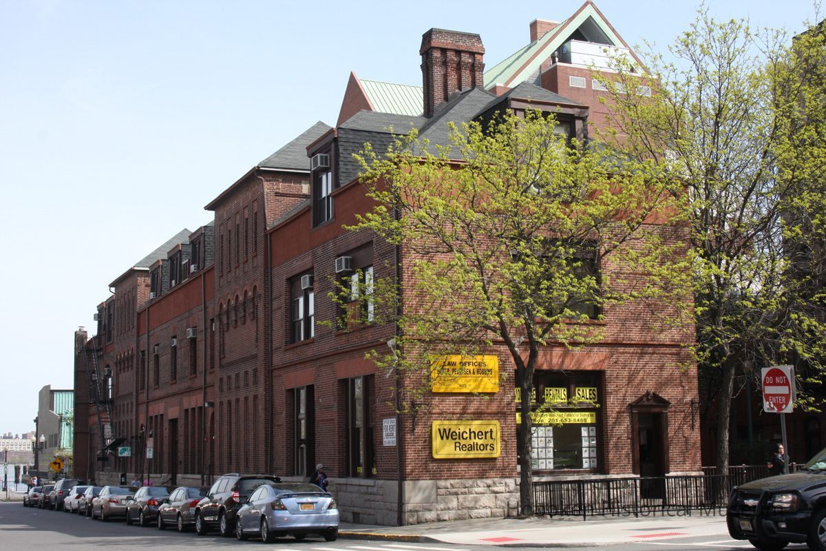 Two views of the north (Newark St.) + west facades (River Street) Hoboken Land Building looking southeast down Newark Street; note at the left background the end of the ferry portion of Hoboken Terminal; Baker Waterfront Plaza building is in the right background.