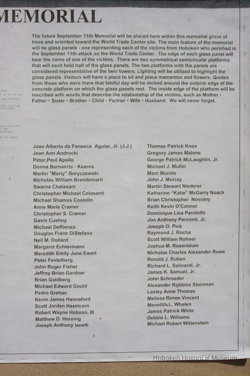 Color photographs, three, of City of Hoboken 9/11 Memorial sign board, northwest corner of Pier A Park, north of fountain and just east of Waterfront Walkway, Hoboken, April 14, 2012.